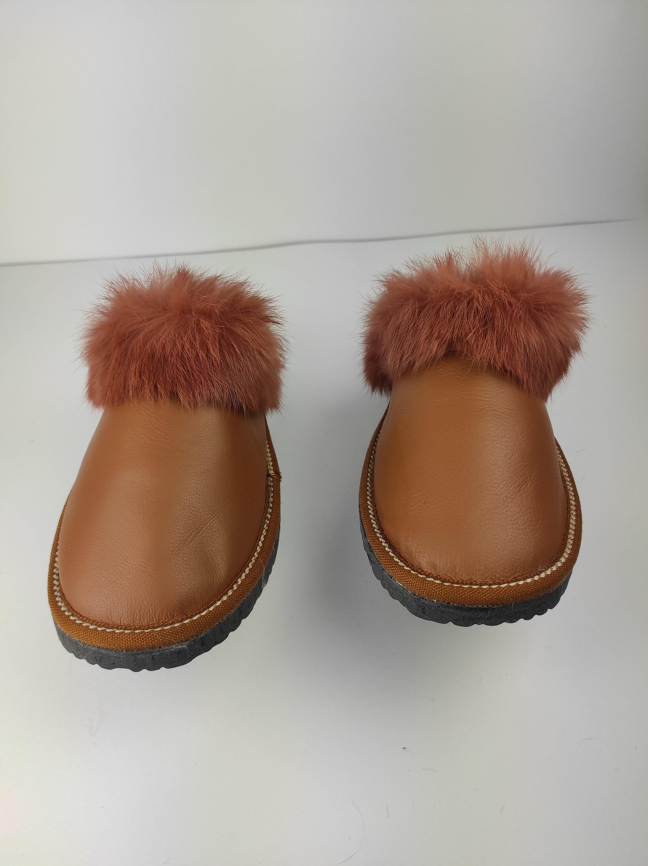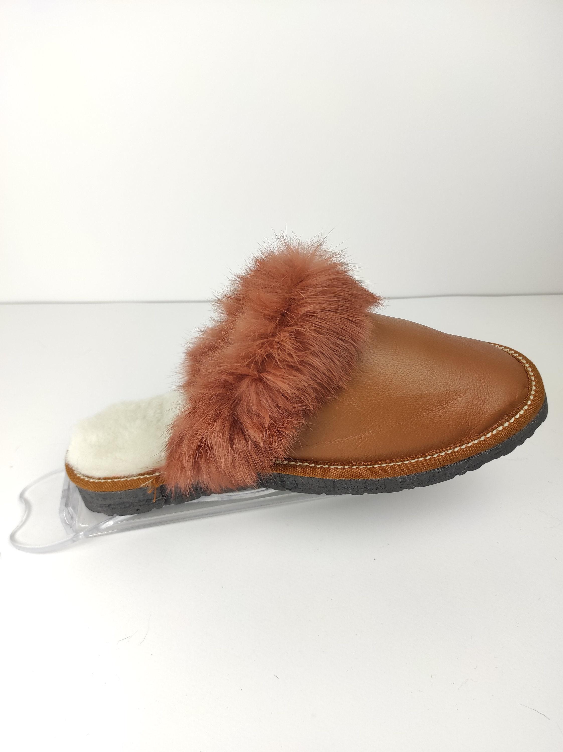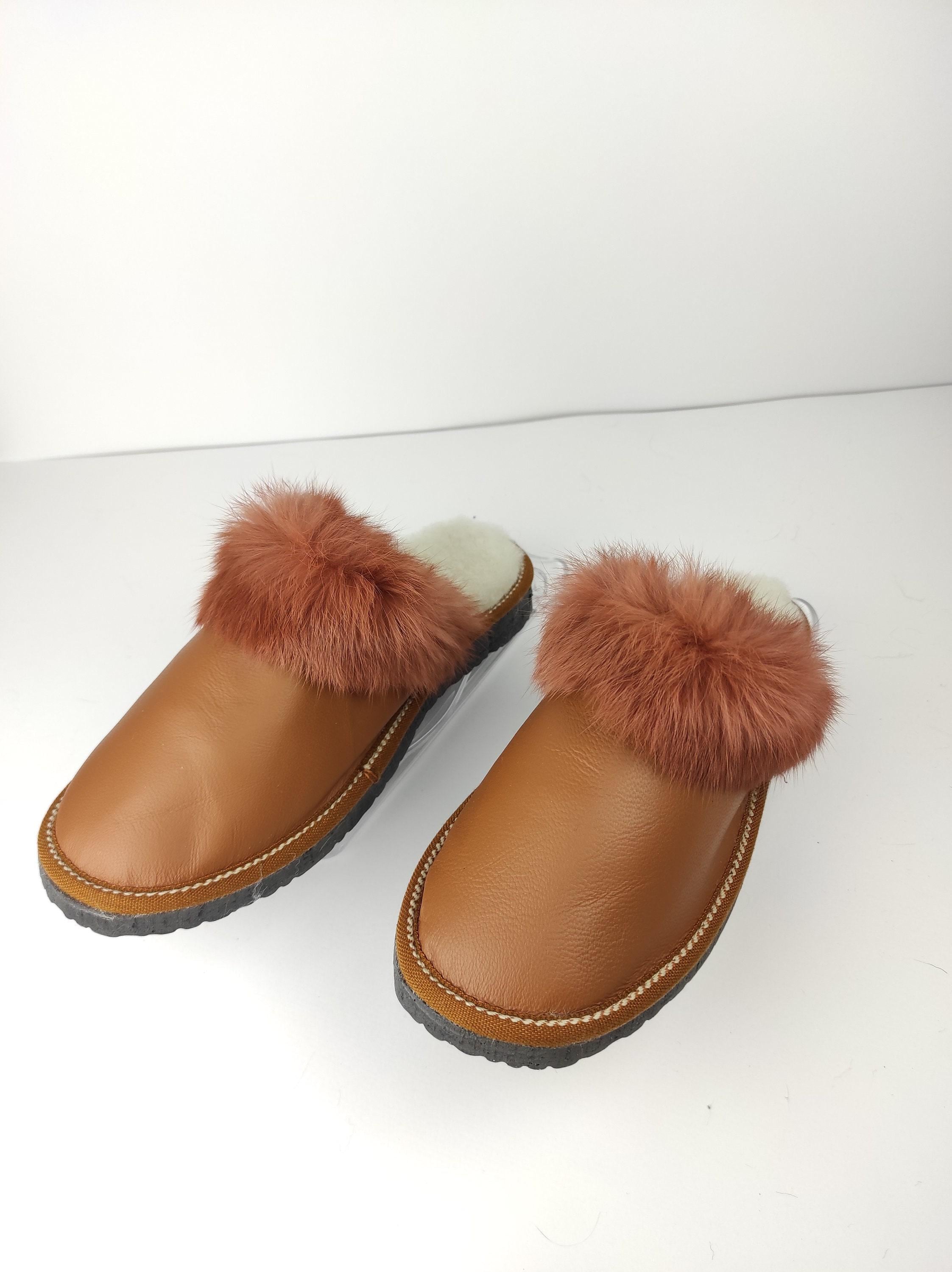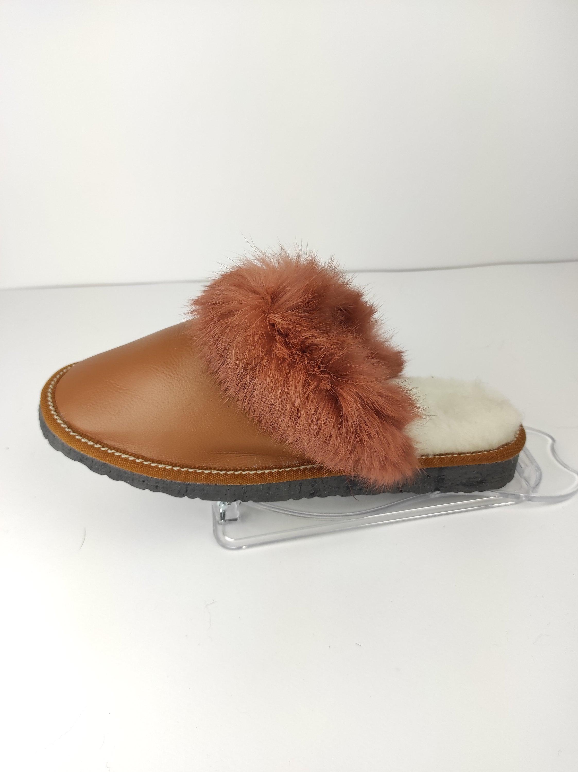 Fur Sheepskin Leather Slippers Brown for Women • Cozy Warm House Wool Slippers • Handmade genuine leather slippers