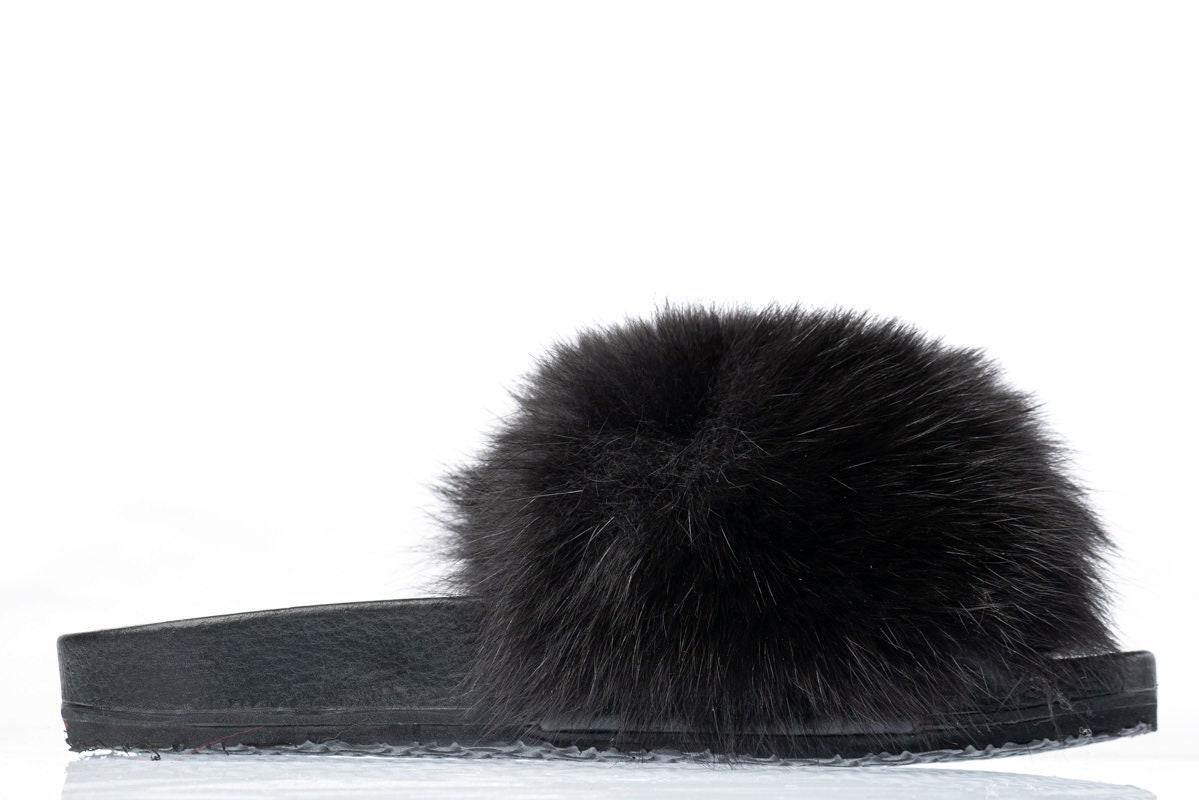 [1x Pair of Original Fox Fur Black Fuzzy Slides]