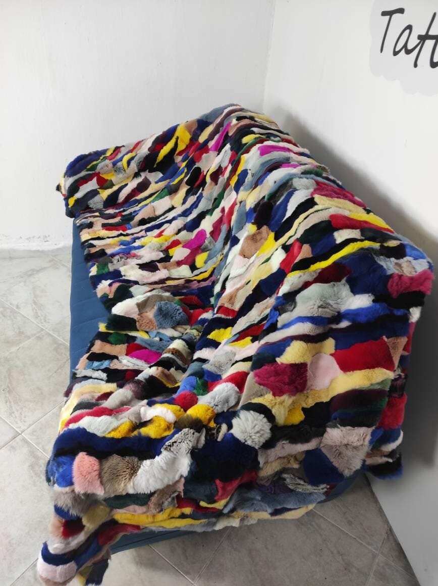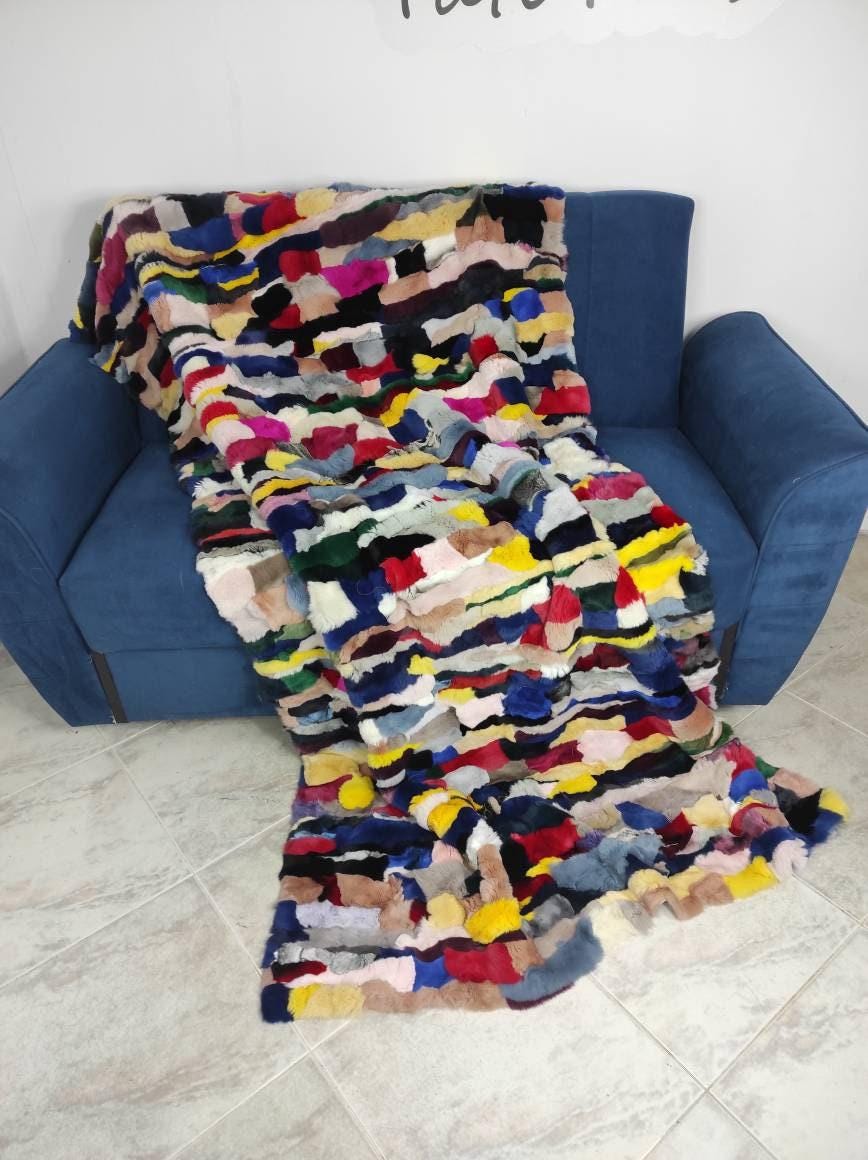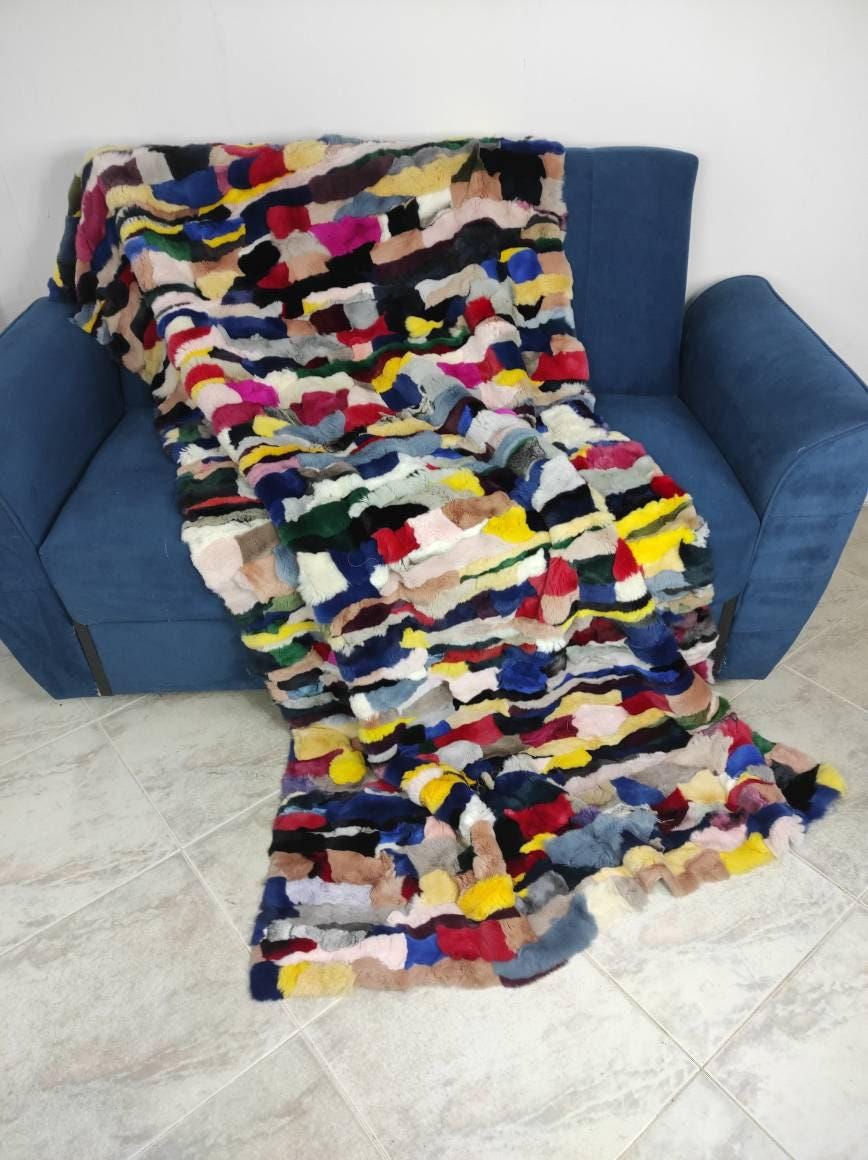 Real Colorful Rex Rabbit Fur Blanket Throw • Personalized Housewarming Gift Sofa Cover n Bedspread • Handmade Genuine Fur