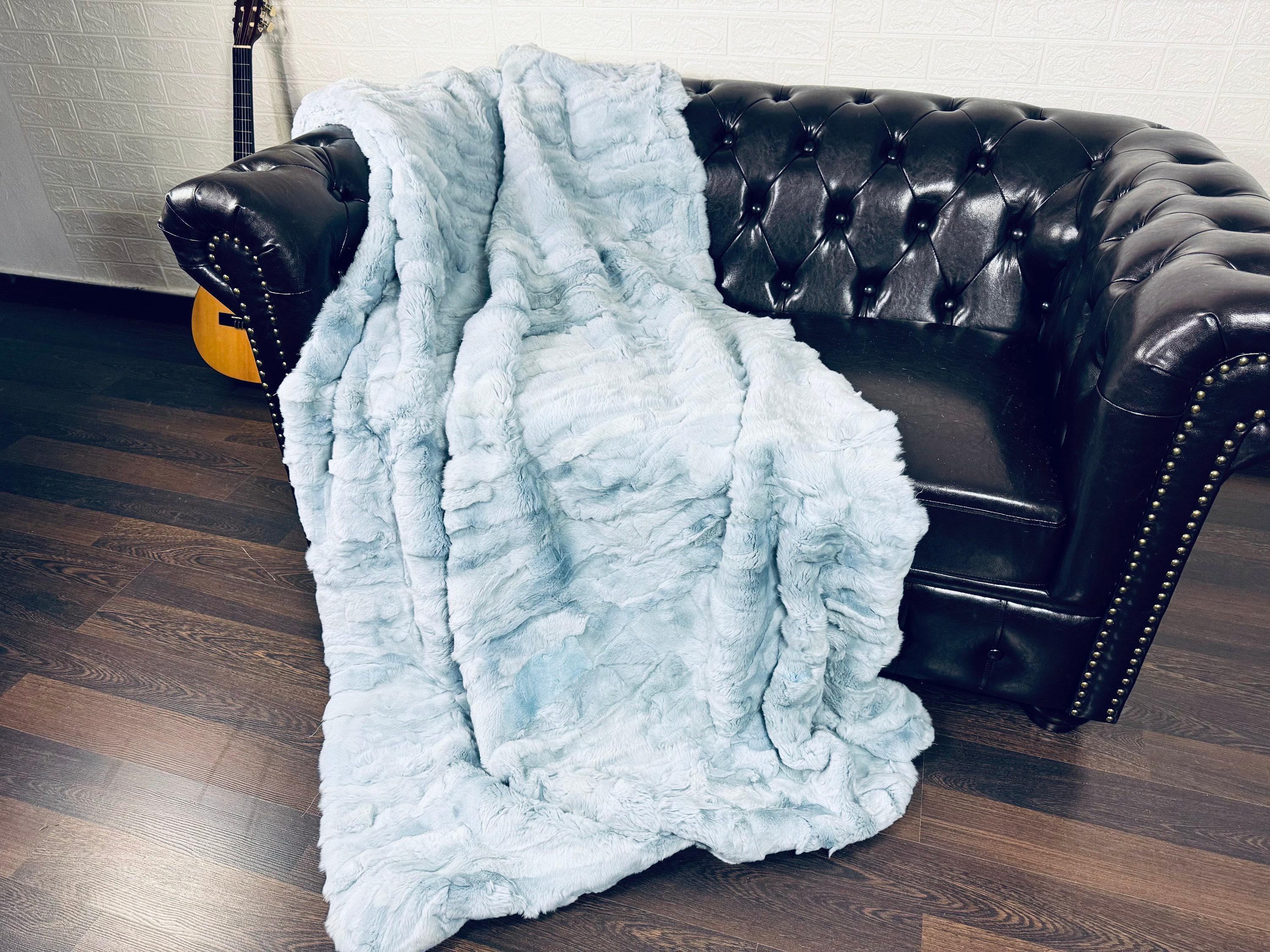 Handmade Real Light Blue Rex Rabbit Fur Blanket that can be used as a throw as well. Perfect for Bedspread or Sofa Cover.