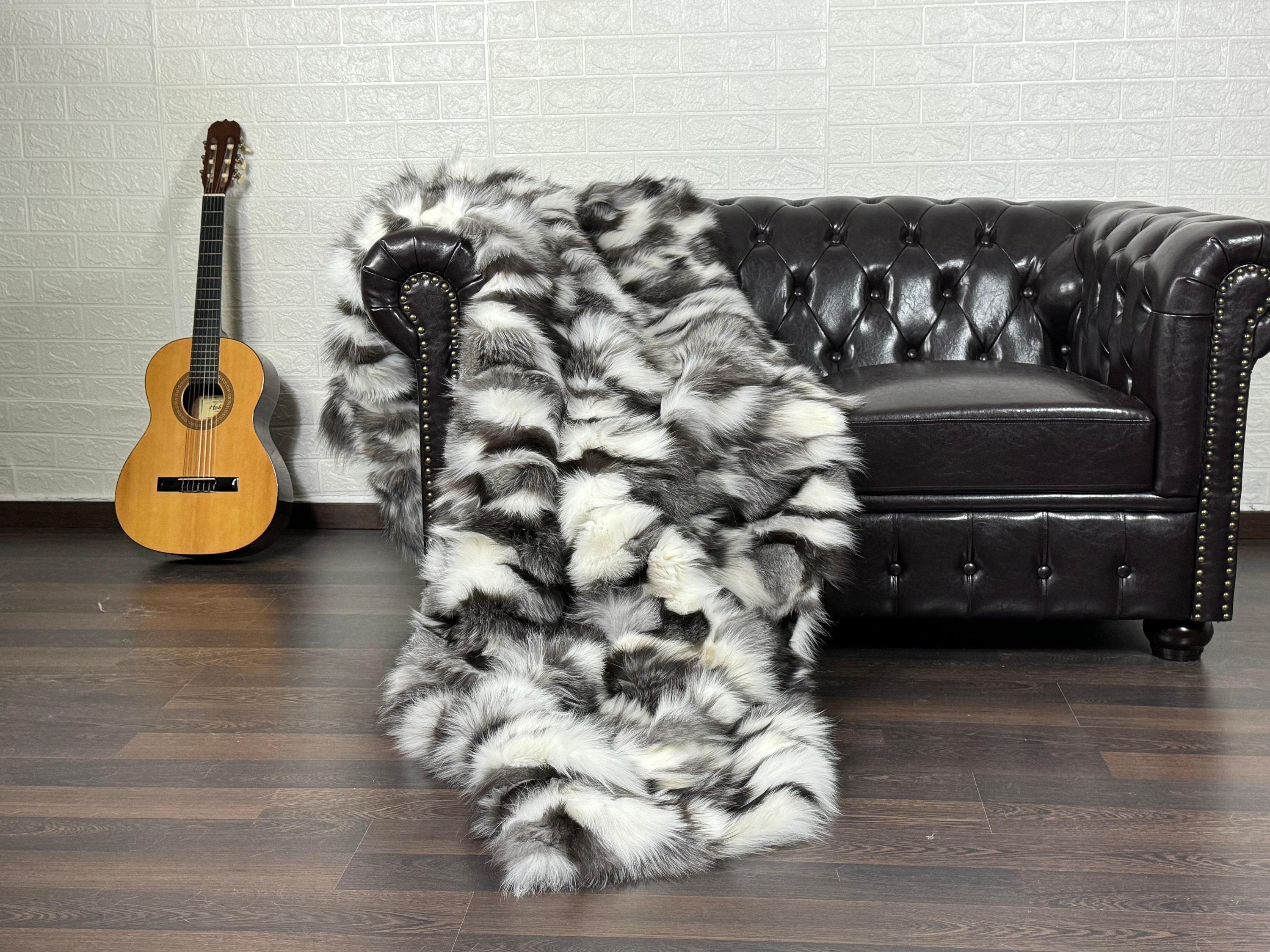Handmade Fox Fur Throw Blanket Black & White that can be used as a throw as well. Perfect for Bedspread or Sofa Cover.