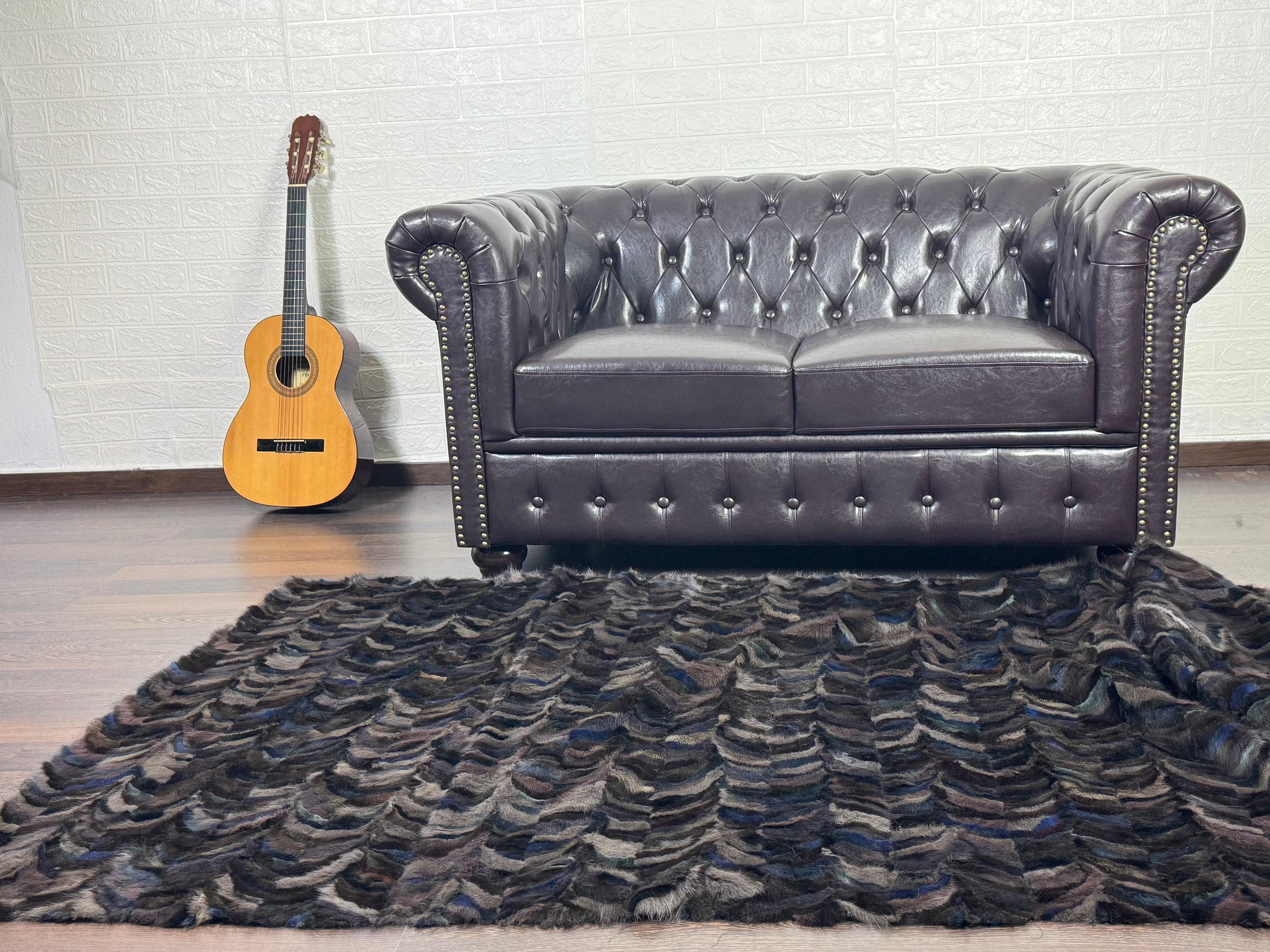 Handmade Mink Fur Throw Blanket Brown Black with blue details that can be used as a throw as well. Perfect for Bedspread or Sofa Cover.