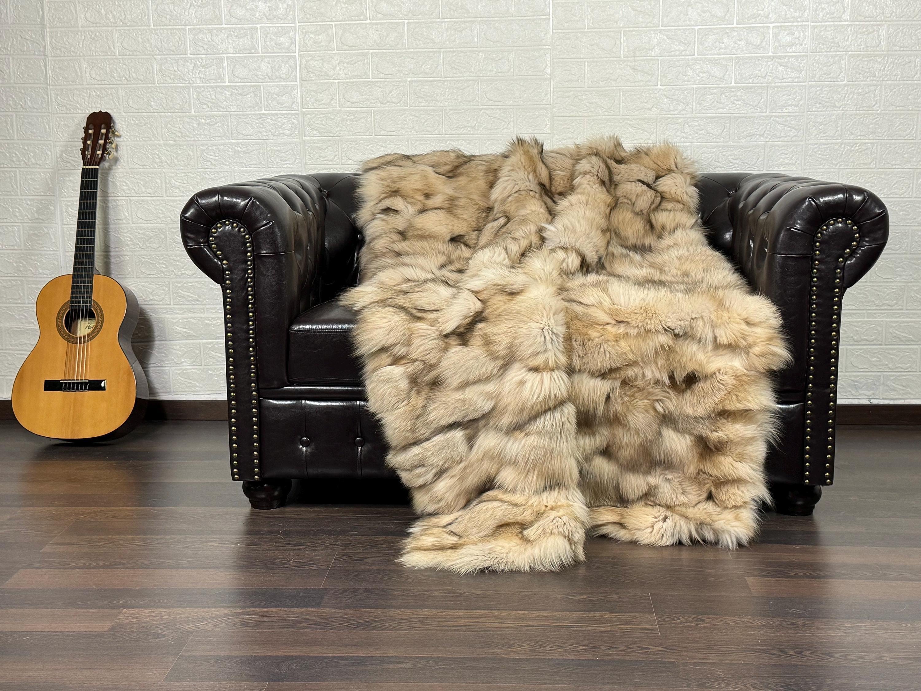 Handmade Real Beige Fox Fur Throw Blanket that can be used as a throw as well. Perfect for Bedspread or Sofa Cover.