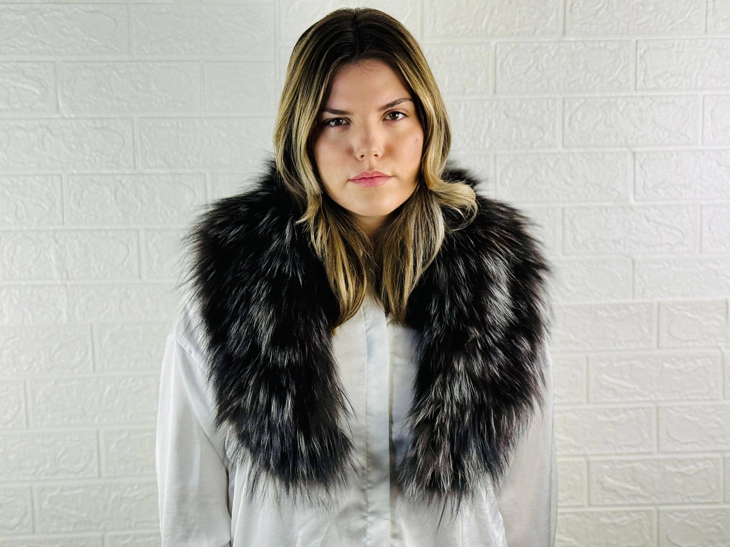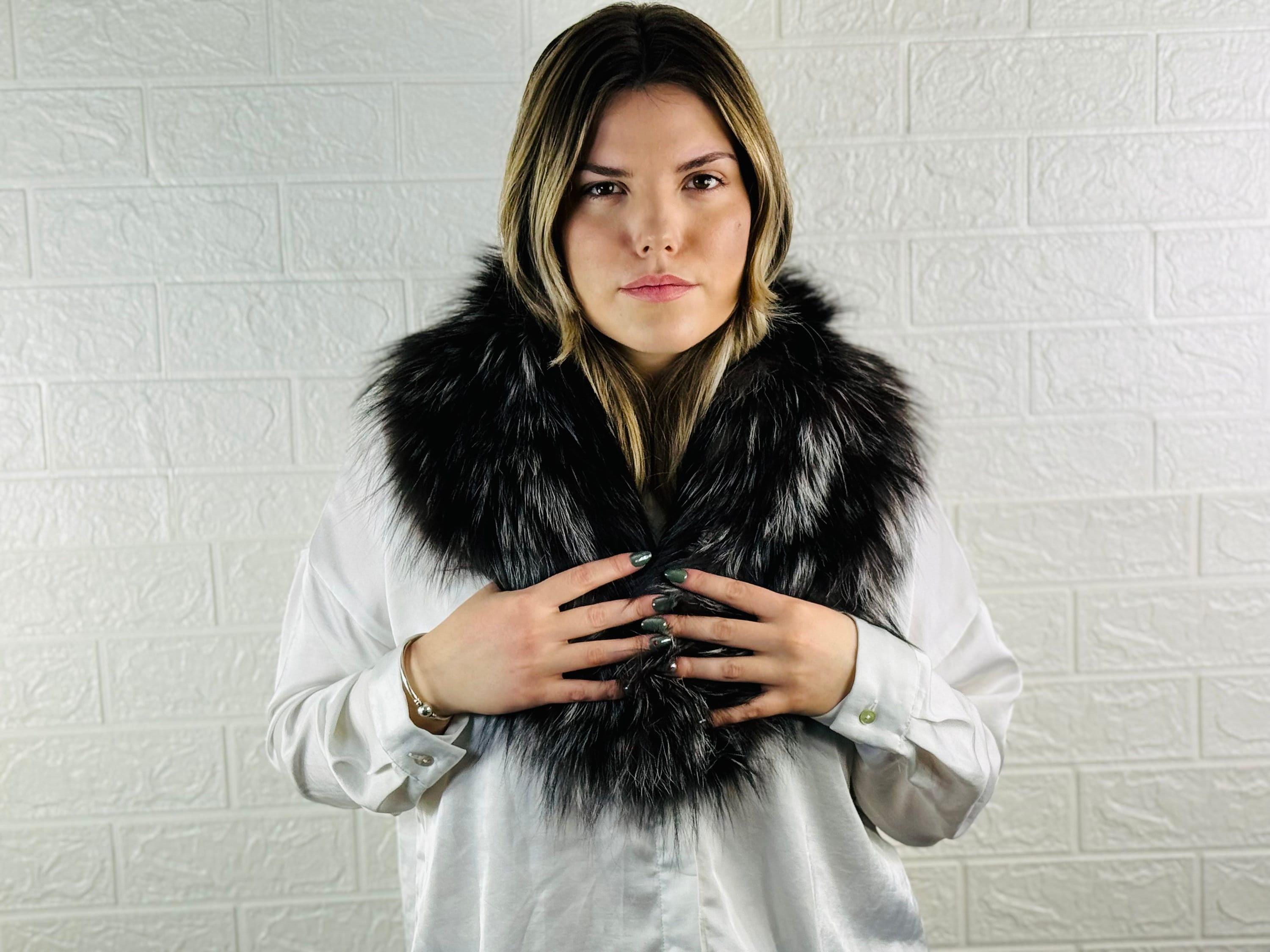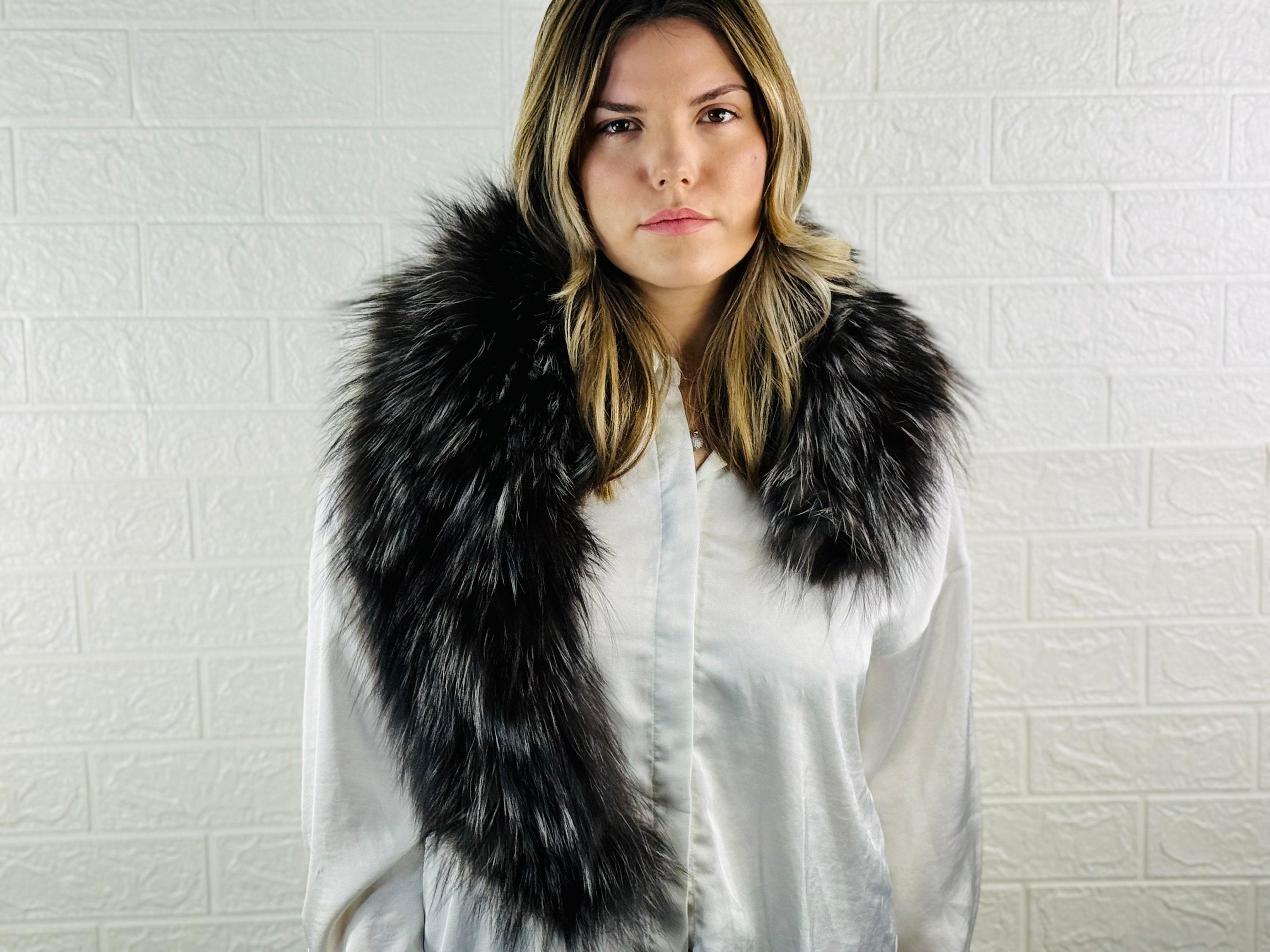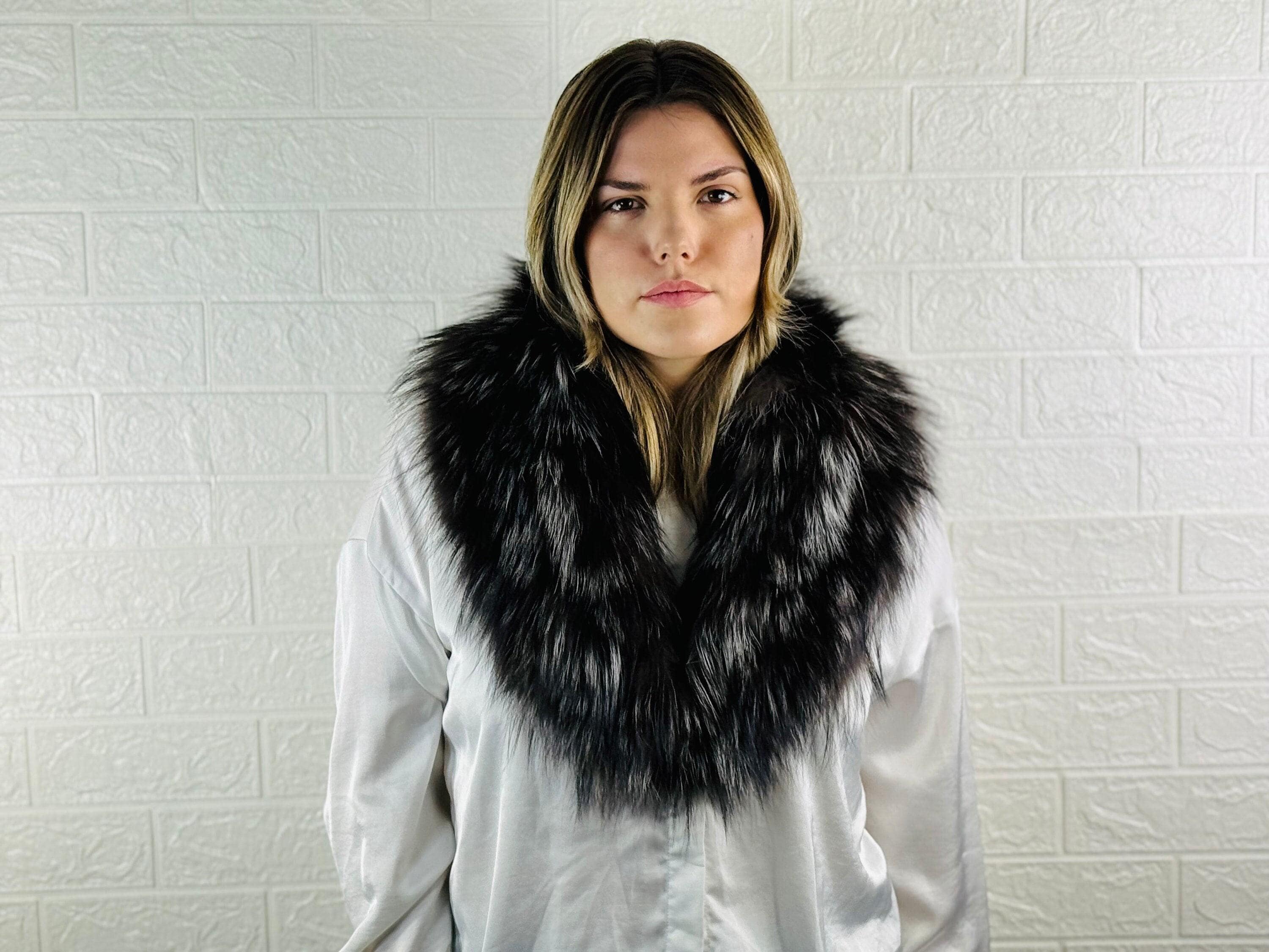 Searching for a statement accessory that will stand out? This silver and black fox fur collar scarf is for YOU.