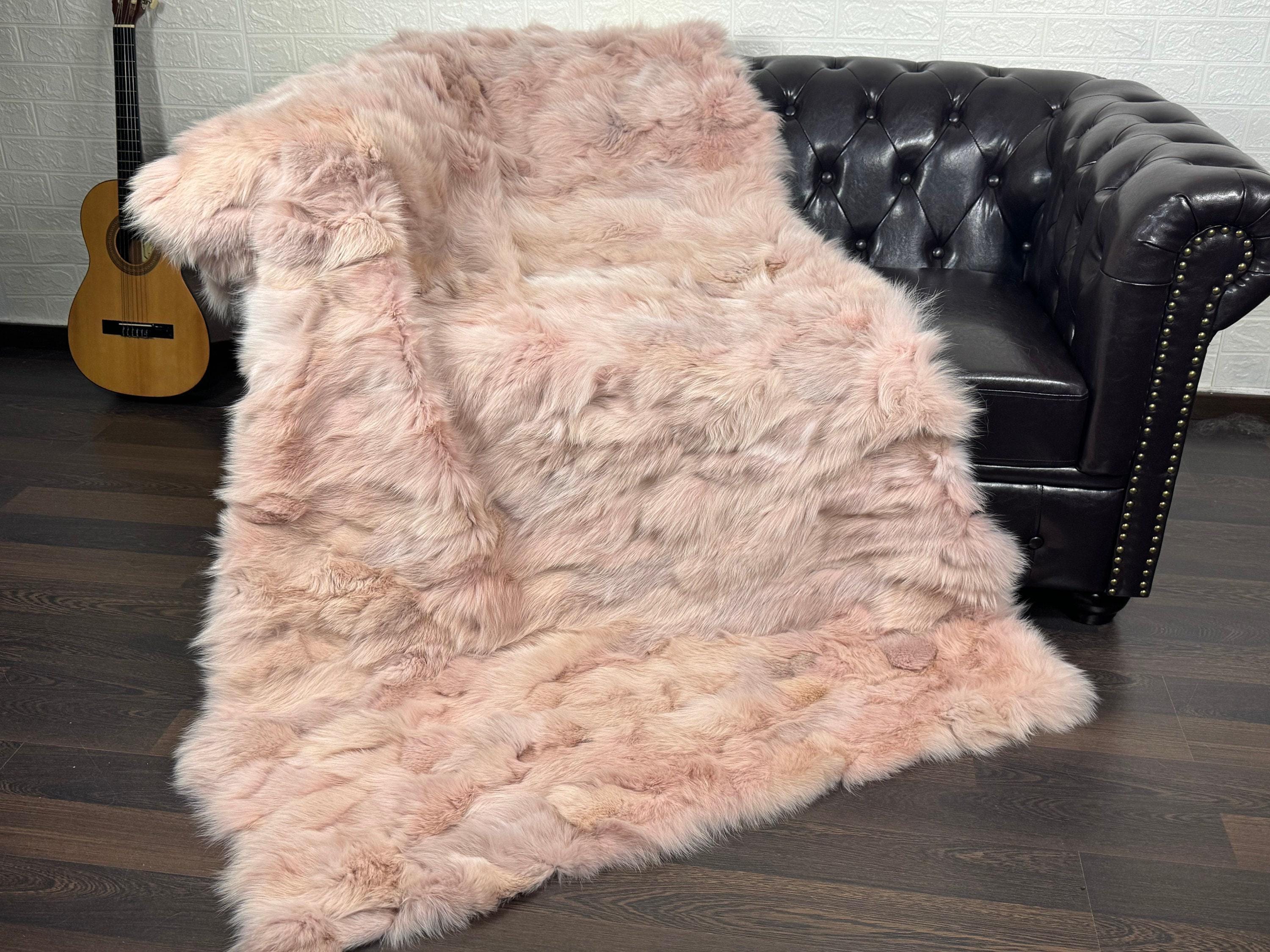 Handmade Real Pink Fox Fur Blanket that can be used as a throw as well. Perfect for Bedspread or Sofa Cover.