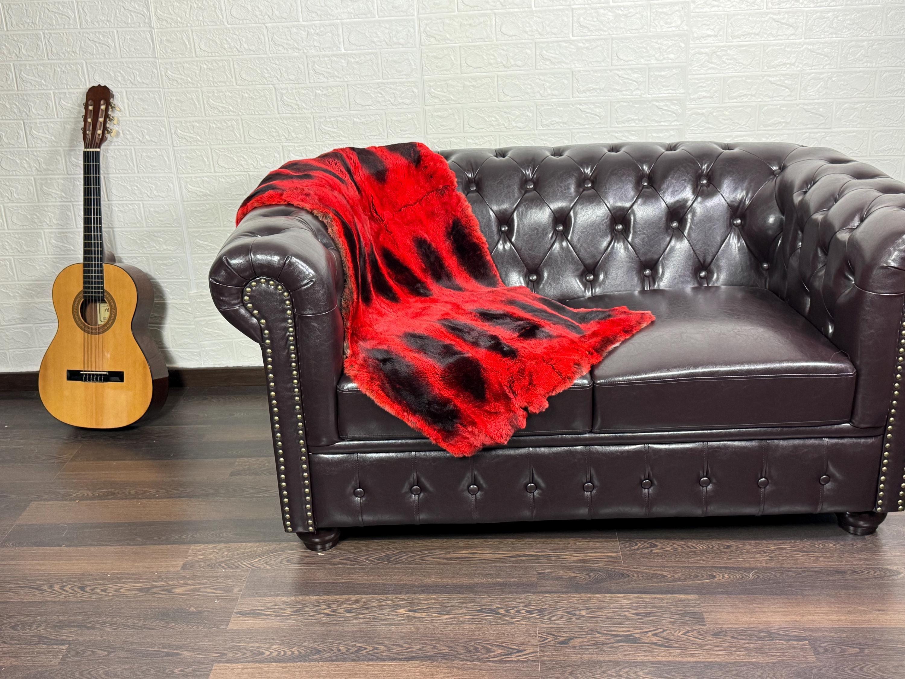 Handmade DOUBLE SIDED Real Red with Black Color Rex Rabbit Fur Blanket that can be used as a throw as well. Perfect for Bedspread or Sofa Cover.