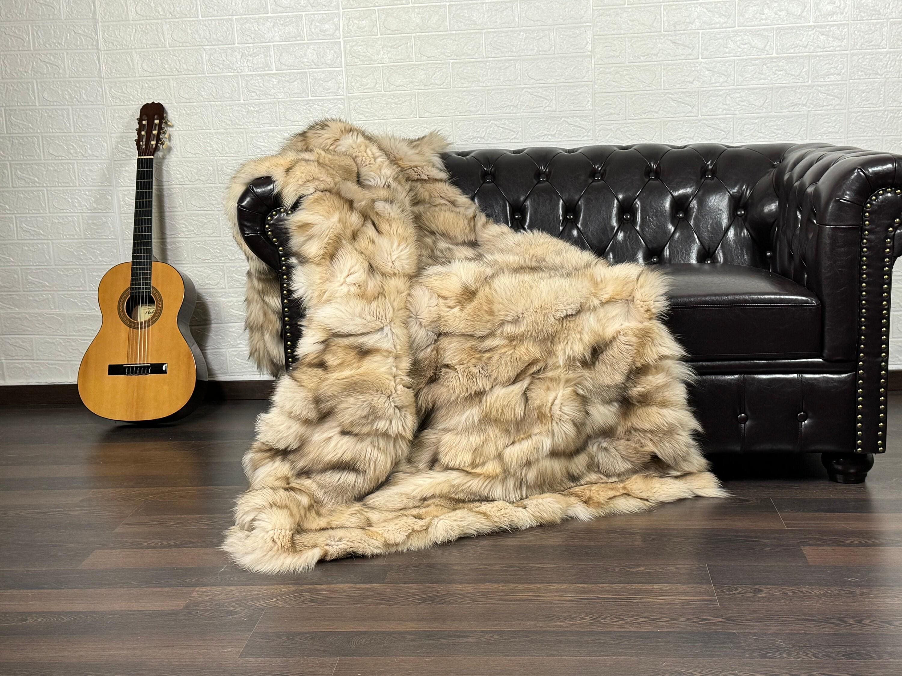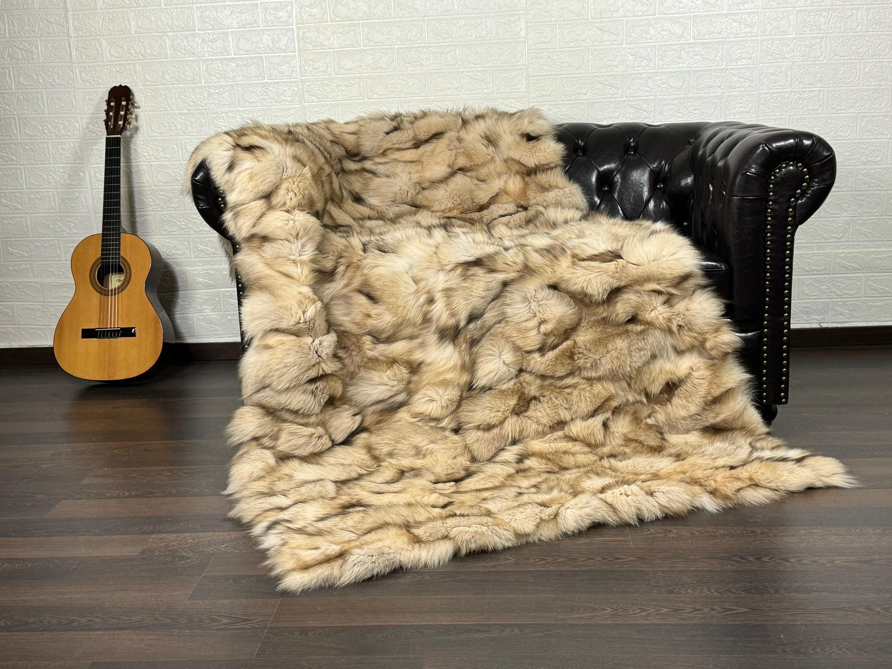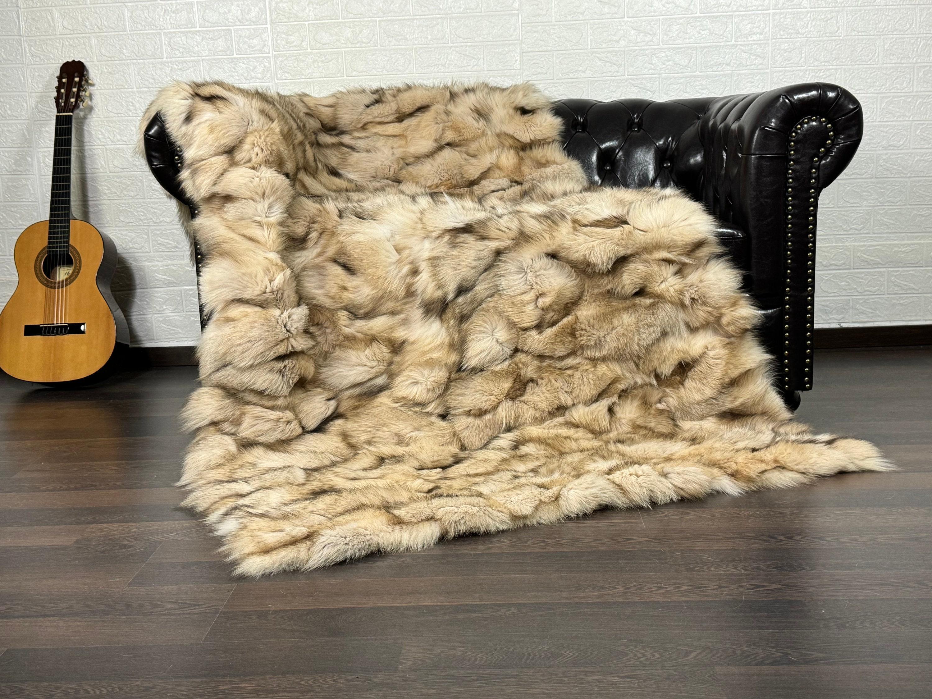 Handmade Real BeigeFox Fur Blanket Throw, Personalized Fox Blanket for you that can be used as a throw as well. Perfect for Bedspread or Sofa Cover.