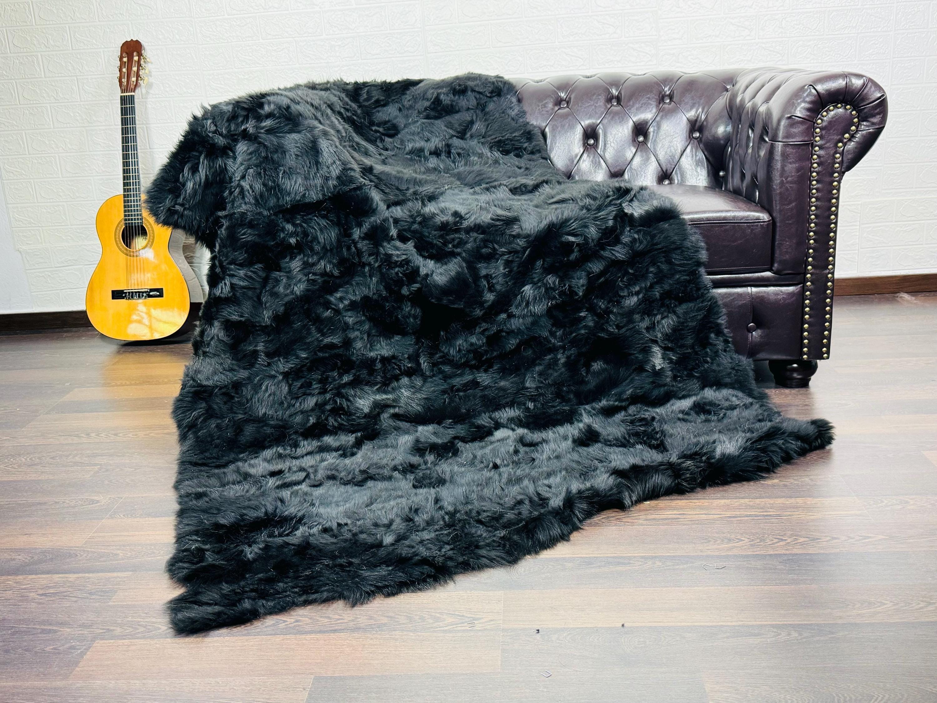 Handmade Real Black Sheepskin Fur Fluffy Wool Blanket that can be used as a throw as well. Perfect for Bedspread or Sofa Cover.
