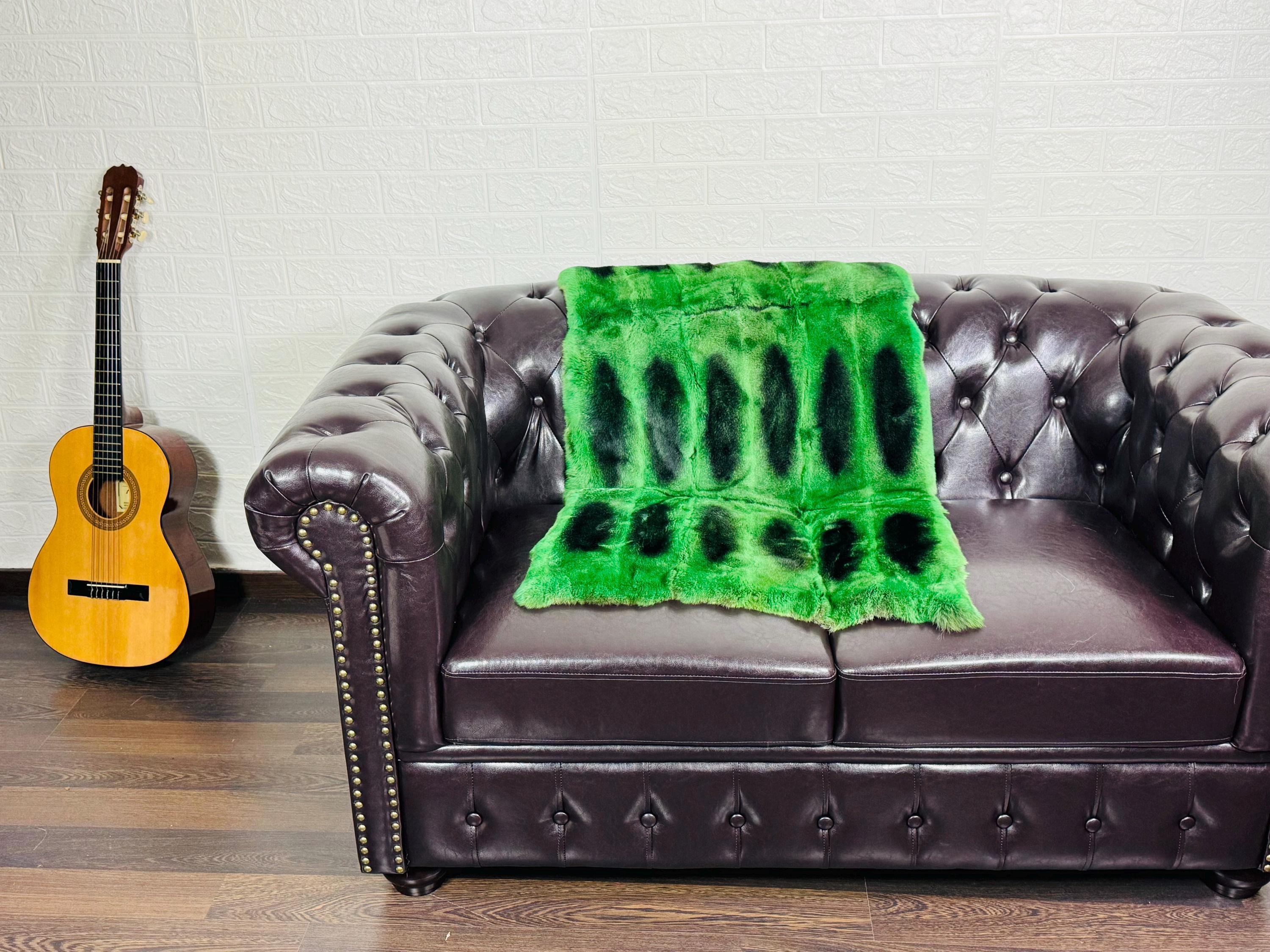 Handmade DOUBLE SIDED Real Green with Black Full Skin Color Rex Rabbit Fur Blanket that can be used as a throw as well. Perfect for Bedspread or Sofa Cover.