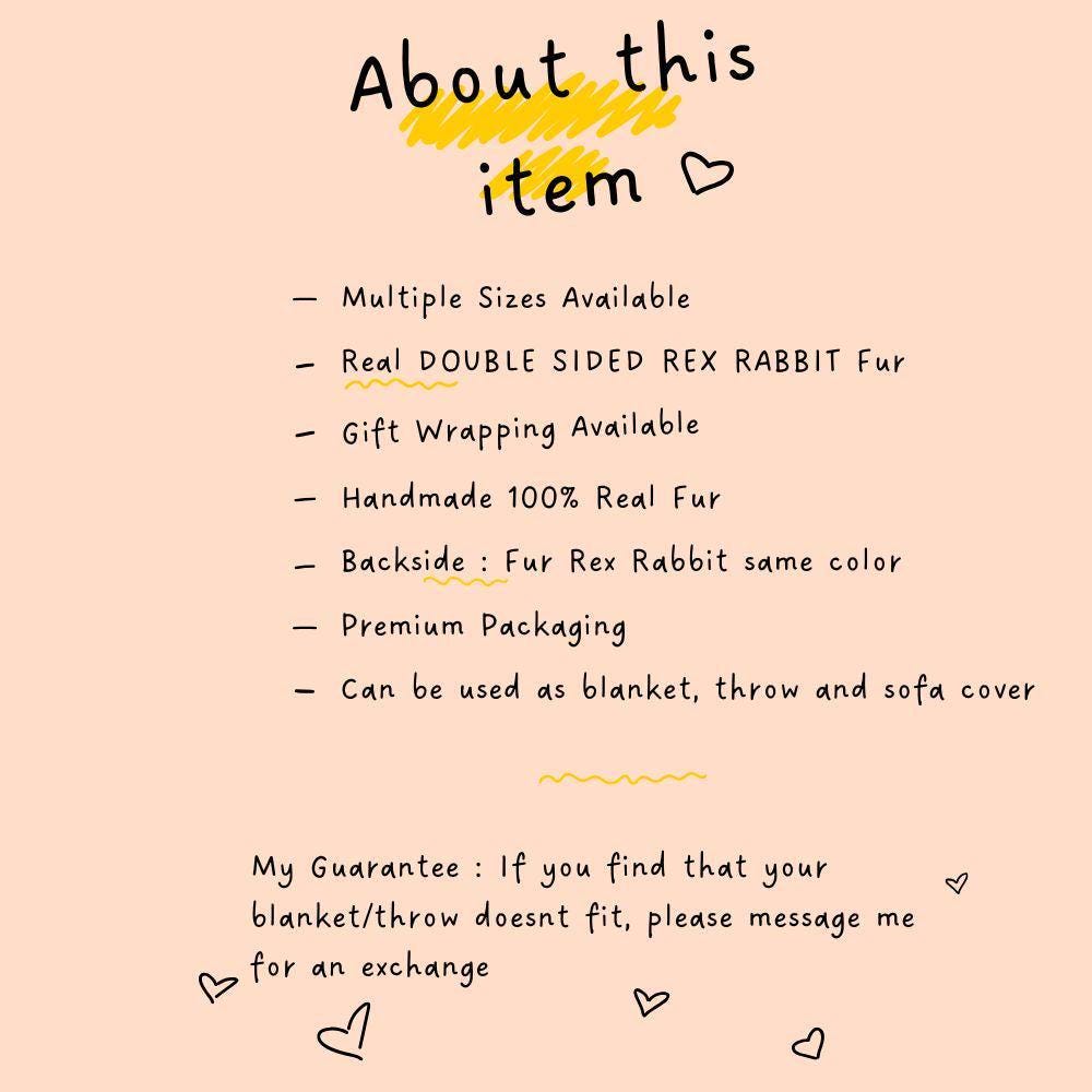 I LOVE IT, I can’t be more pleased. I expected a nice blanket after reading reviews but my experience as a whole and the blanket I received far exceeded my expectations. George was very patient & helpful while I decided what color & size I wanted. Never did he rush me or try to upsell. I felt that he really wanted me to love my blanket. I decided on this double-sided 57x79” black/grey/white color blanket for my queen size bed. George stayed in touch thru the entire DHL shipping process and monitored my delivery date. I received it today and it is perfect. The quality & craftsmanship is top notch, the Rex Rabbit Fur is so soft and it smells lovely. I am so excited I took a chance ordering and will definitely be ordering again. Thank you George for such a beautiful keepsake.🐇