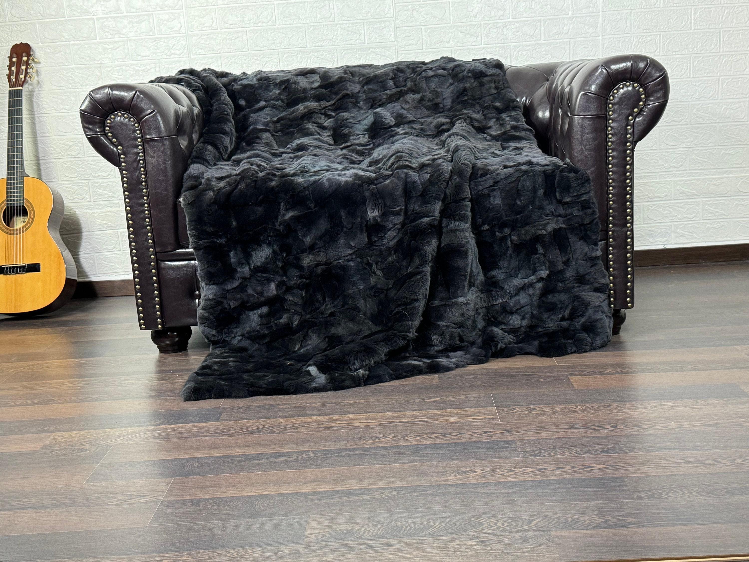 Handmade Real Black Rex Rabbit Fur Blanket that can be used as a throw as well. Perfect for Bedspread or Sofa Cover.