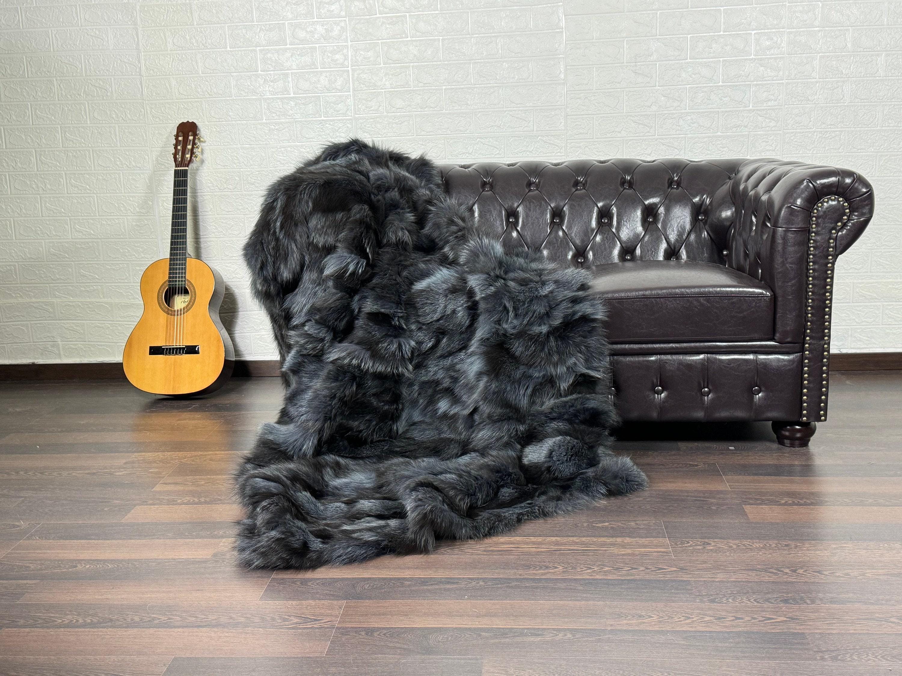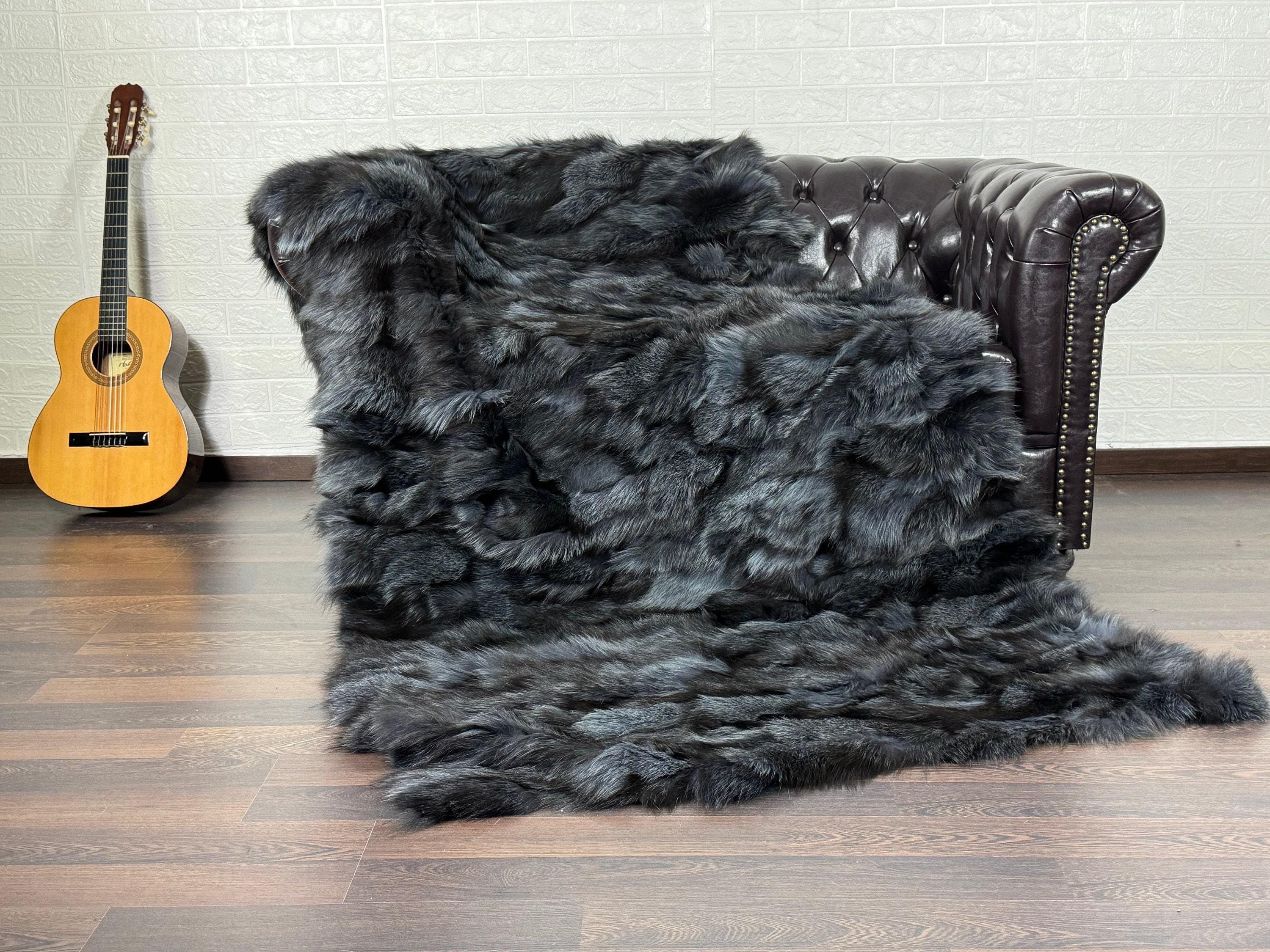 Handmade Fox Fur Throw Blanket Frost Dyed Dark Blue Gray that can be used as a throw as well. Perfect for Bedspread or Sofa Cover.
