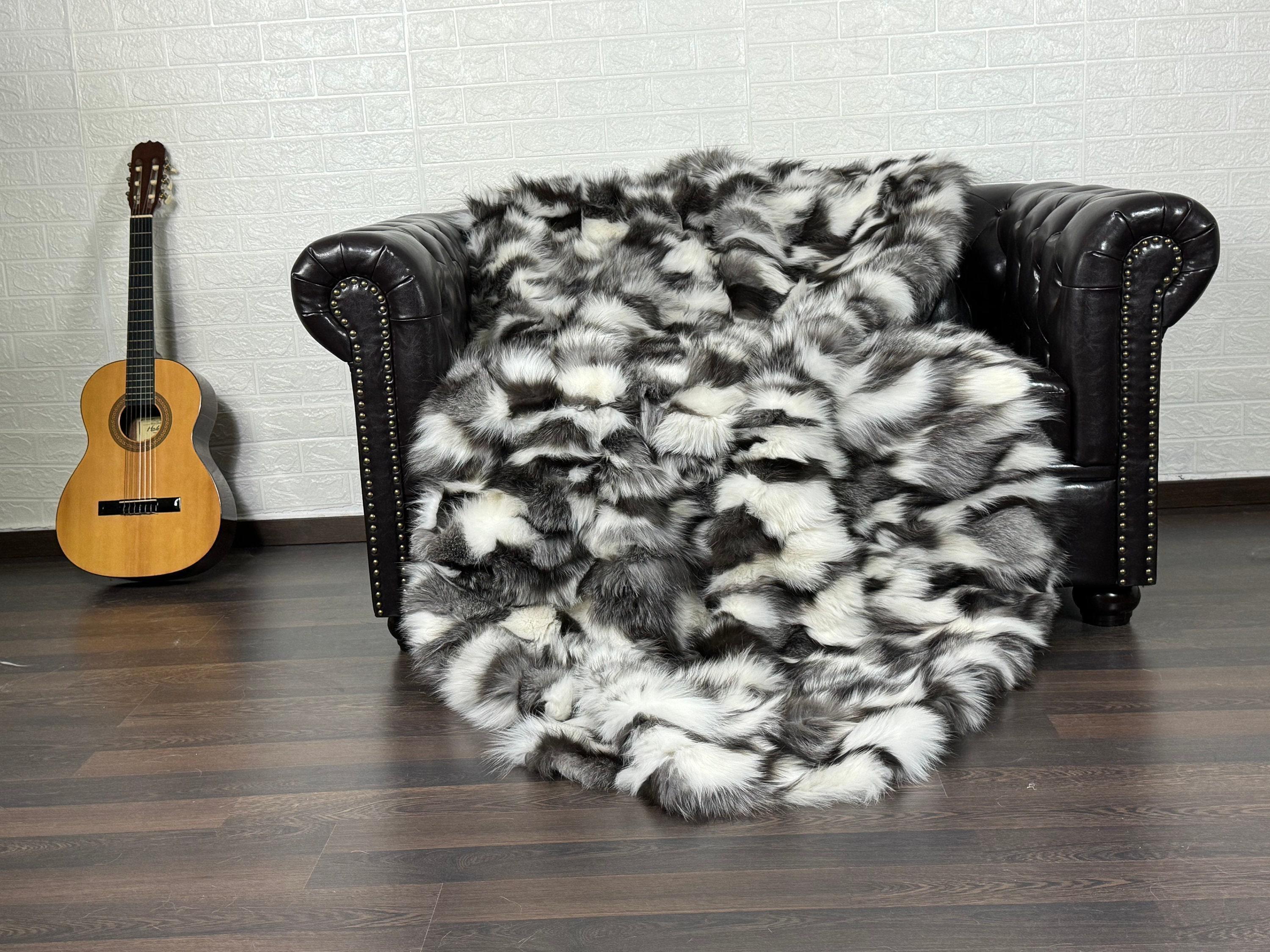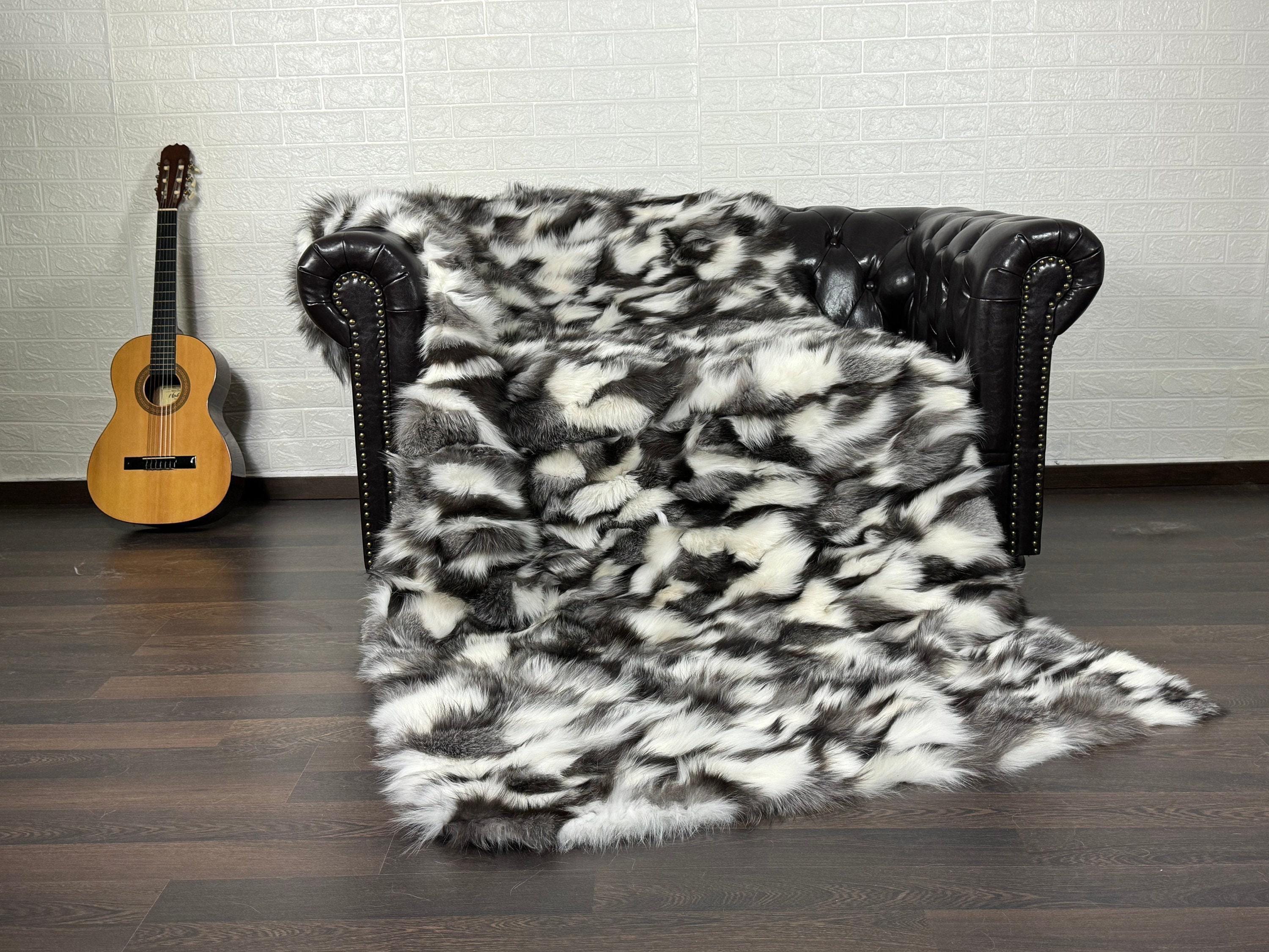 Handmade Fox Fur Throw Blanket Black & White that can be used as a throw as well. Perfect for Bedspread or Sofa Cover.