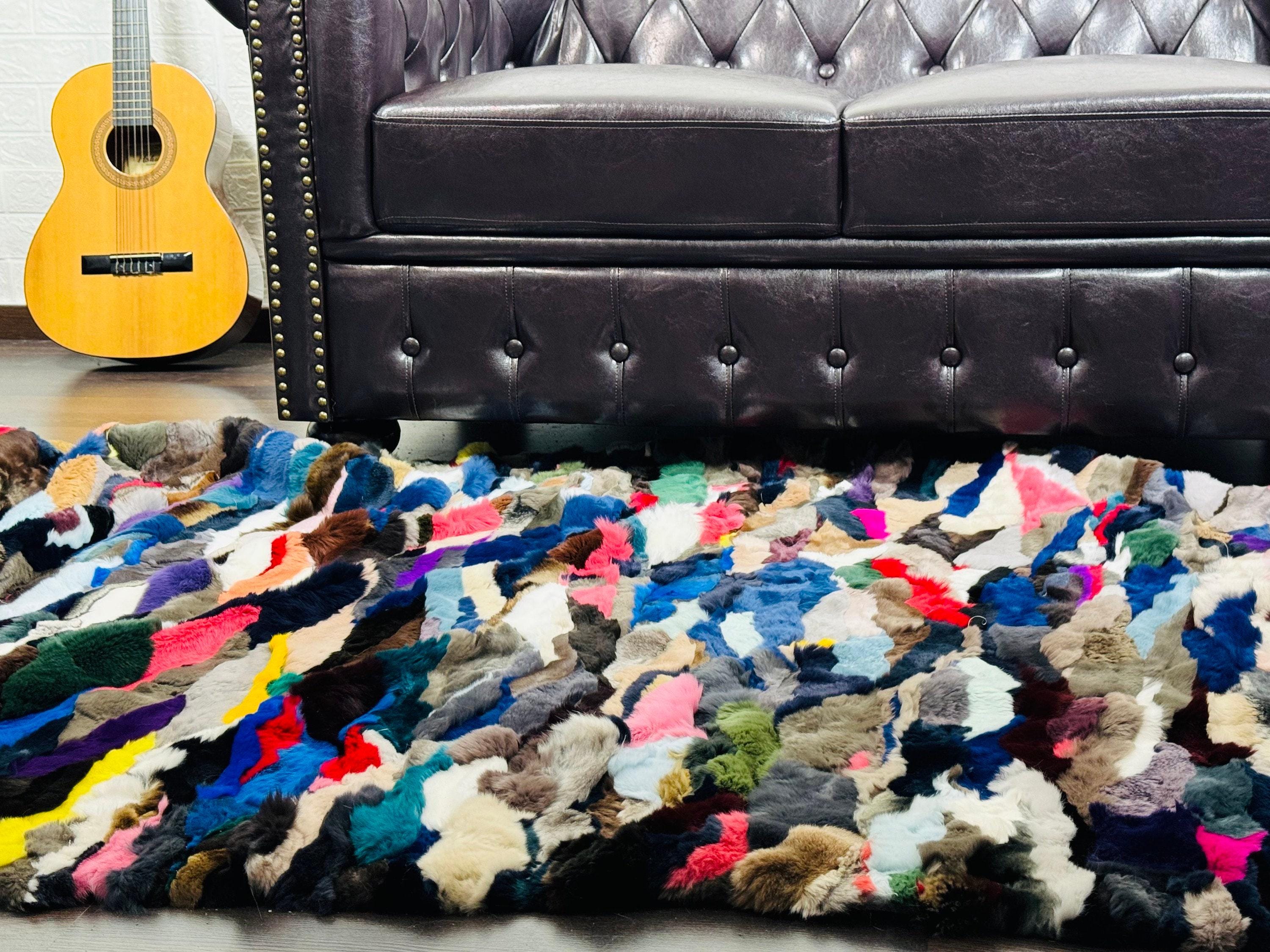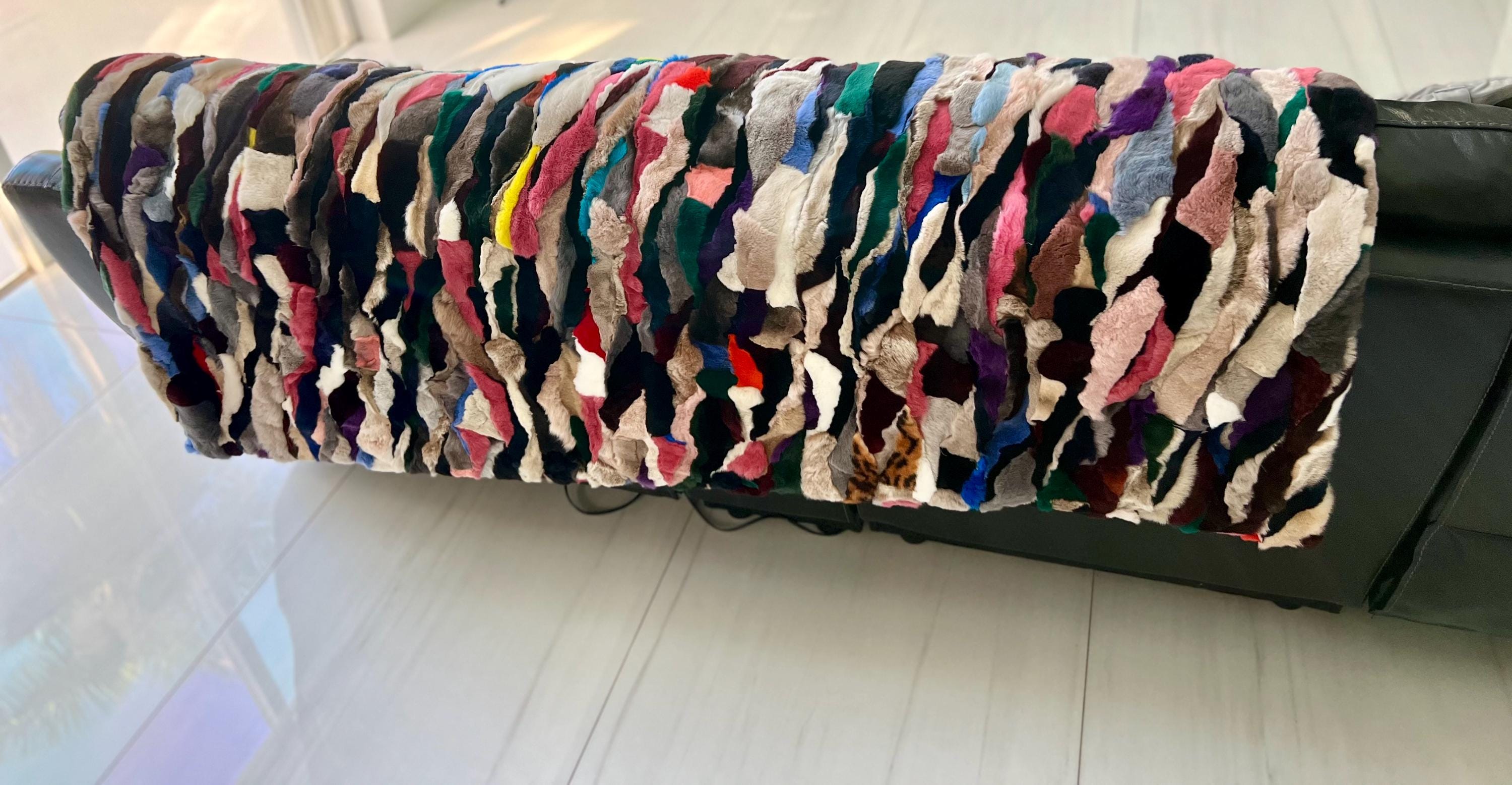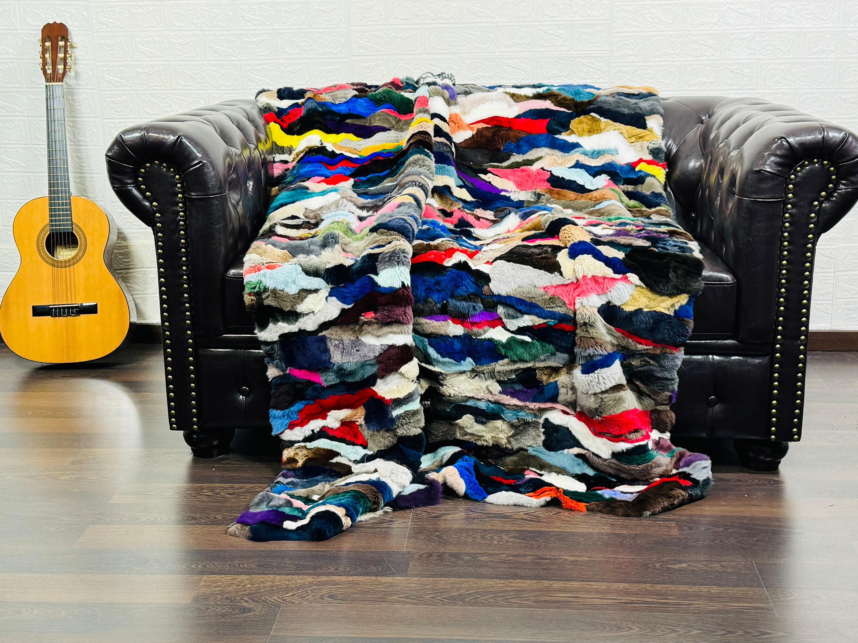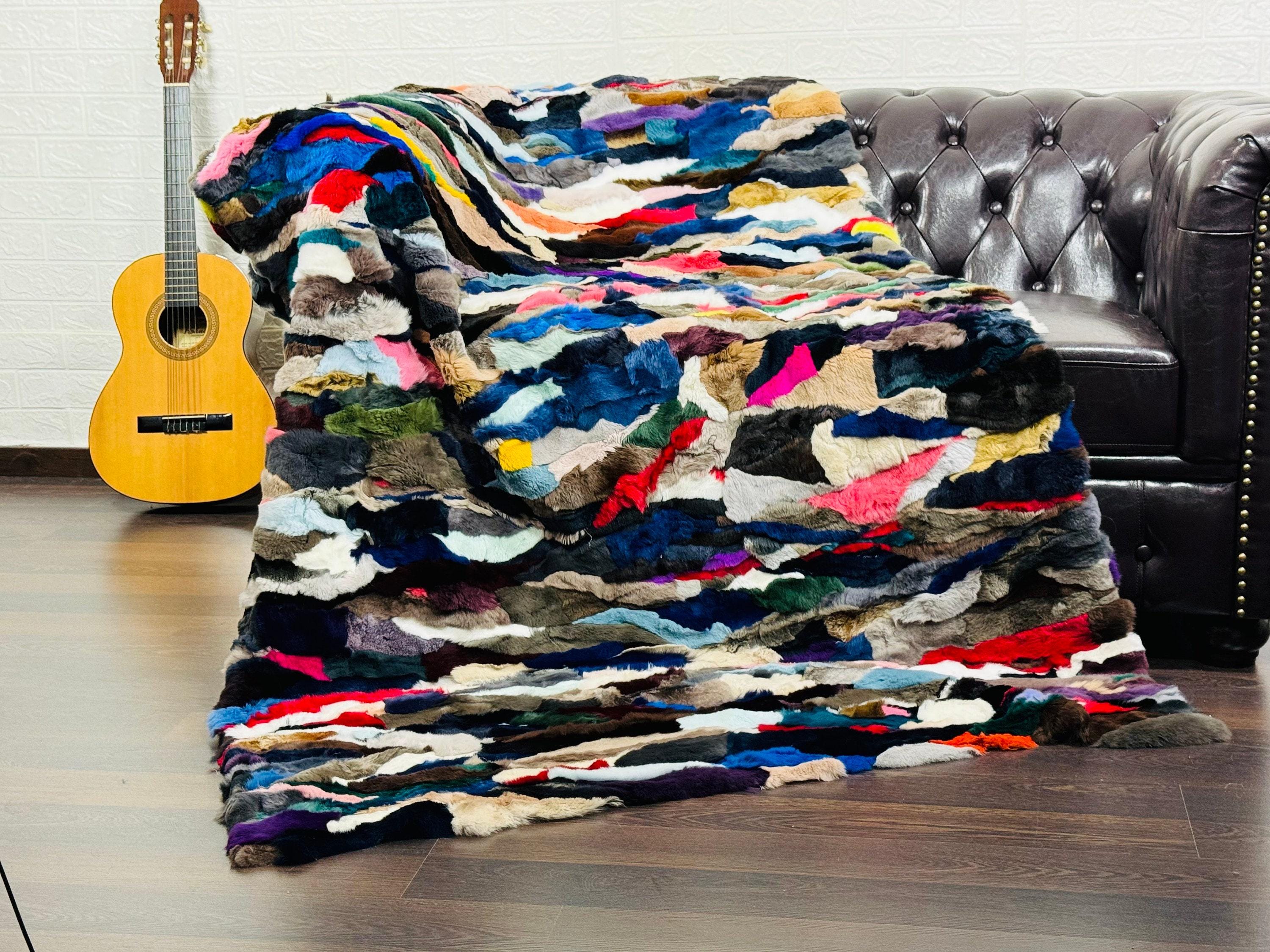 Handmade Real Multicolor Rex Rabbit Fur Blanket that can be used as a throw as well. Perfect for Bedspread or Sofa Cover.