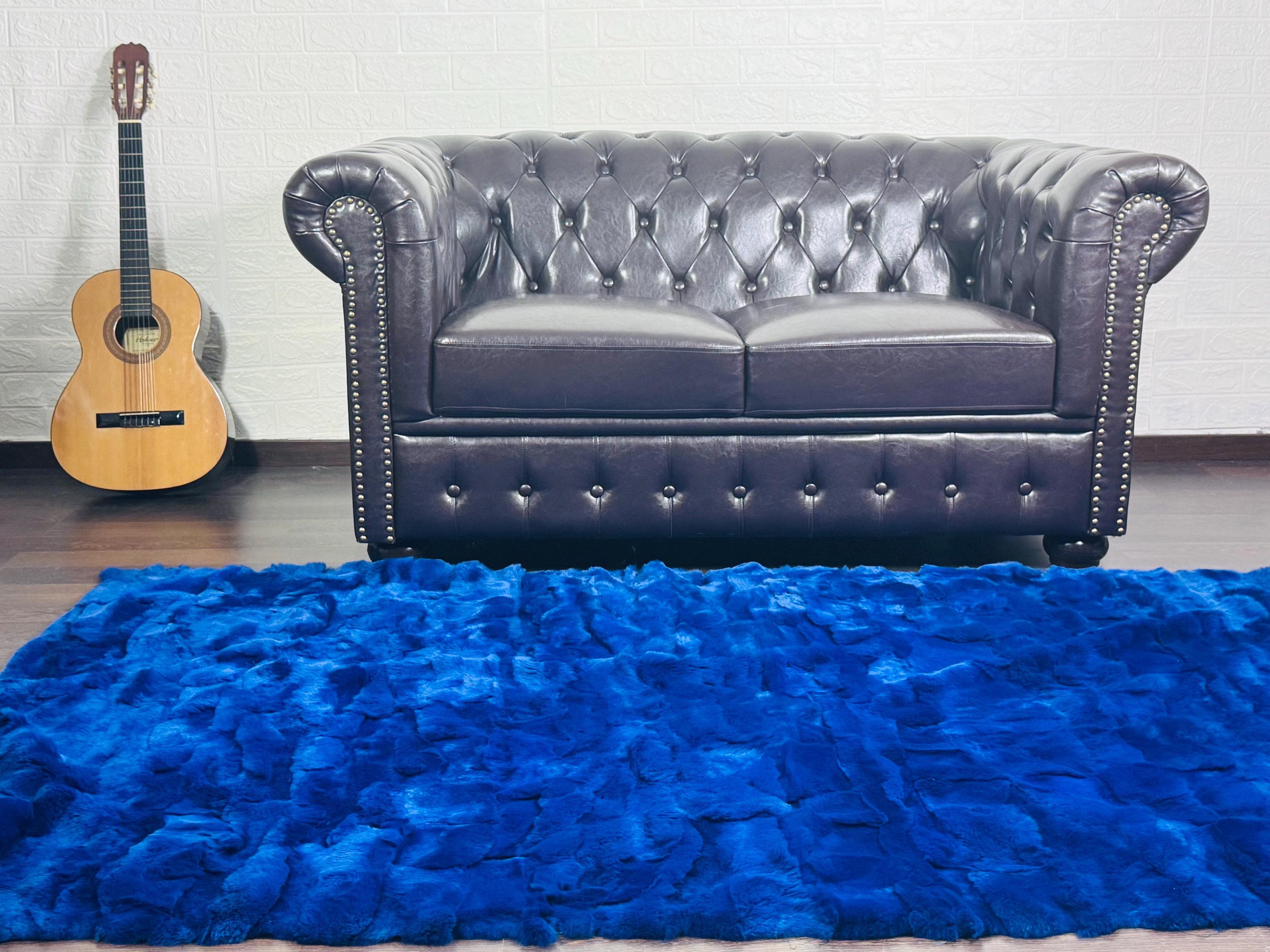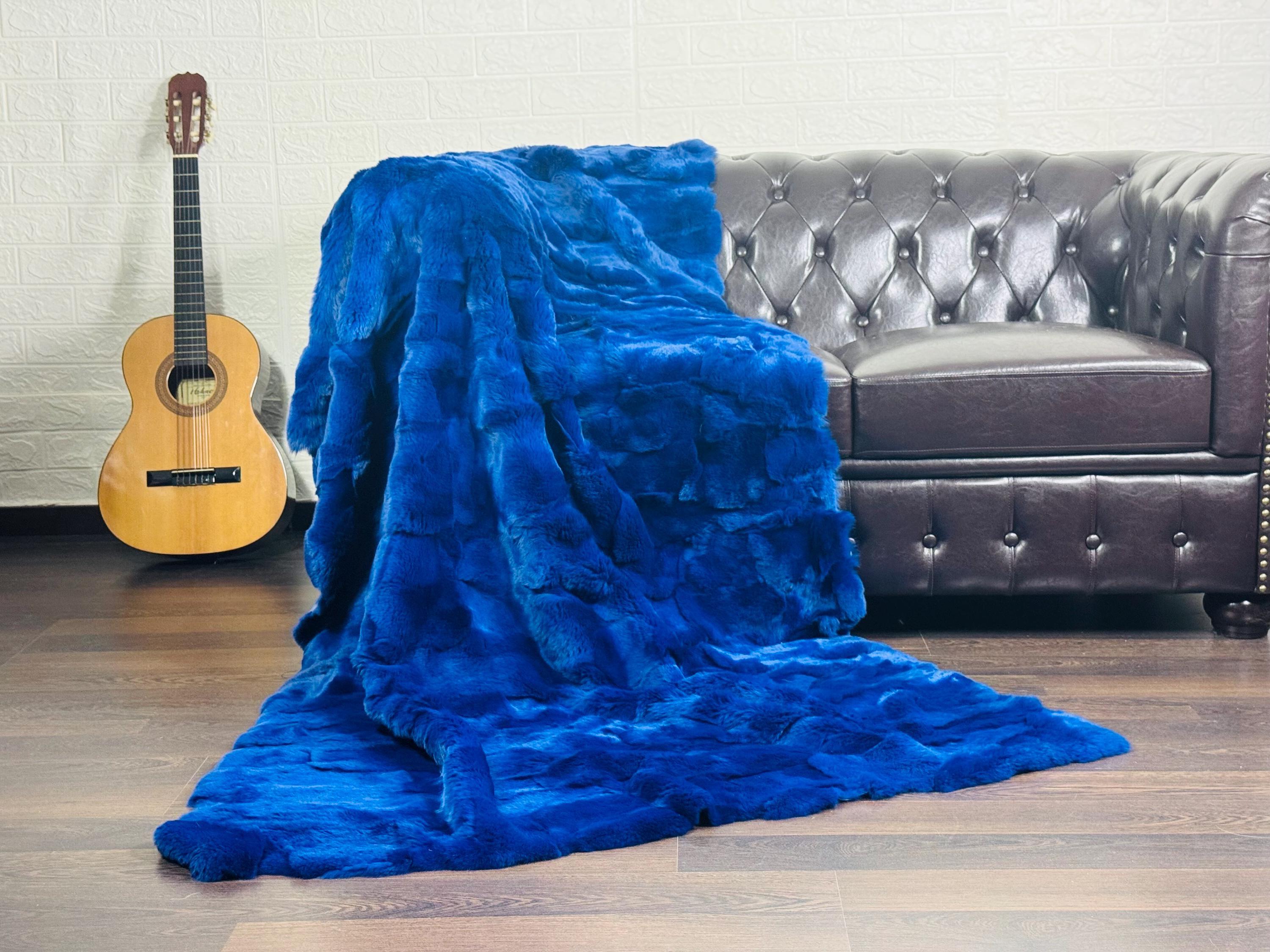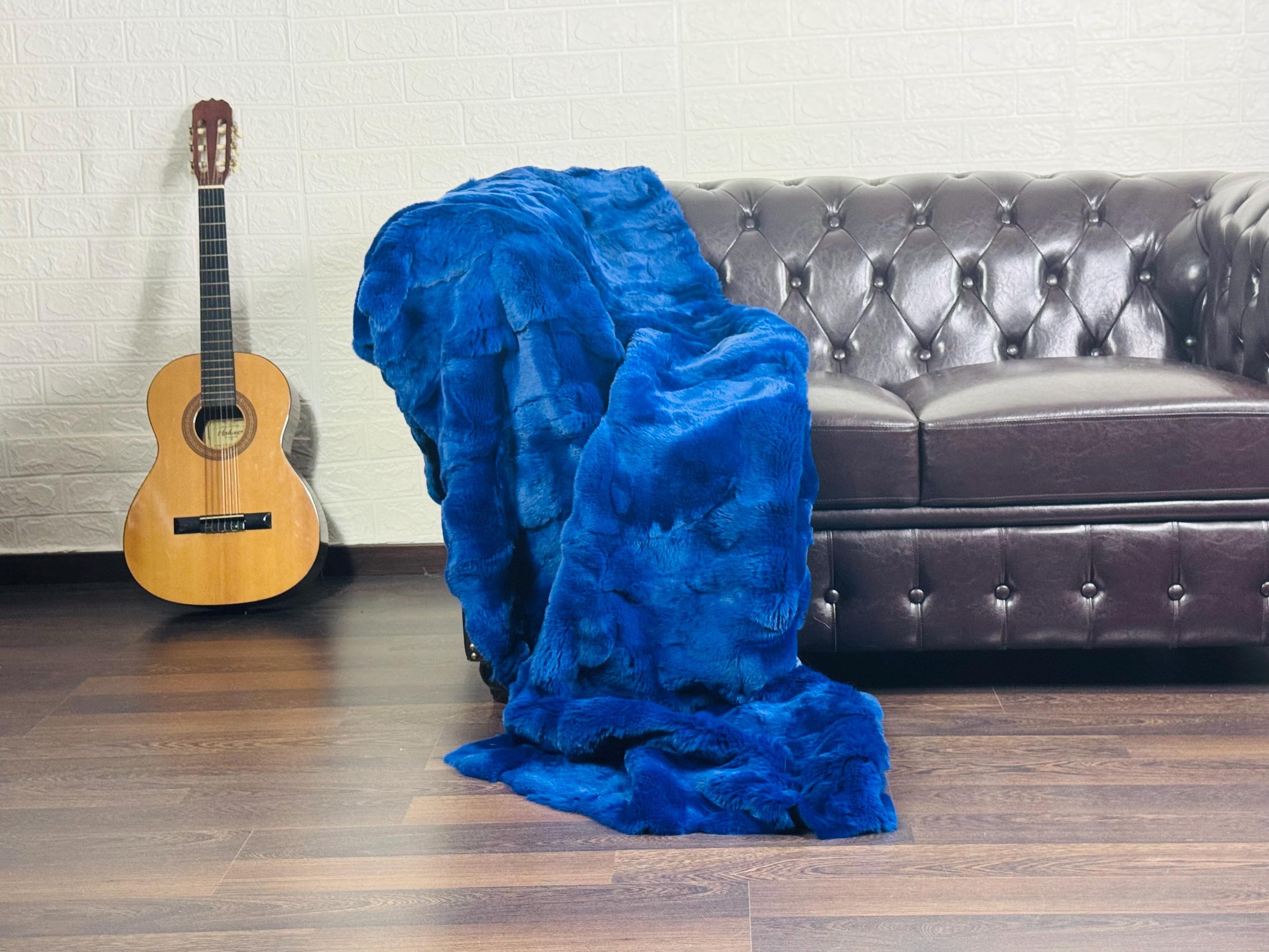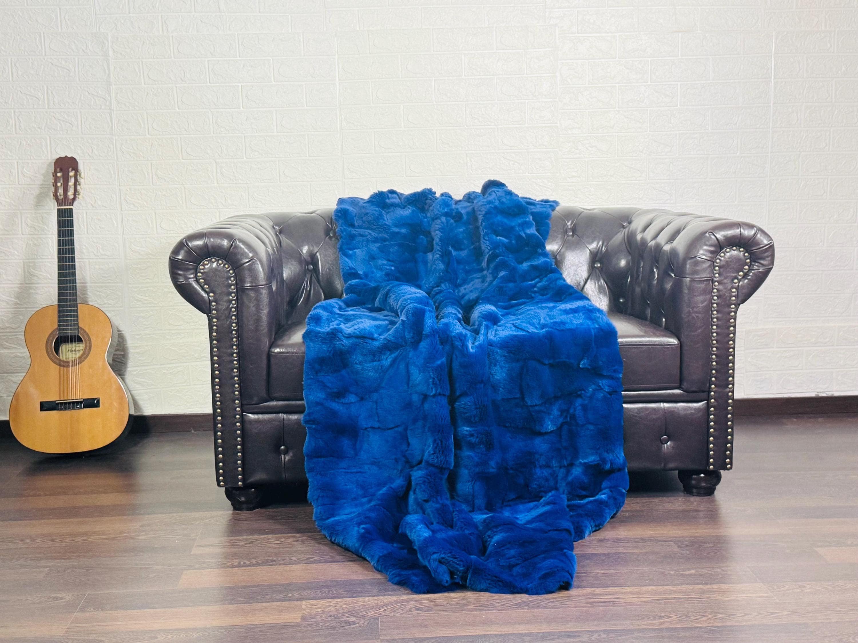 Luxurious Rex Rabbit Fur Blanket Throw Blue • Personalized Handmade Fur Sofa Cover n Bedspread • Vintage Rabbit fur Throw Blanket