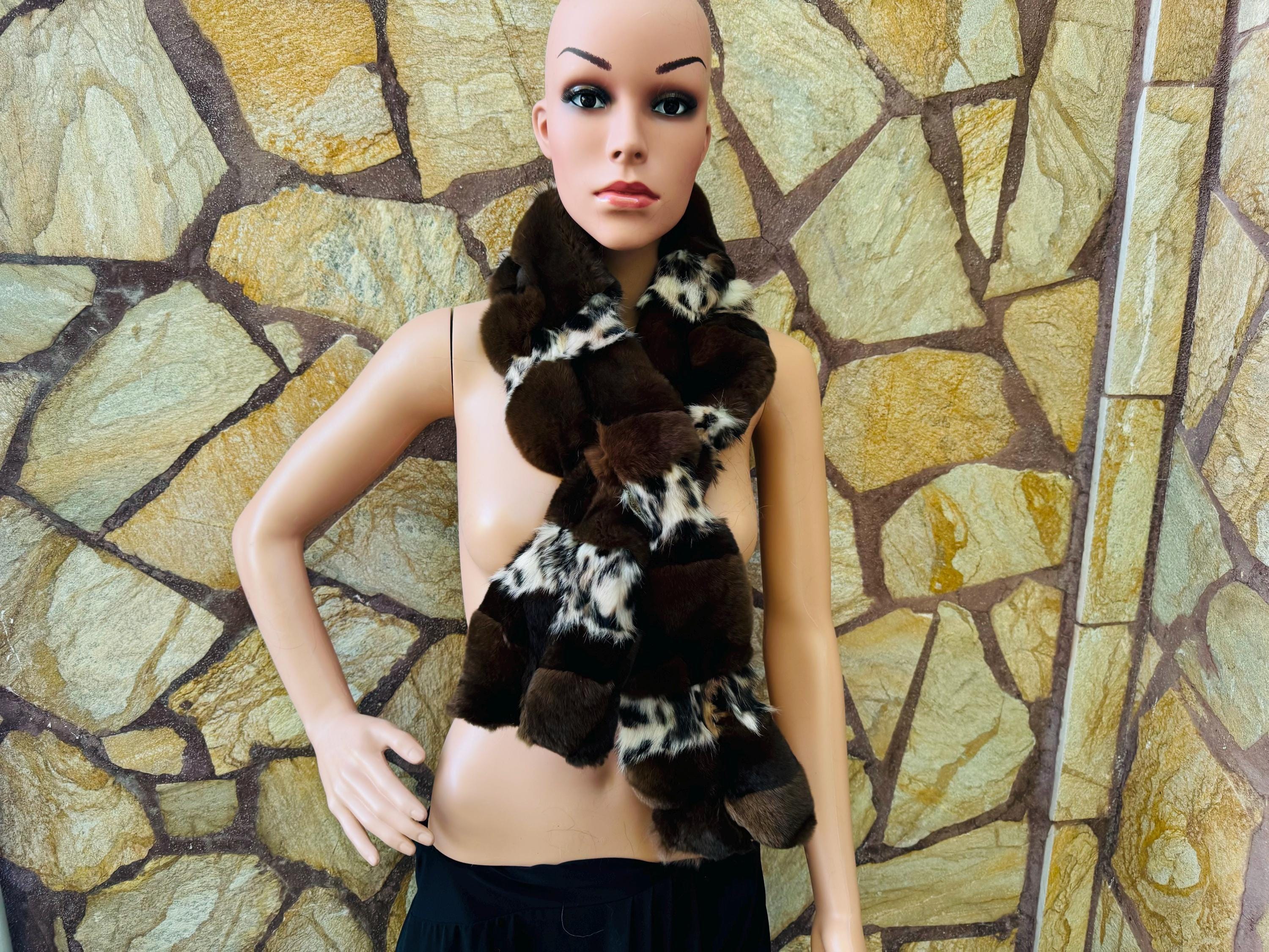 Real Rex Rabbit Fur Scarf Brown with leopard lines Color