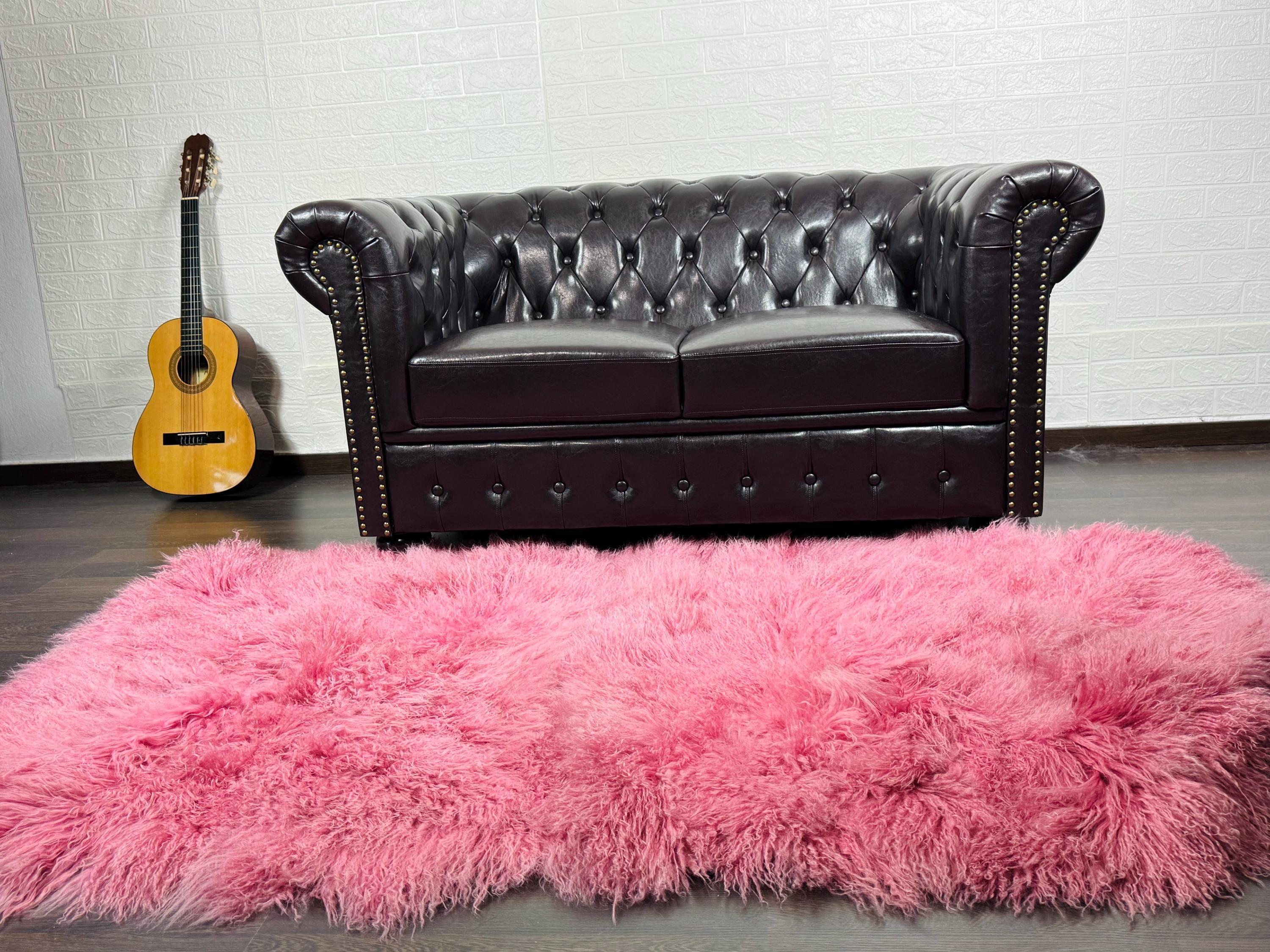Handmade Real Pink Sheepskin Mongolian Fur Blanket that can be used as a throw as well. Perfect for Bedspread or Sofa Cover.
