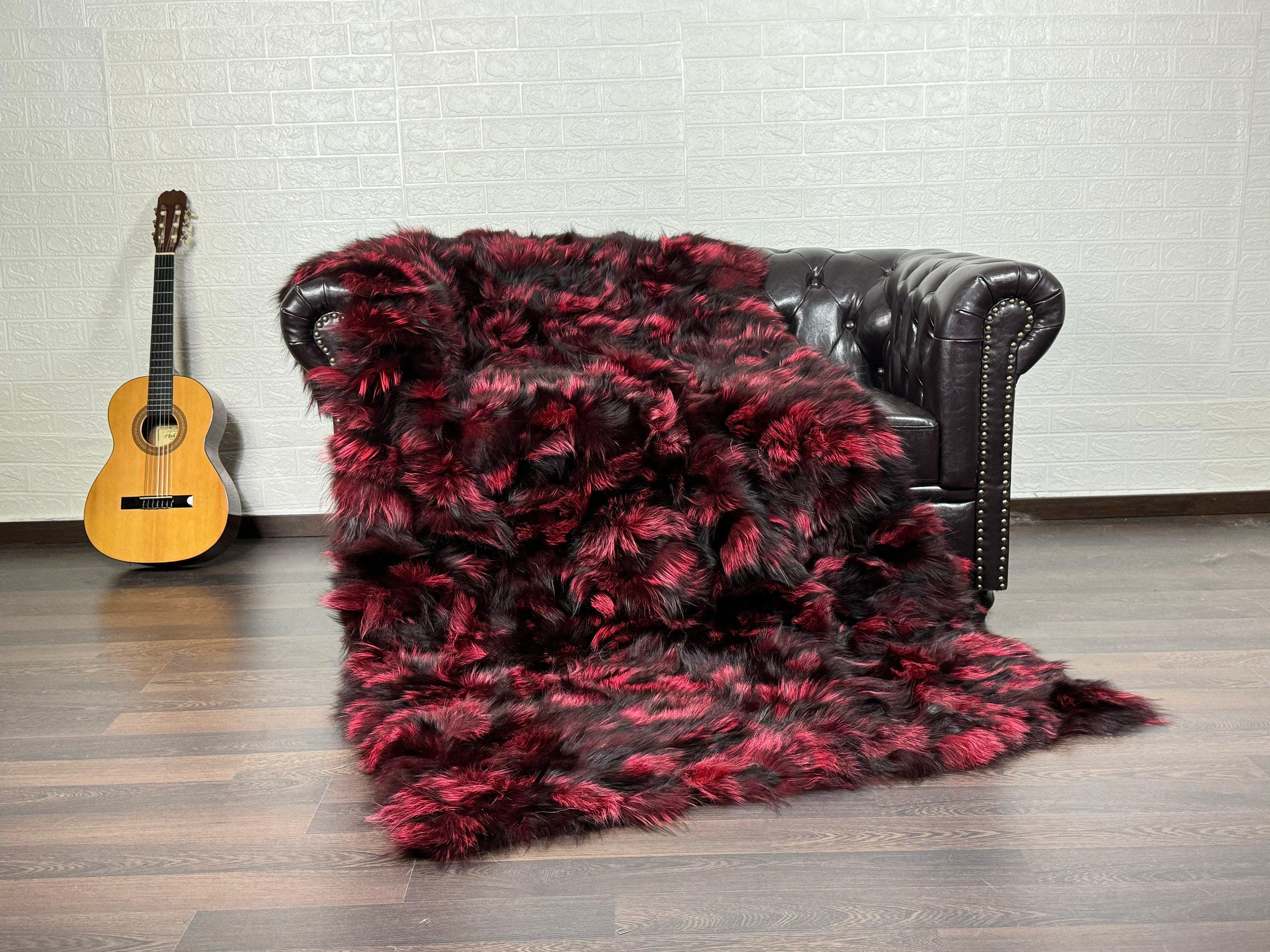Handmade Real Black with Red detailing Fox Fur Blanket that can be used as a throw as well. Perfect for Bedspread or Sofa Cover.