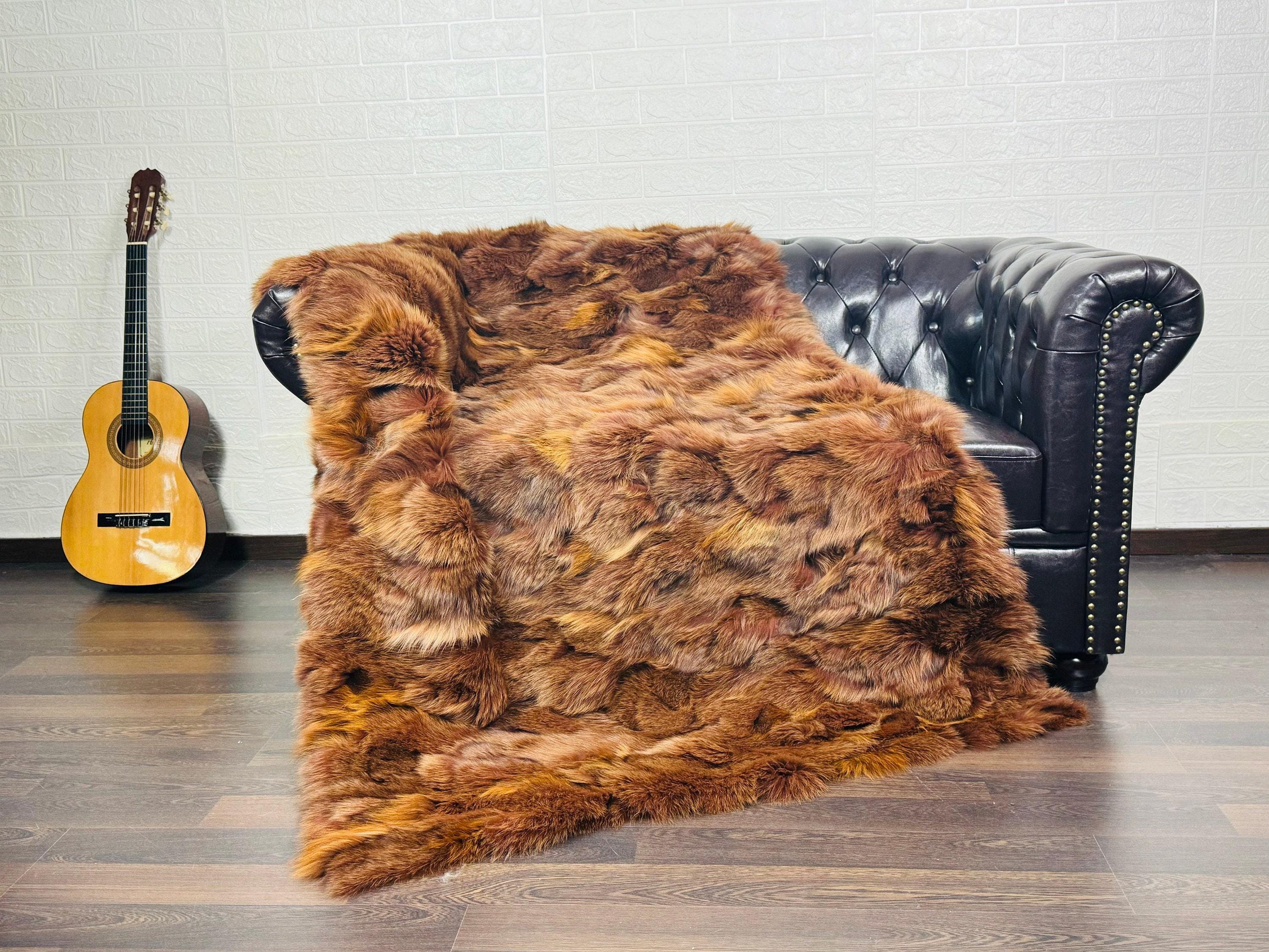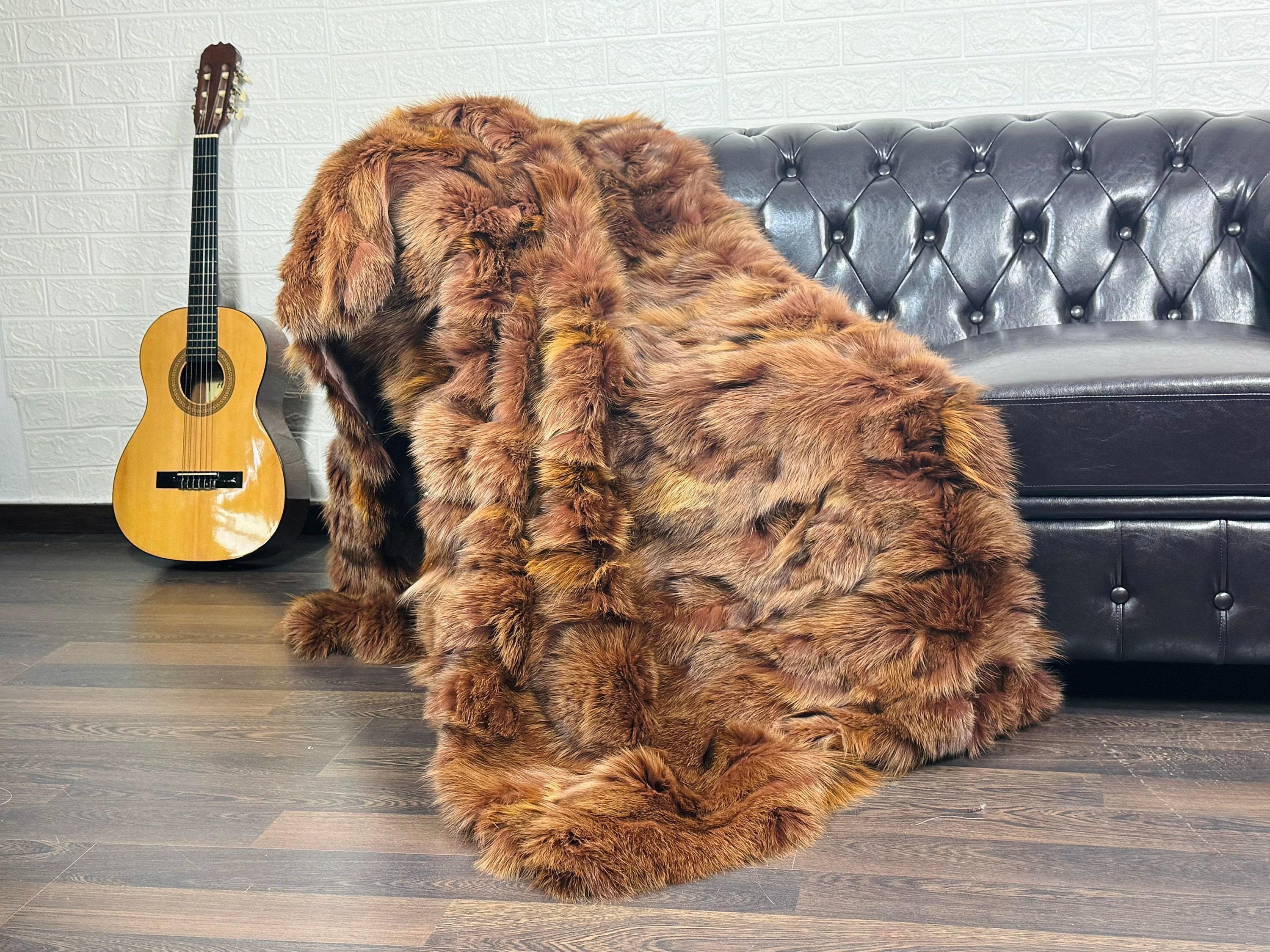 Handmade Real DOUBLE SIDED Brown Fox Fur Blanket that can be used as a throw as well. Perfect for Bedspread or Sofa Cover.