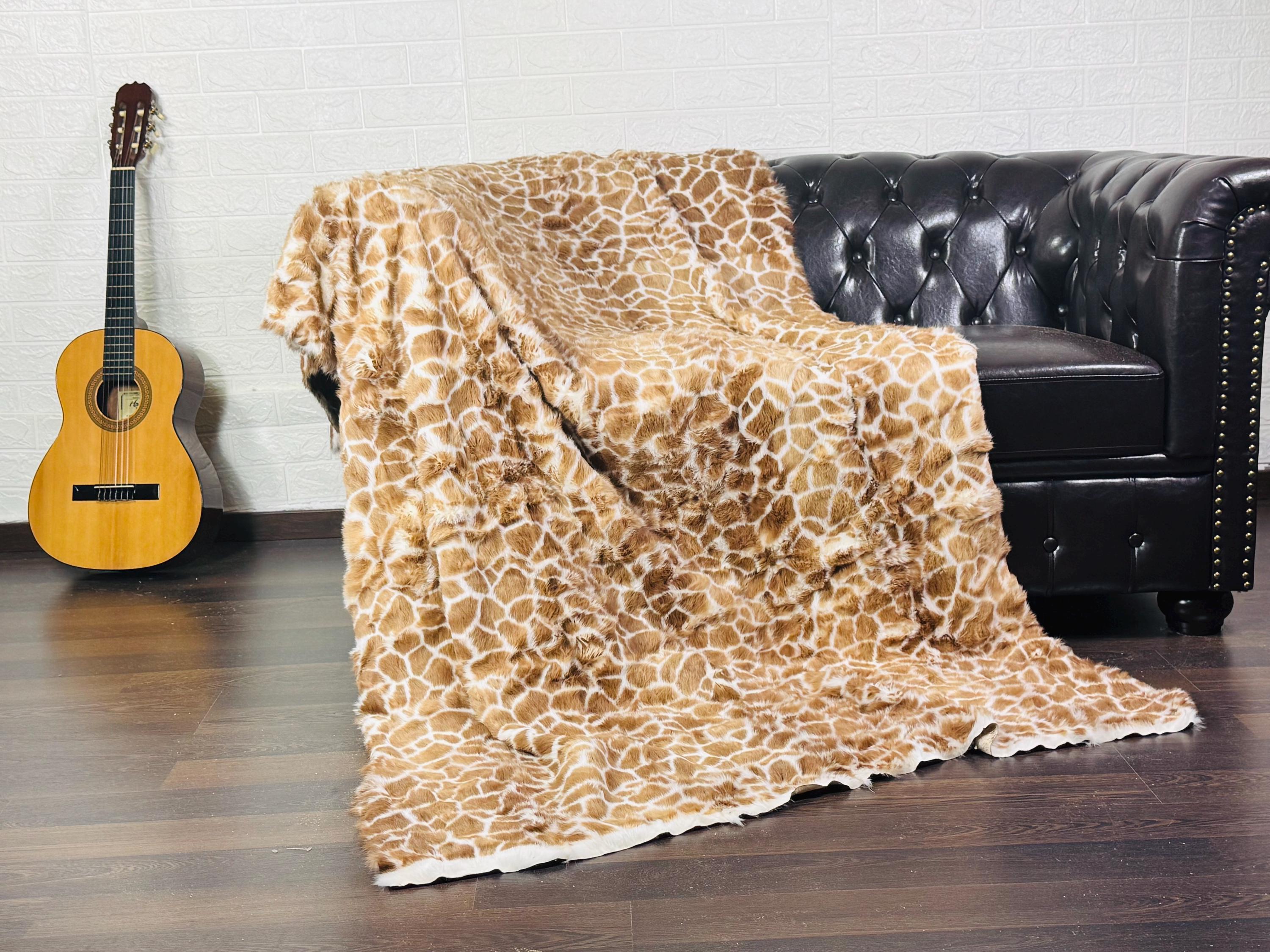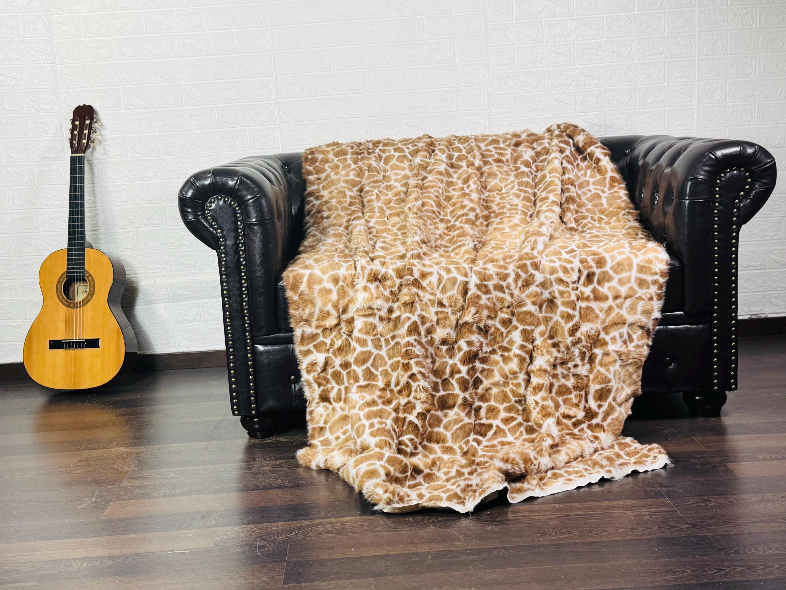 Handmade Real Camel White Brown Print Rabbit Fur Blanket that can be used as a throw as well. Perfect for Bedspread or Sofa Cover.