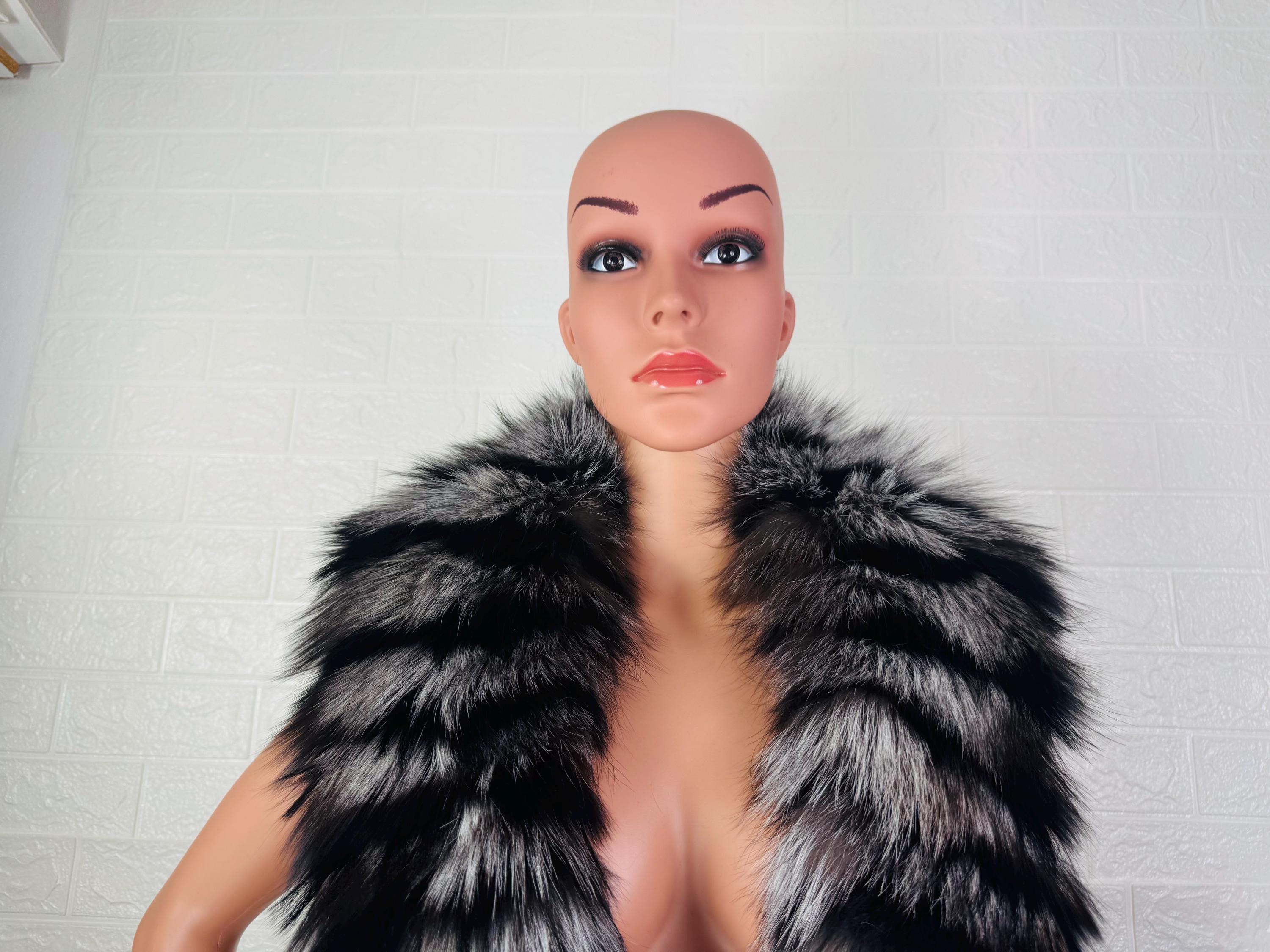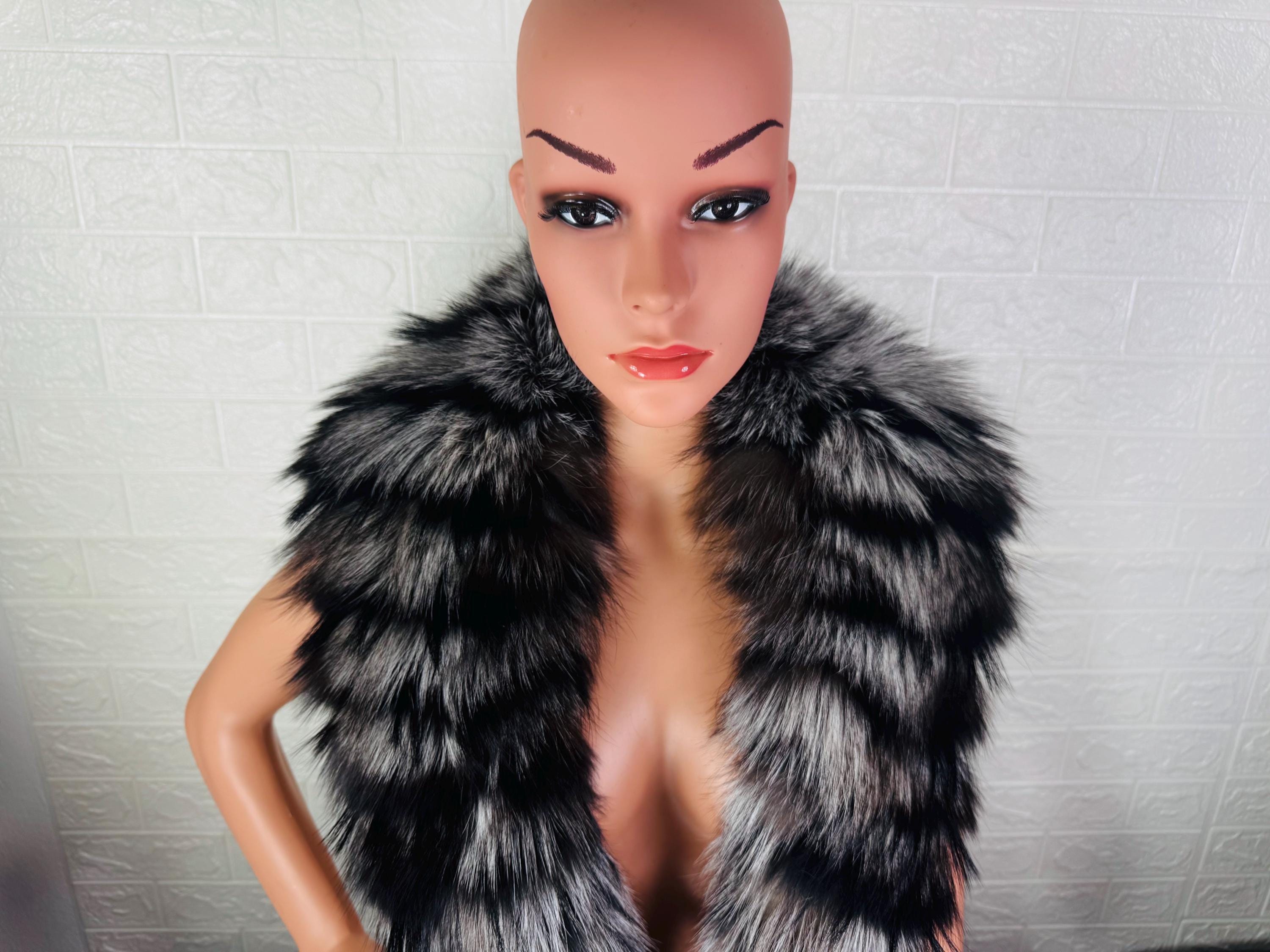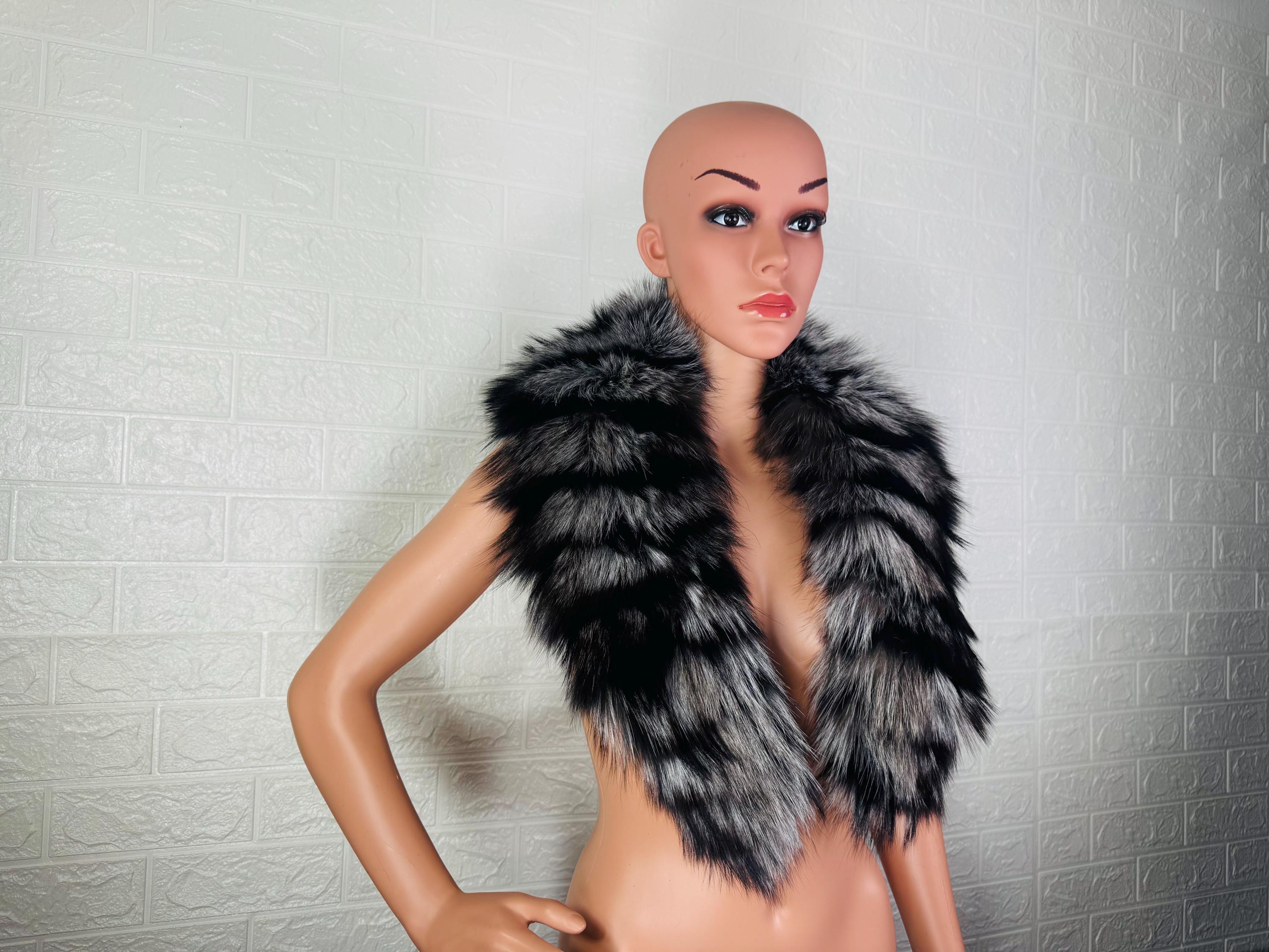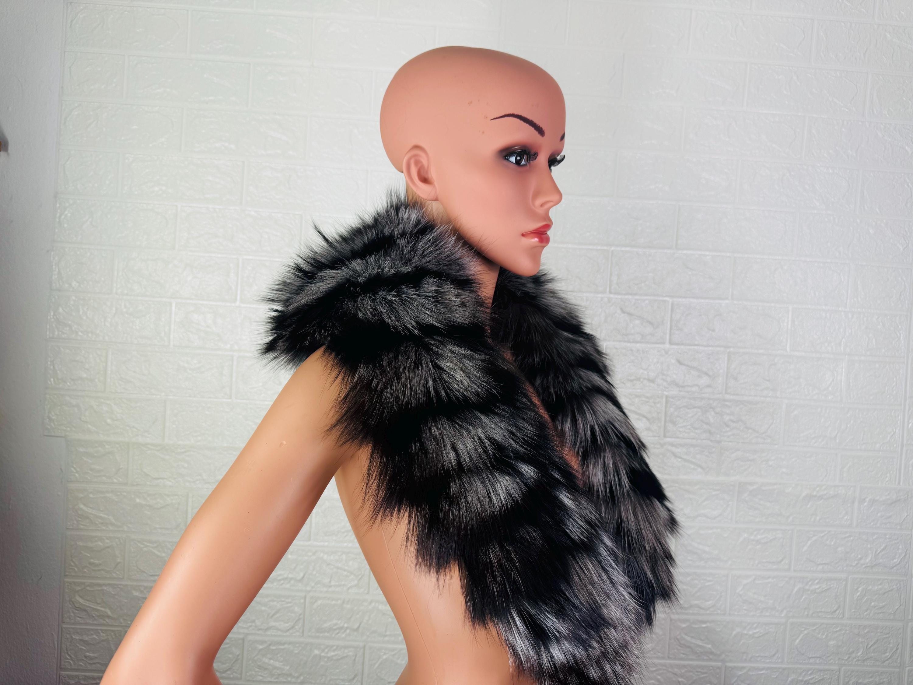 This black and silver fox fur collar scarf is fluffy, detachable, and perfect for both men and women. Wear it as a neckwarmer, wrap, or fur stole—elevating any outfit for the colder months.