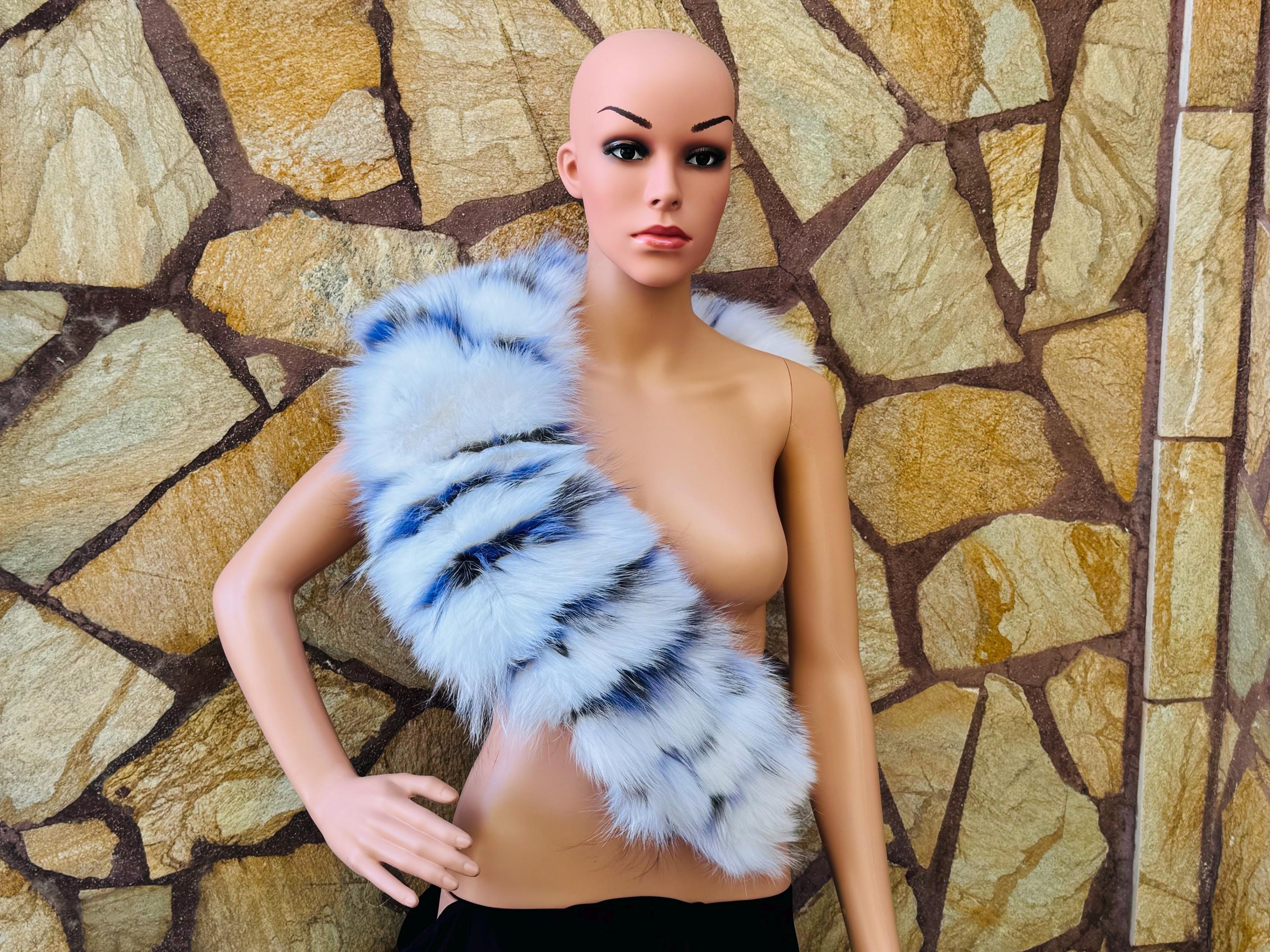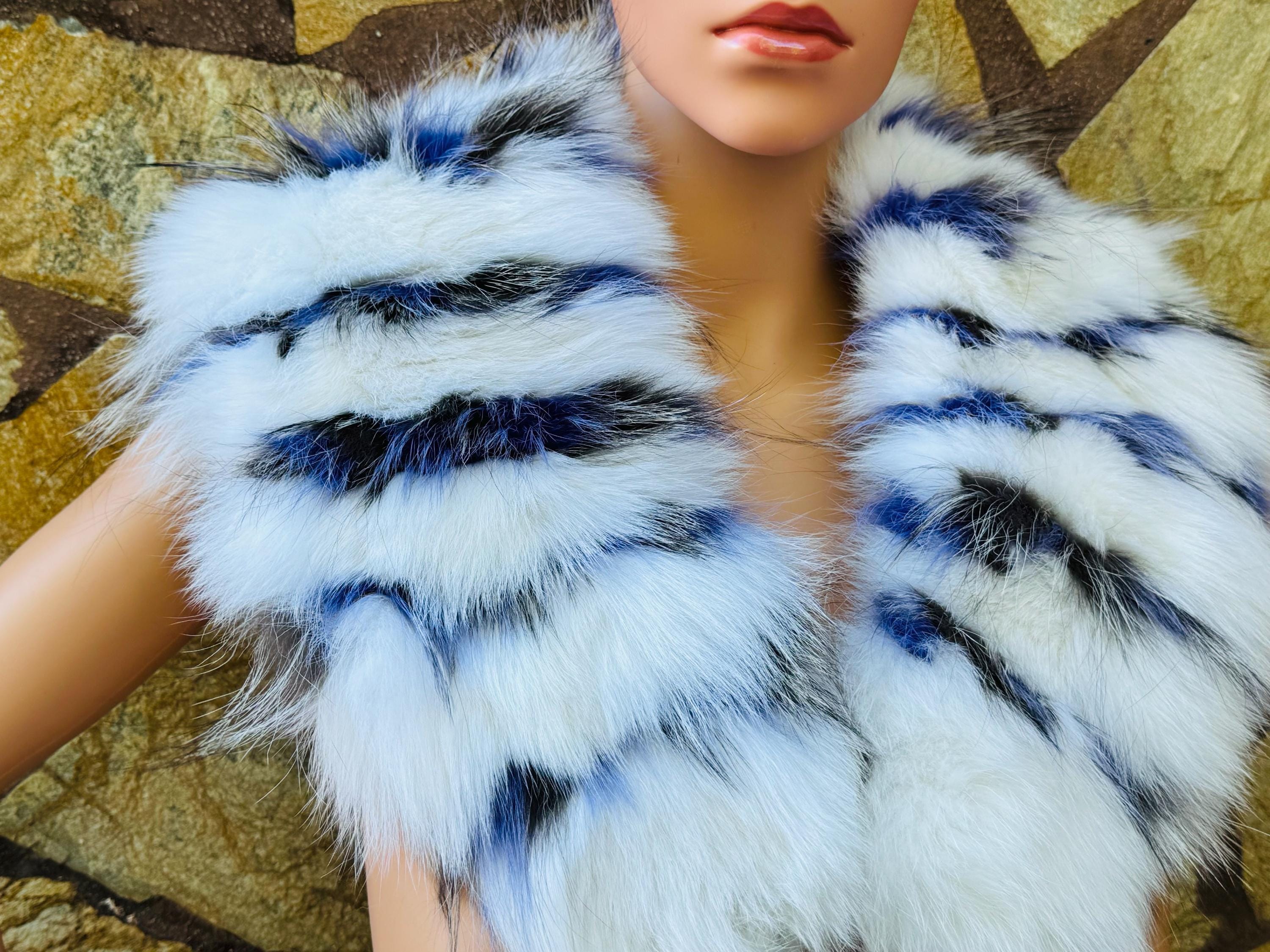 This white with blue detailing fox fur collar scarf is detachable, fluffy, and versatile, perfect for both men and women. Wear it as a neckwarmer, wrap, or stole to keep warm and stylish. A perfect gift for her!