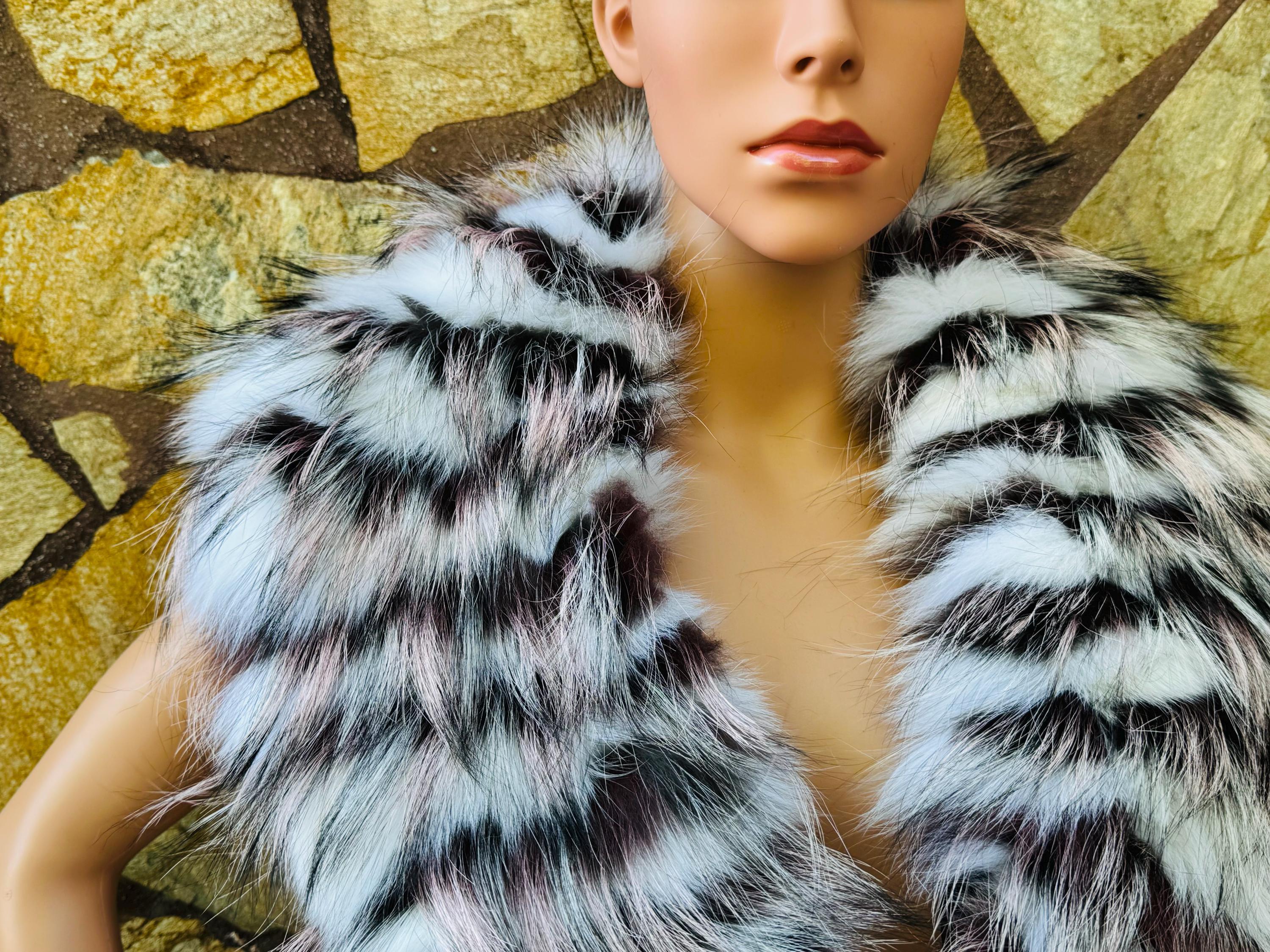 This white with purple and black detailing fox fur collar scarf is fluffy, detachable, and can be worn as a neckwarmer, wrap, or stole. Perfect for both men and women, it adds warmth and chic style to any outfit. A perfect gift for her!