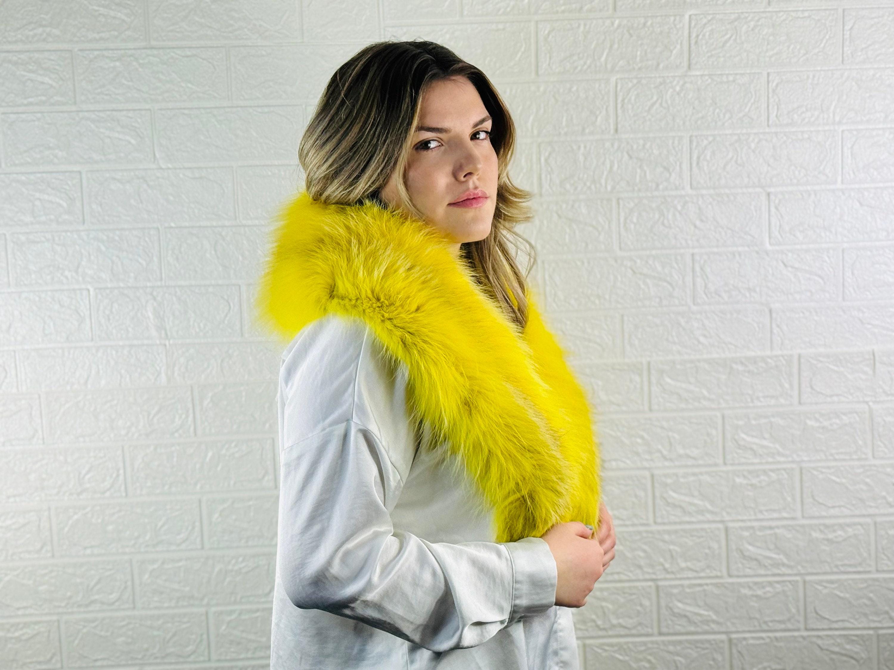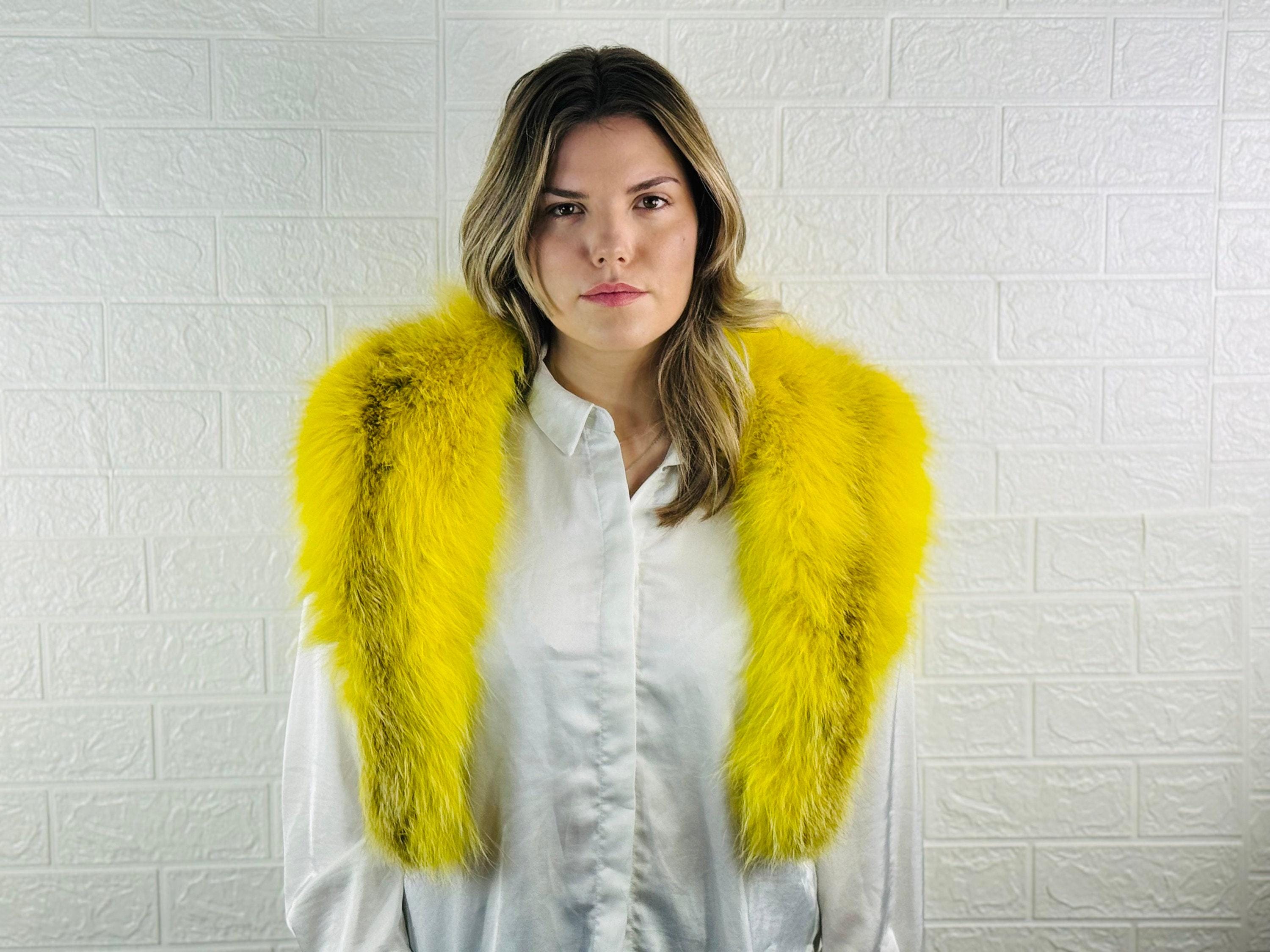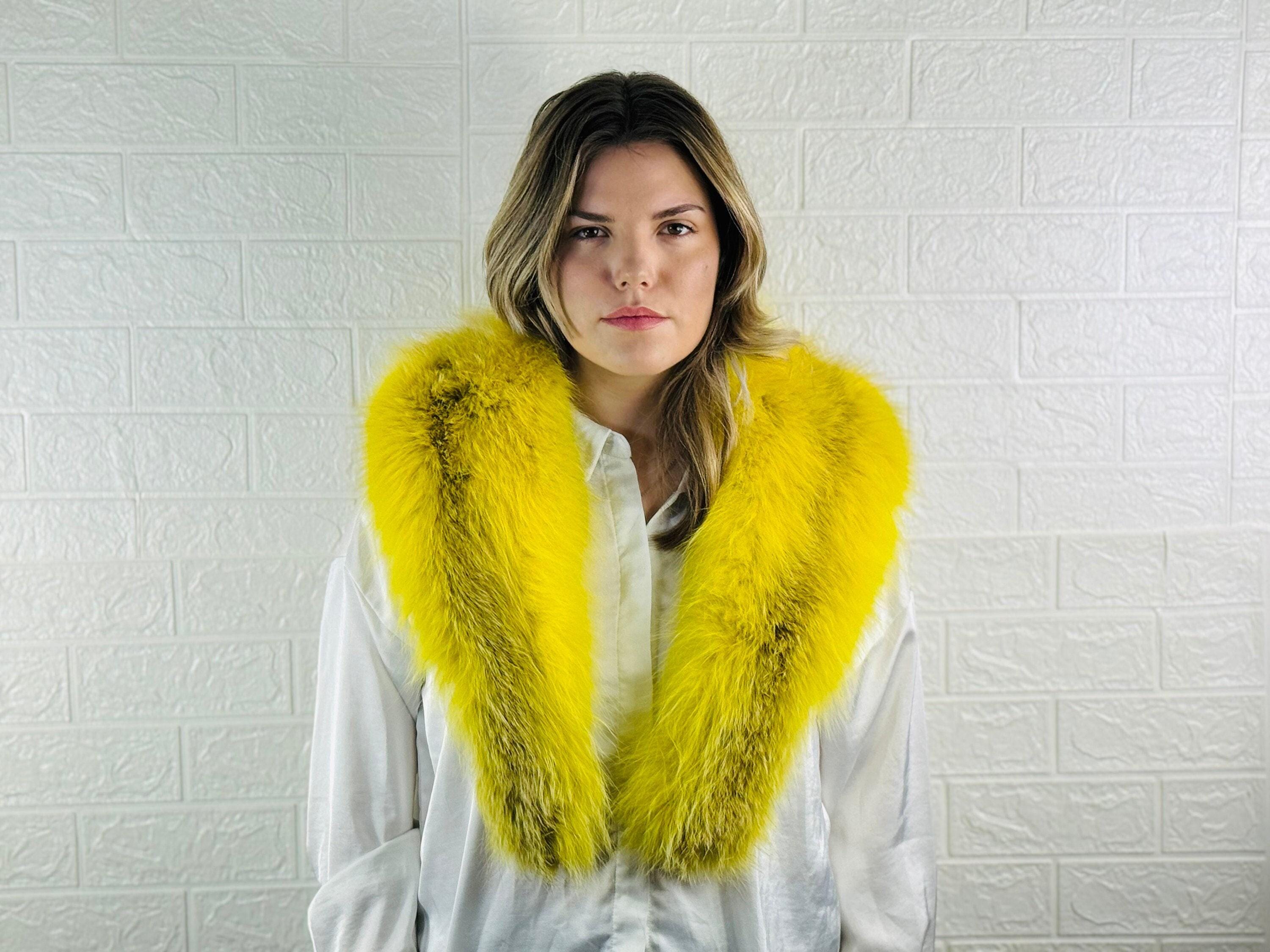Made with yellow full skin fox pelt fur, this detachable and fluffy collar scarf is versatile and stylish. It can be worn as a neckwarmer, wrap, or stole—keeping you both cozy and fashionable all winter long. The perfect gift for her!
