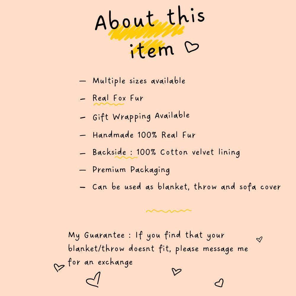 Natural fur fox possesses numerous health benefits: it promotes restful sleep, is soothing, thanks to warmth promotes blood circulation, provides relief to pressure points and achy limbs, is safe for kids and pets, is kind to skin, and is bacteria repellent. Also serves as a great pet bed and throw.