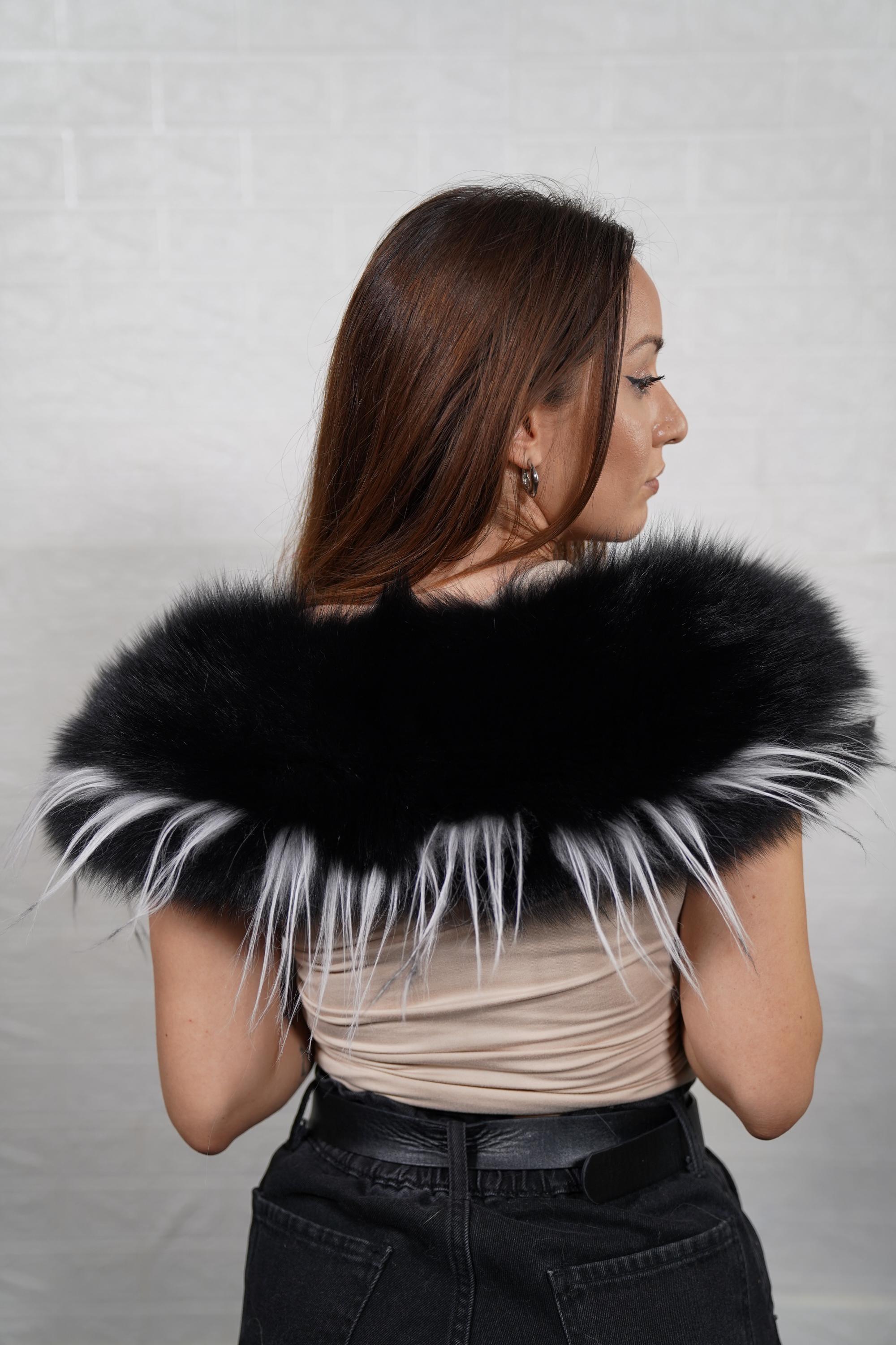 Searching for a statement accessory that will stand out? This black with white lines fox fur collar scarf is for YOU.
