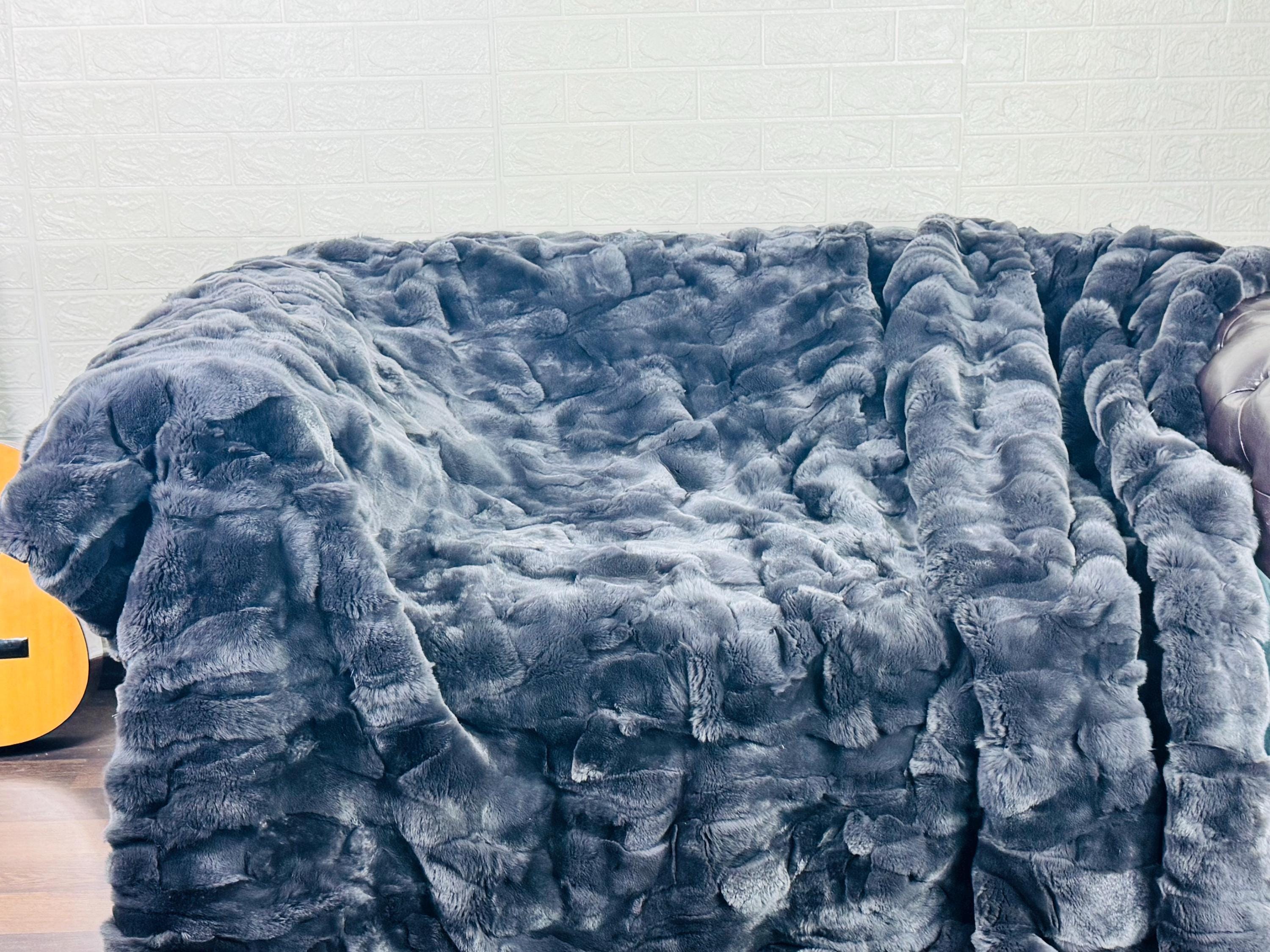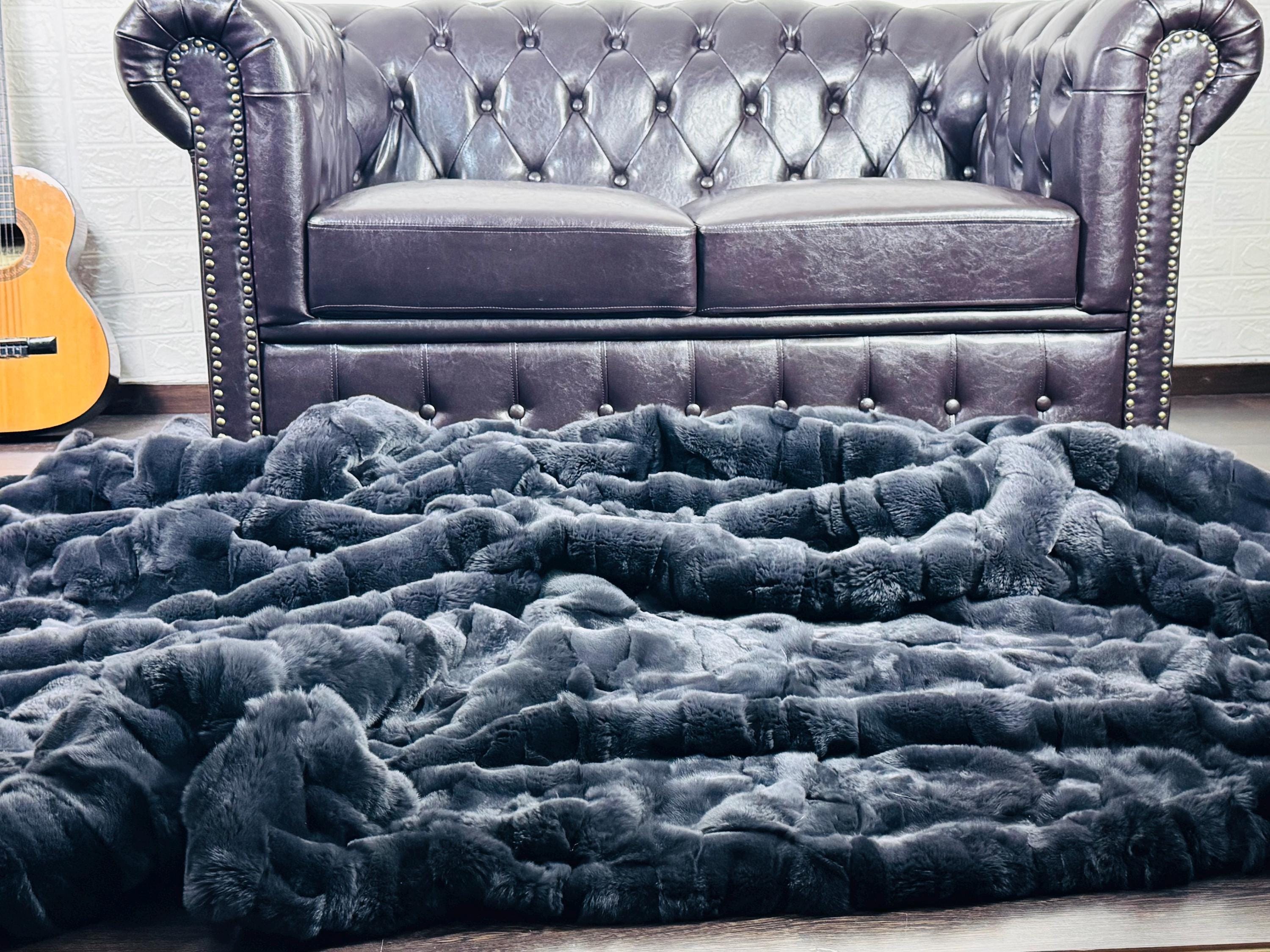Handmade Real Dark Gray Color Rex Rabbit Fur Blanket that can be used as a throw as well. Perfect for Bedspread or Sofa Cover.