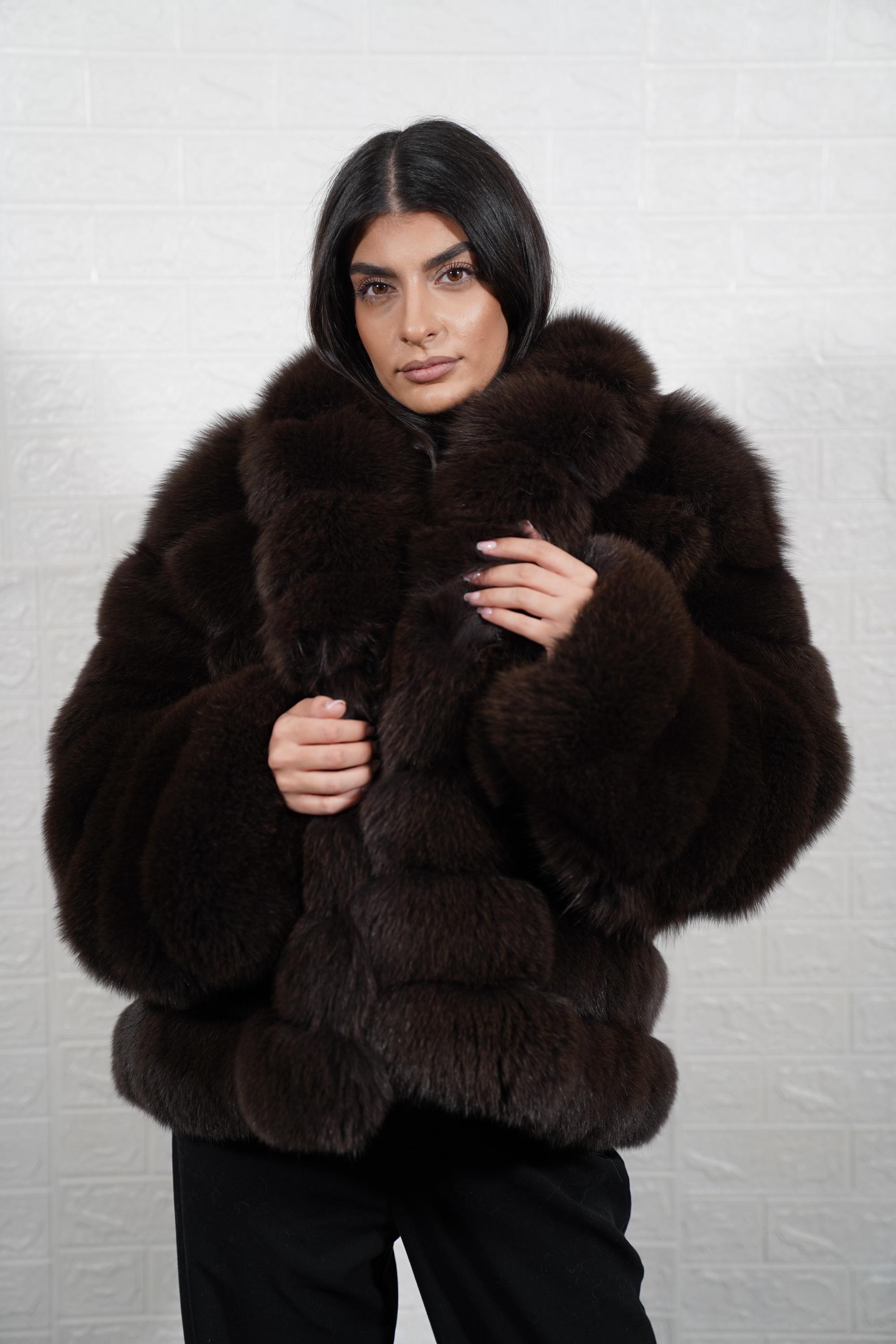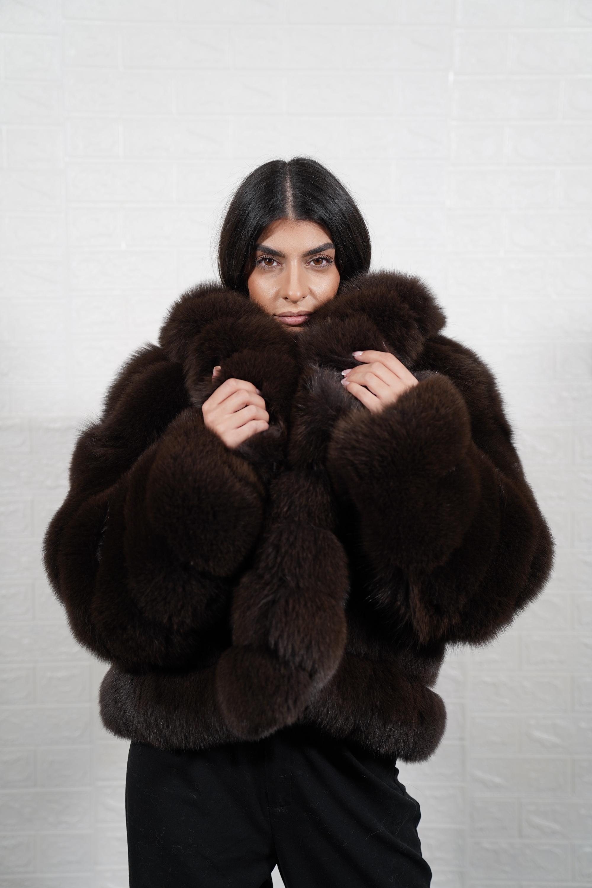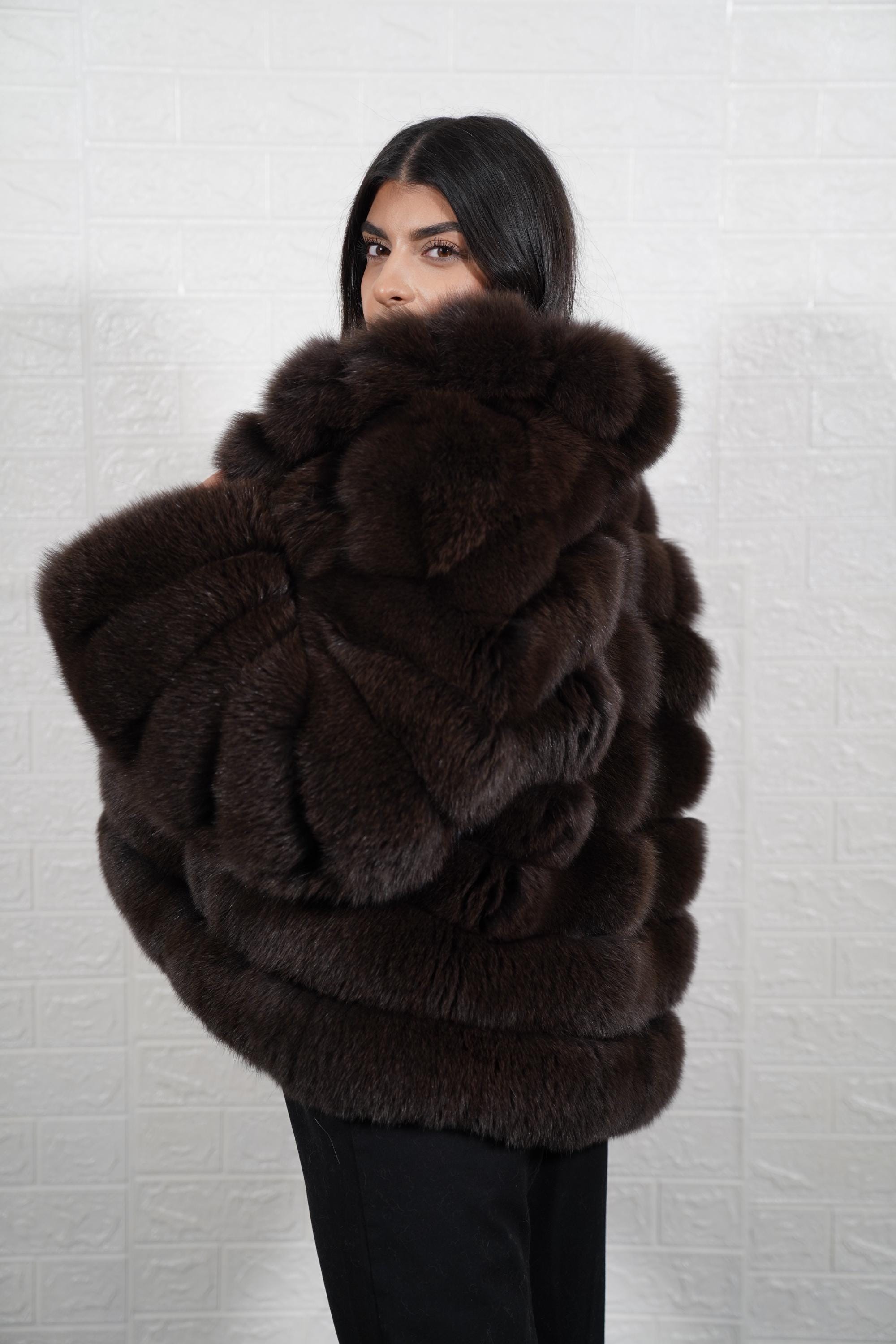 Add bold luxury to your wardrobe. Order your Brown Fox Fur Jacket Coat with Leather Lines today. ✨