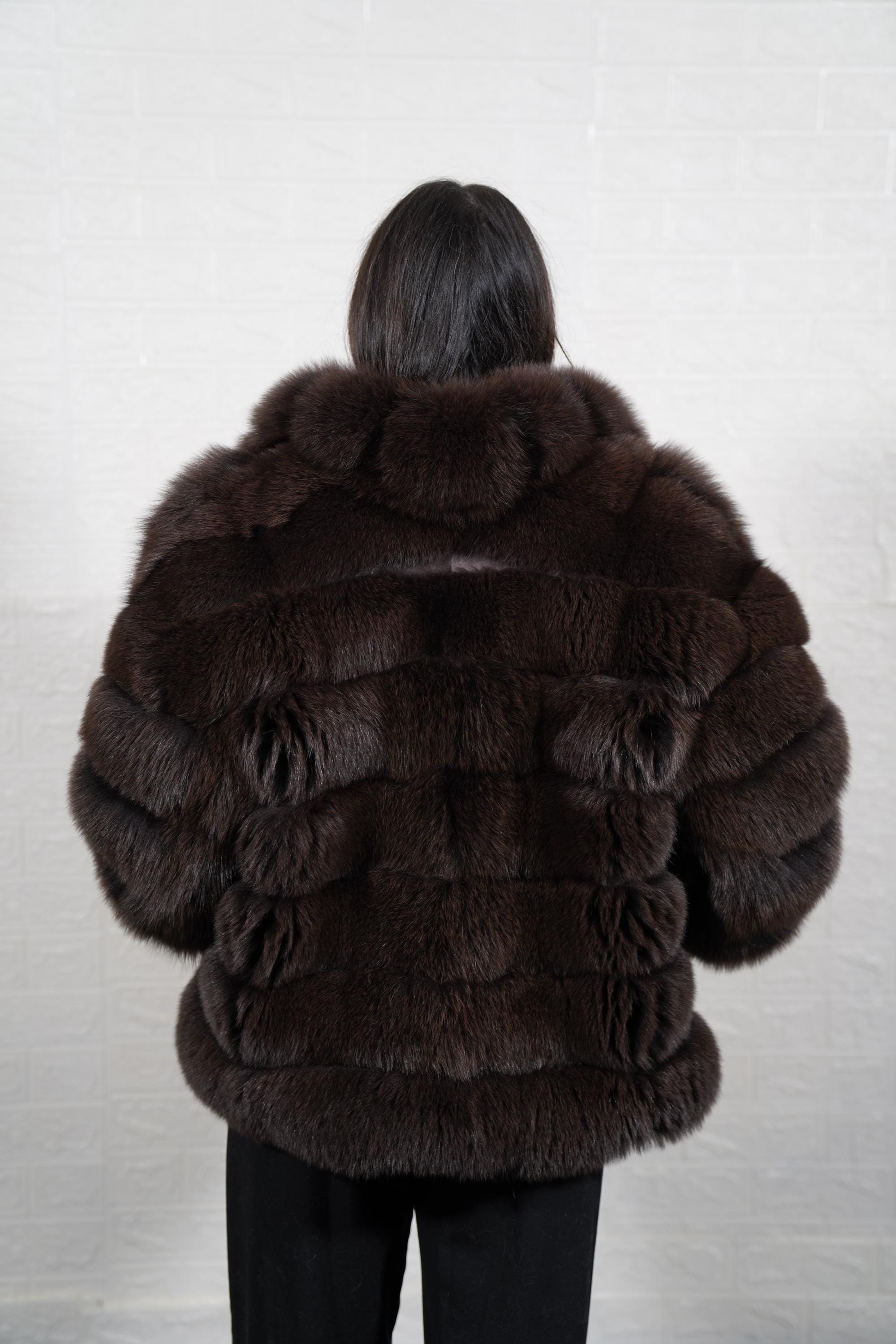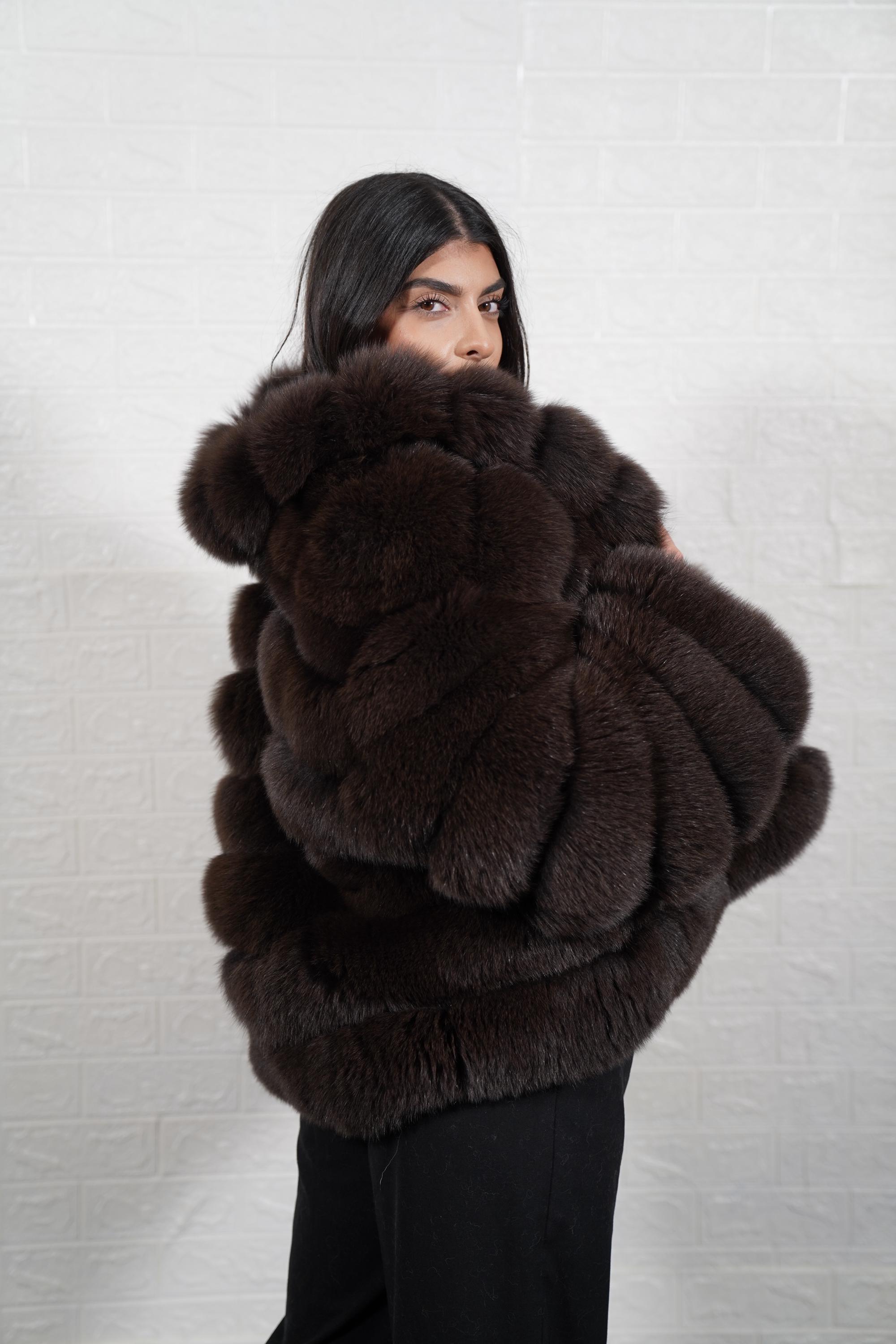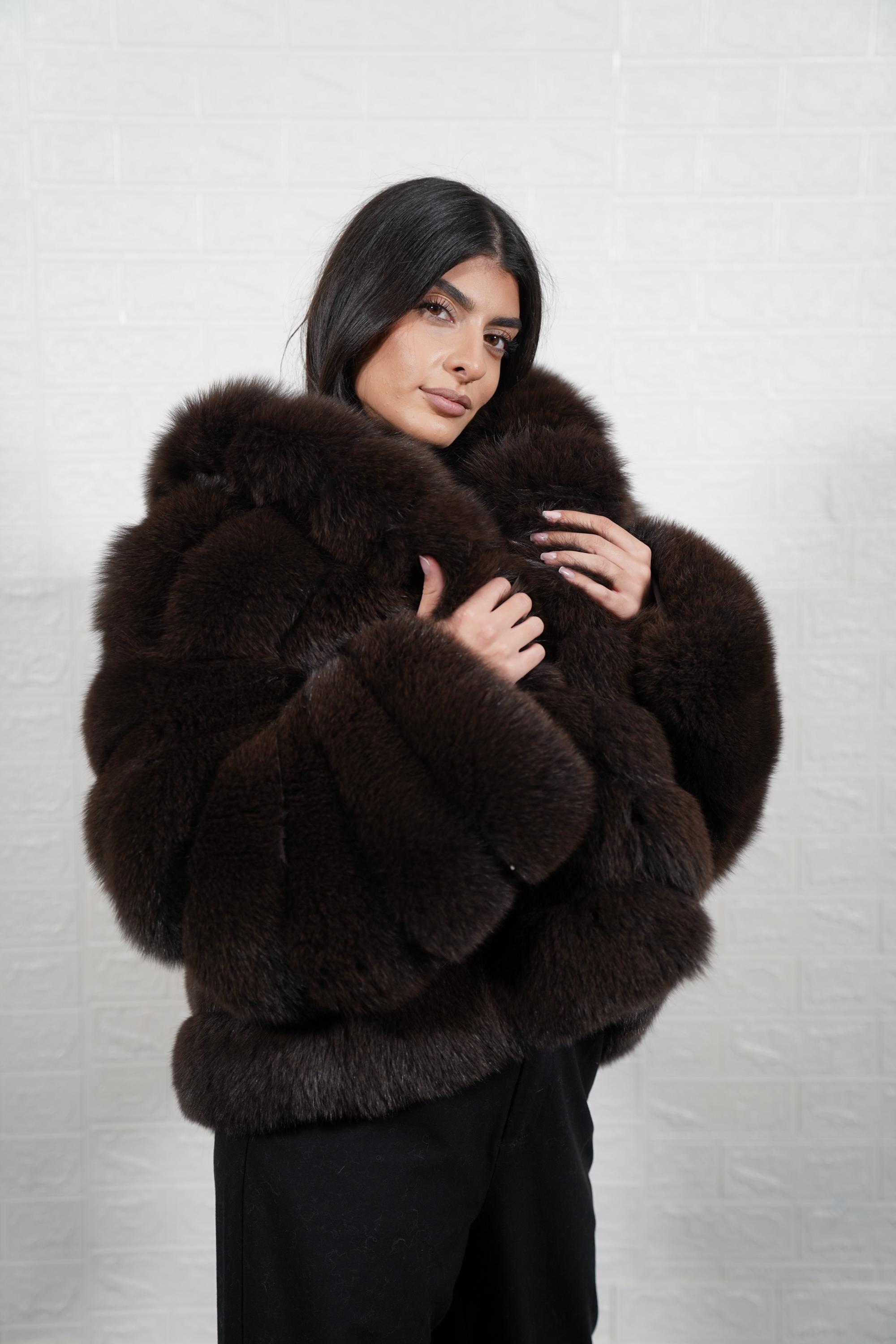 Add bold luxury to your wardrobe. Order your Brown Fox Fur Jacket Coat with Leather Lines today. ✨