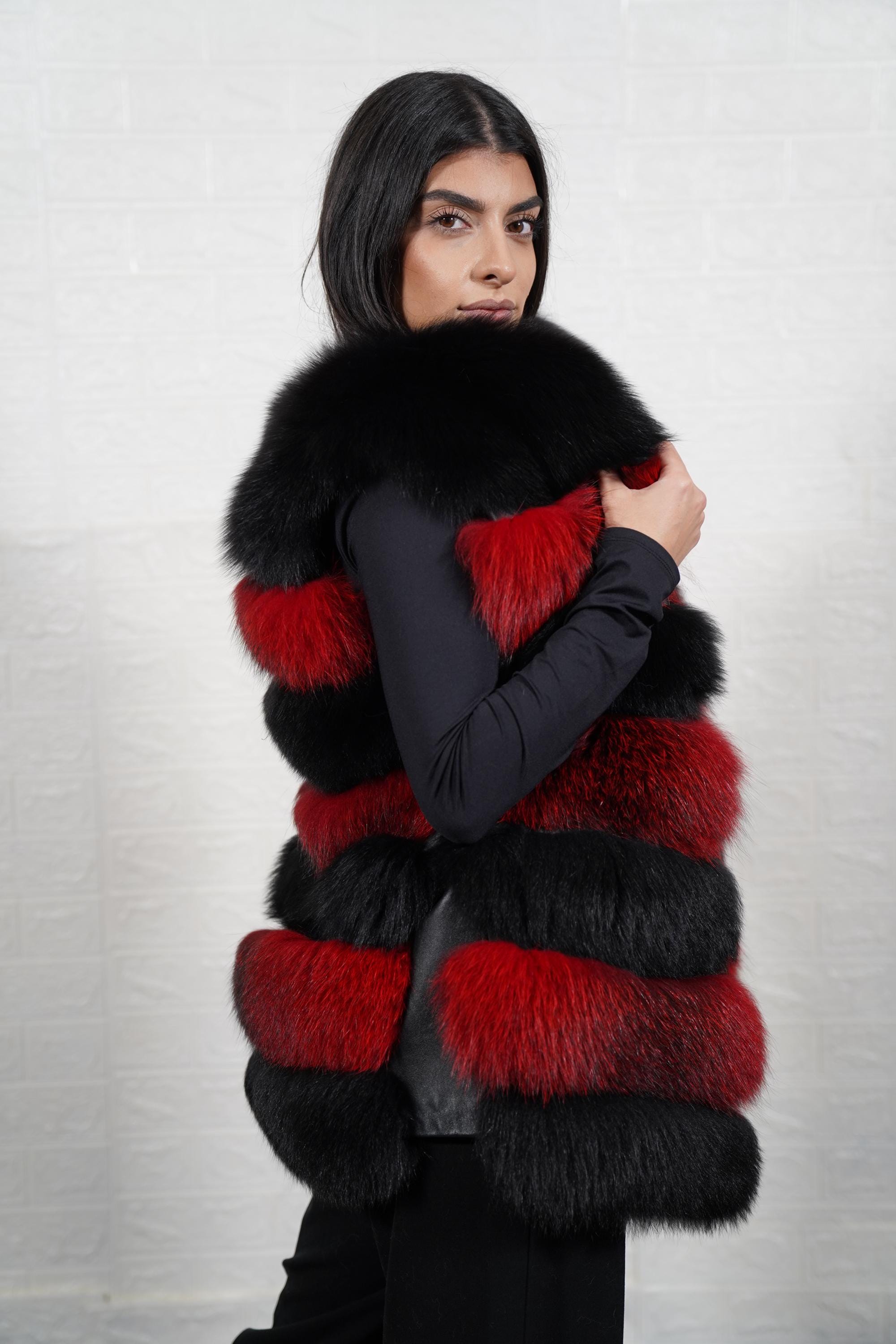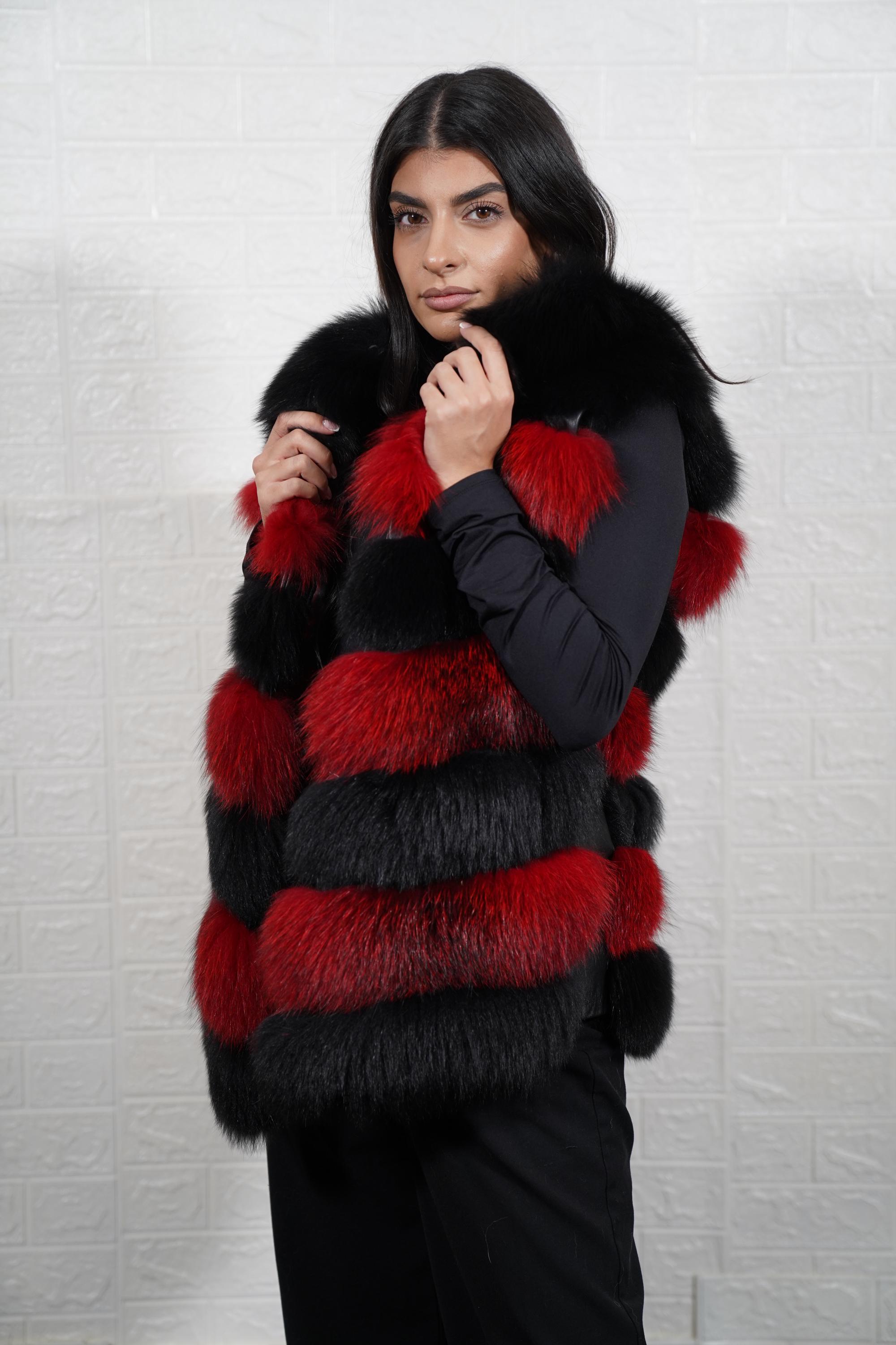 Add bold luxury to your wardrobe. Order your black red fox fur vest jacket full skin today. ✨