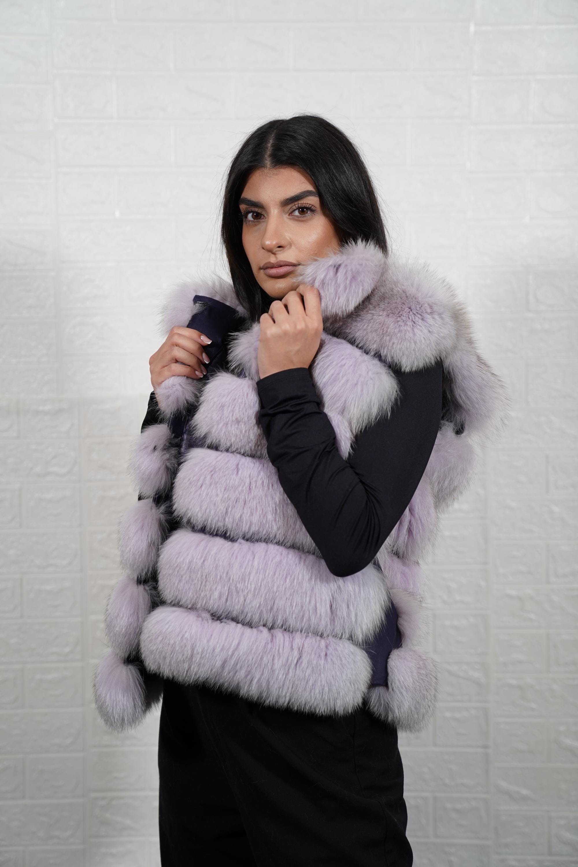 Add pastel luxury to your wardrobe. Order your light purple fox fur vest jacket full skin with leather lines today. ✨