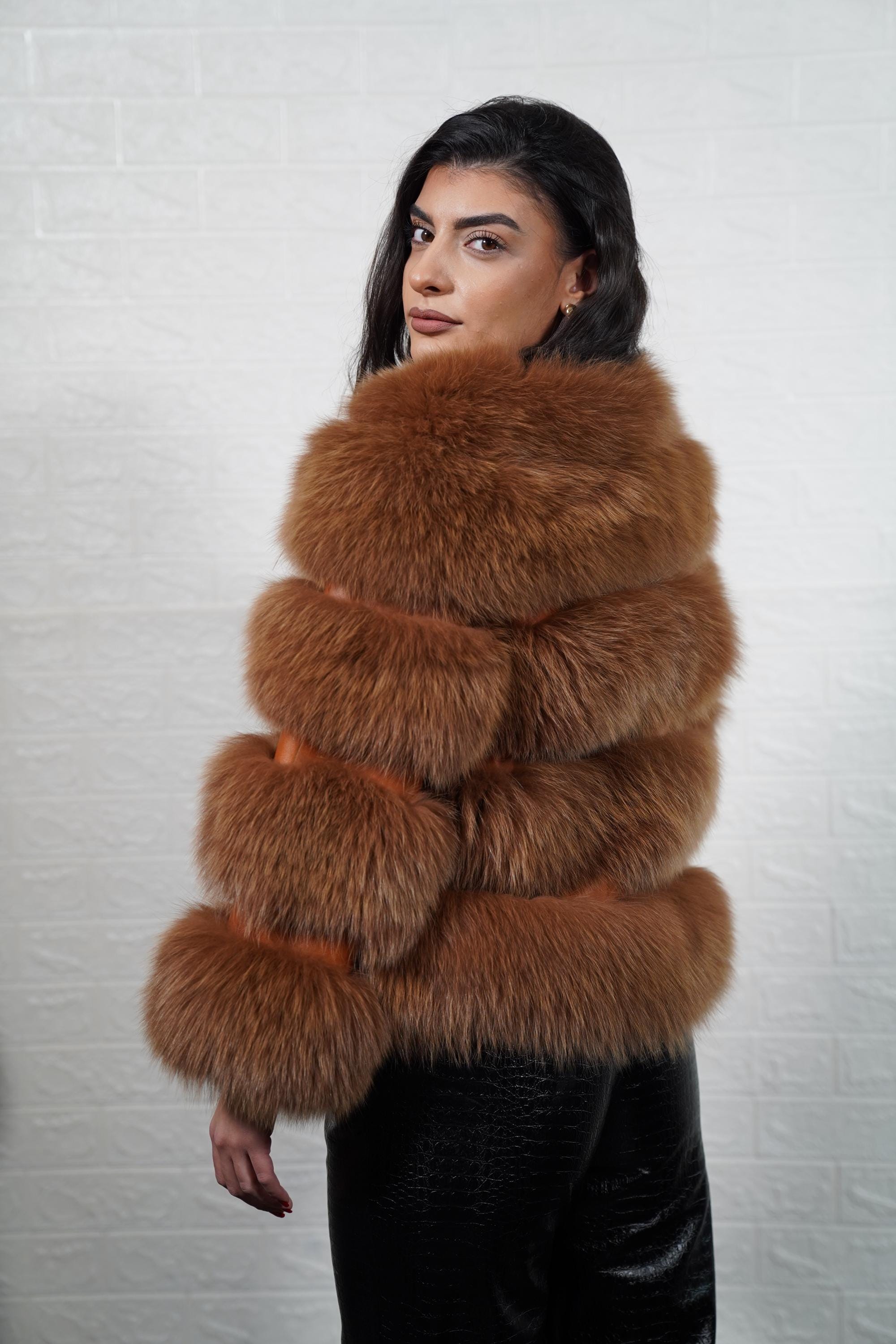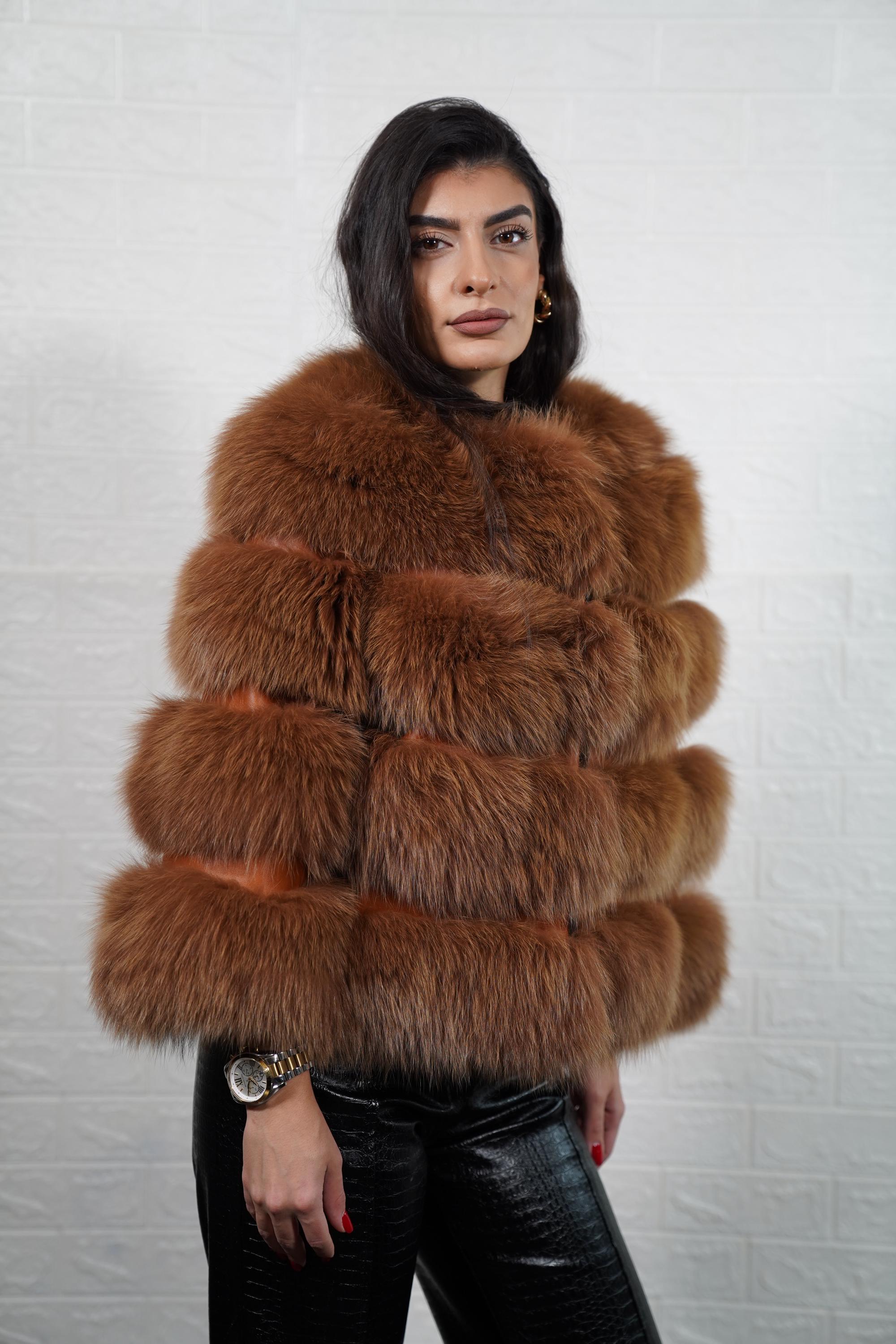 Add modern luxury to your wardrobe. Order your camel brown fox fur jacket full skin with leather lines today. ✨