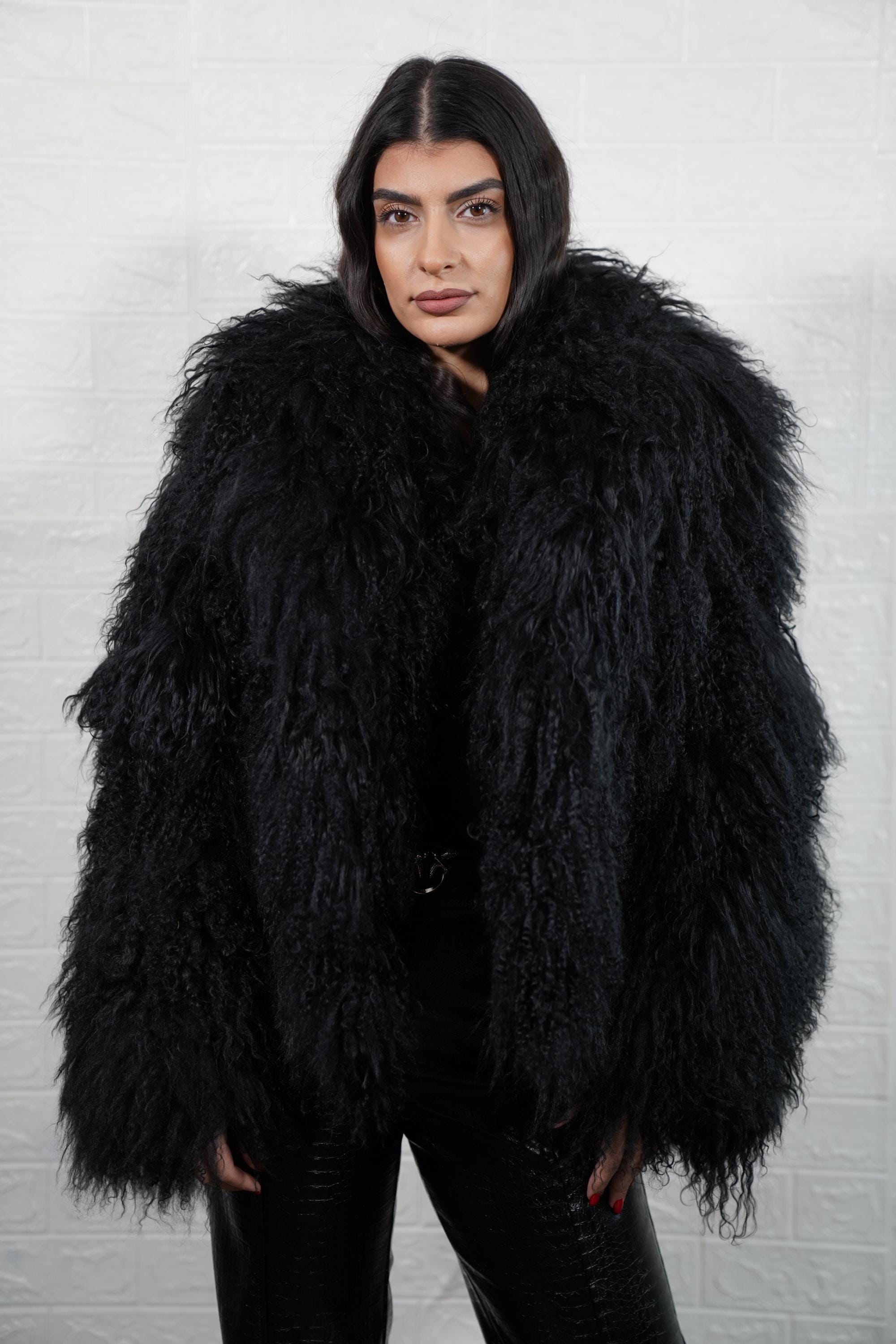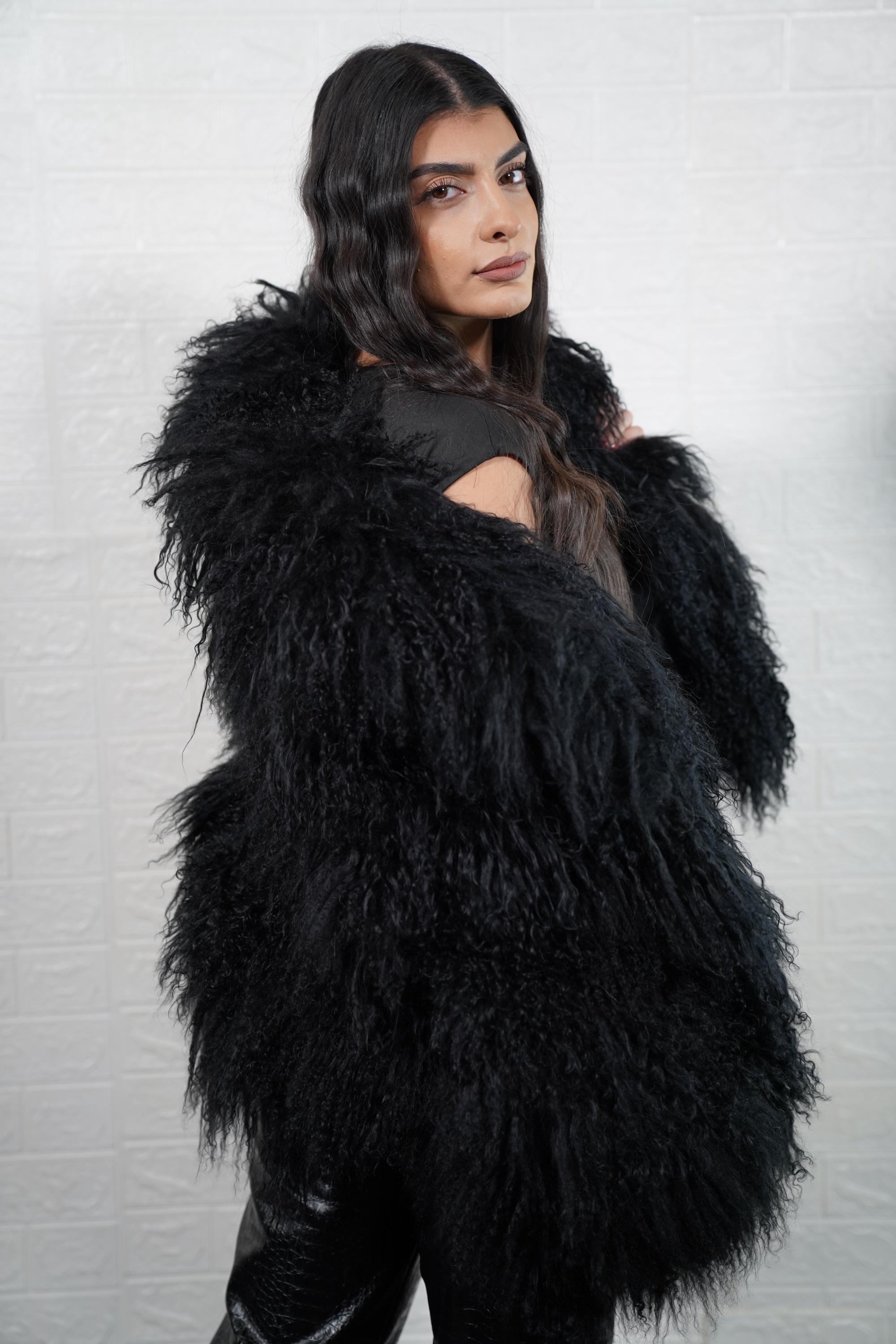 This unique jacket coat features plush, fluffy black Mongolian sheepskin with full skin pelts for a voluminous, textured look. The luxurious fur, premium lining, and tailored fit provide warmth, comfort, and a one-of-a-kind fashion statement.