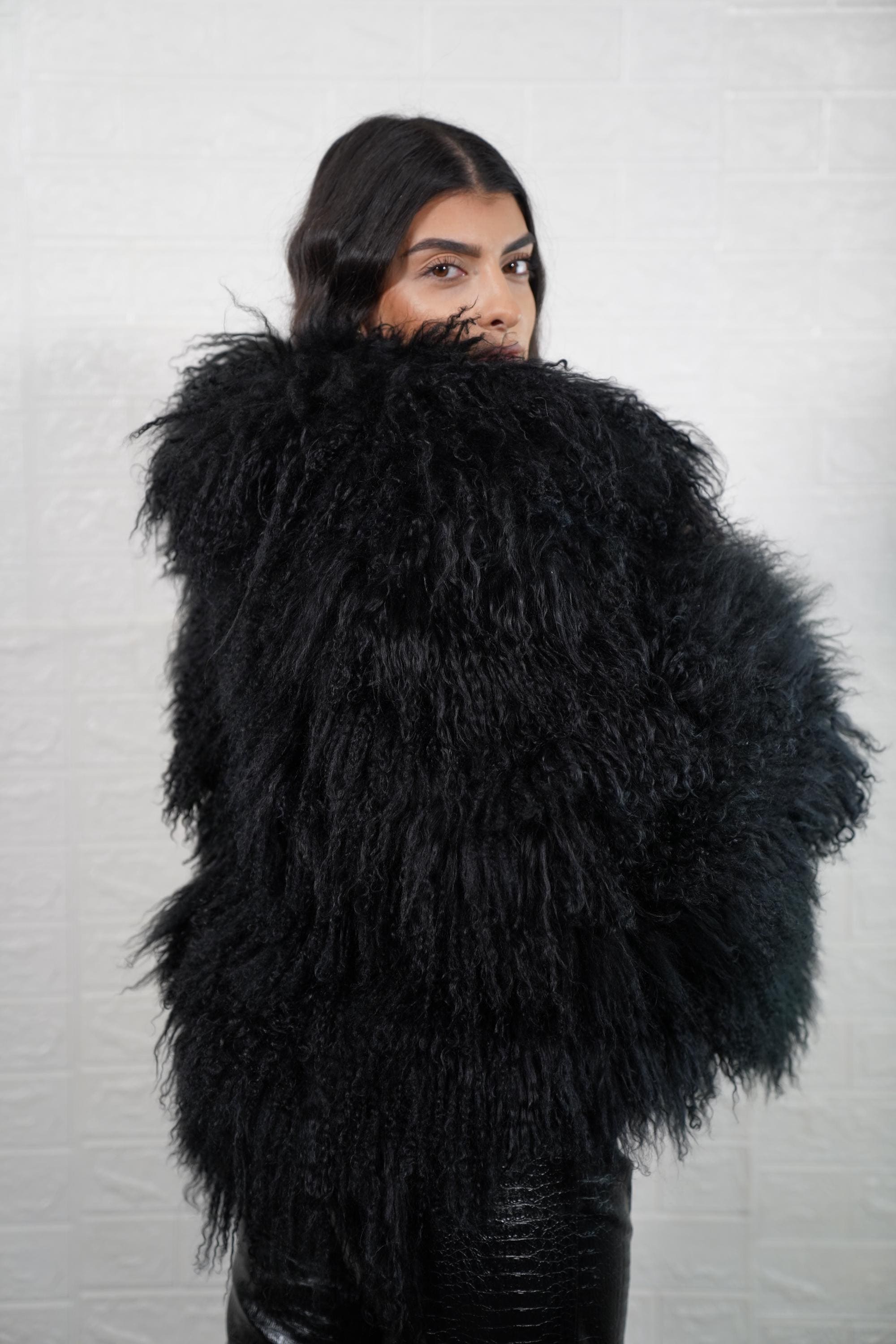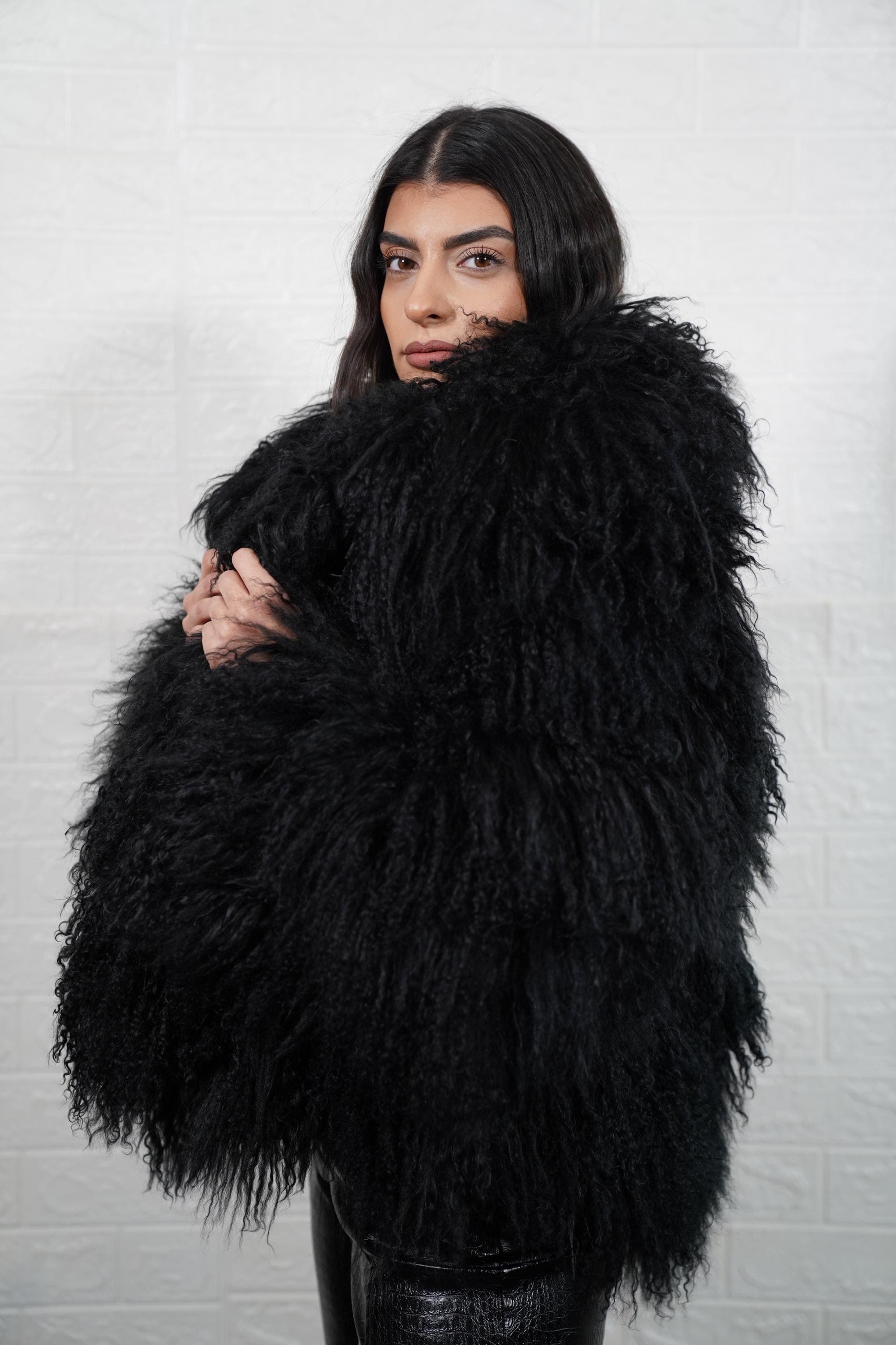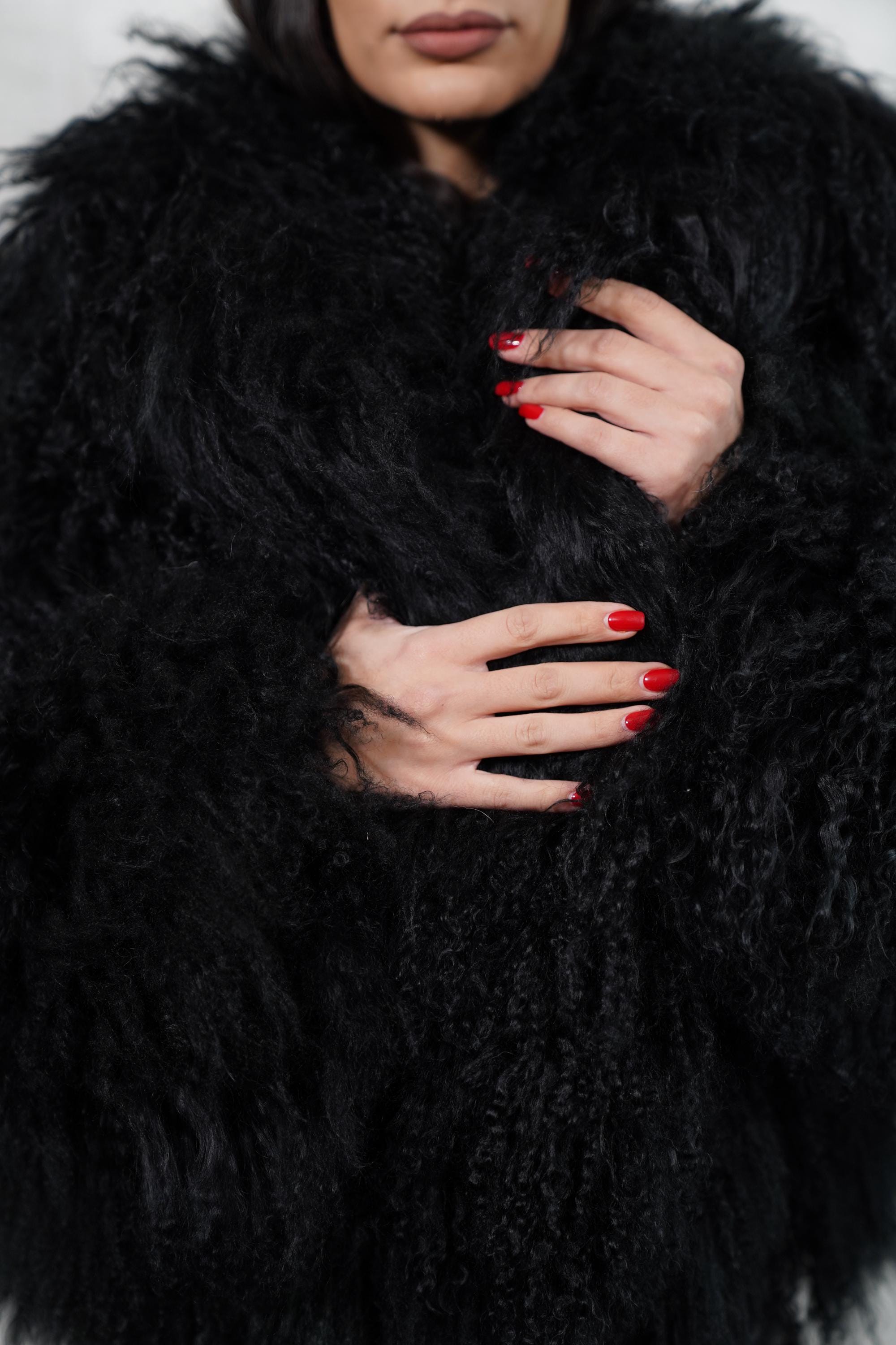 ⭐️⭐️⭐️⭐️⭐️ "This black Mongolian sheepskin coat is so fluffy and soft! The volume and texture are stunning. I get compliments every time I wear it. Highly recommend!"
