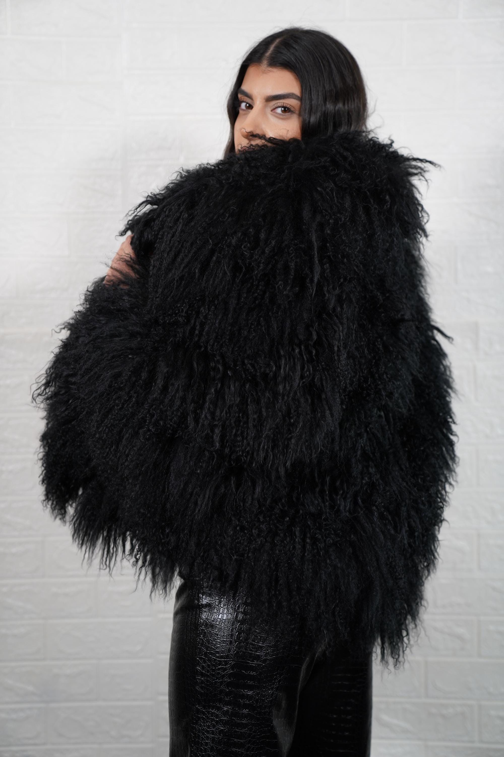 ✨ HANDMADE BLACK MONGOLIAN SHEEPSKIN FLUFFY JACKET COAT FULL SKIN – PREMIUM CRAFTSMANSHIP