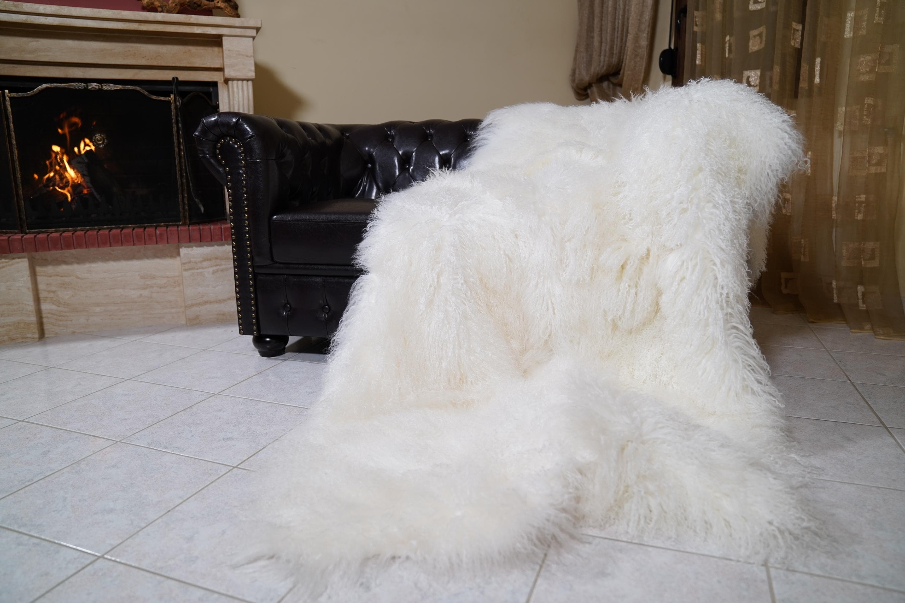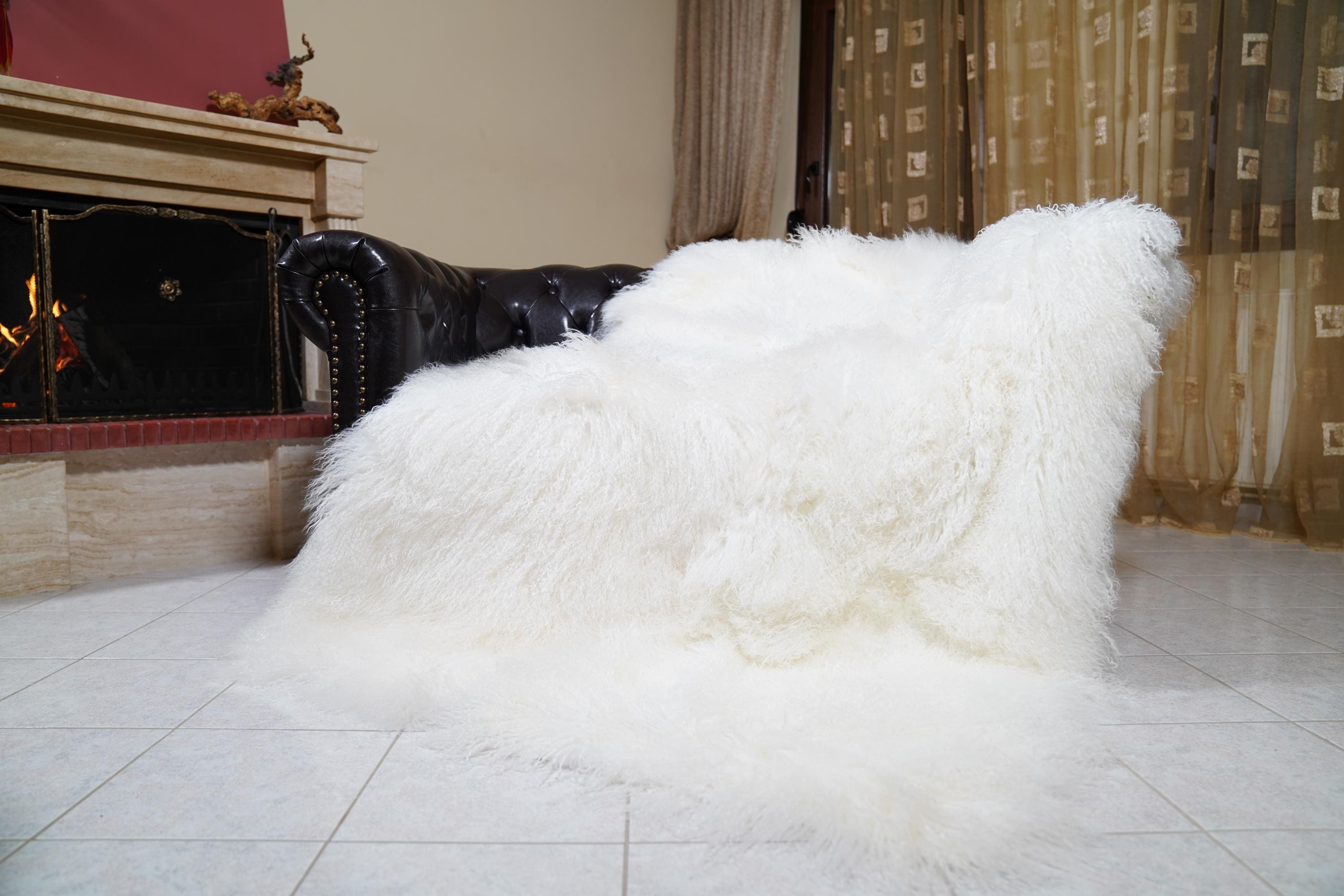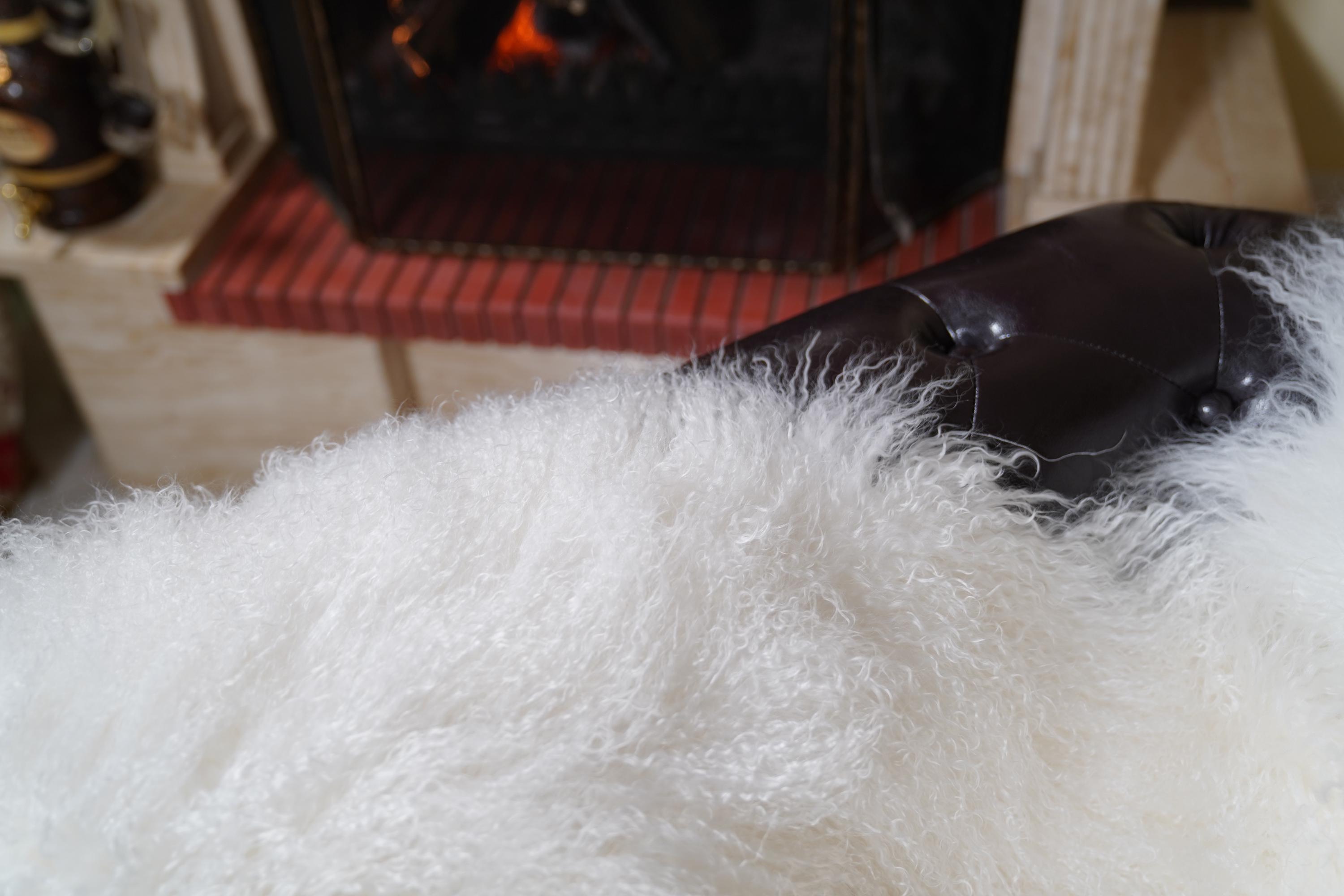 Experience the ultimate in softness and warmth with genuine Mongolian sheepskin. The full skin pelts provide maximum volume and natural elegance, while the pure white color brightens any space. Each piece is one-of-a-kind, reflecting the artistry and heritage of Greek fur craftsmanship.