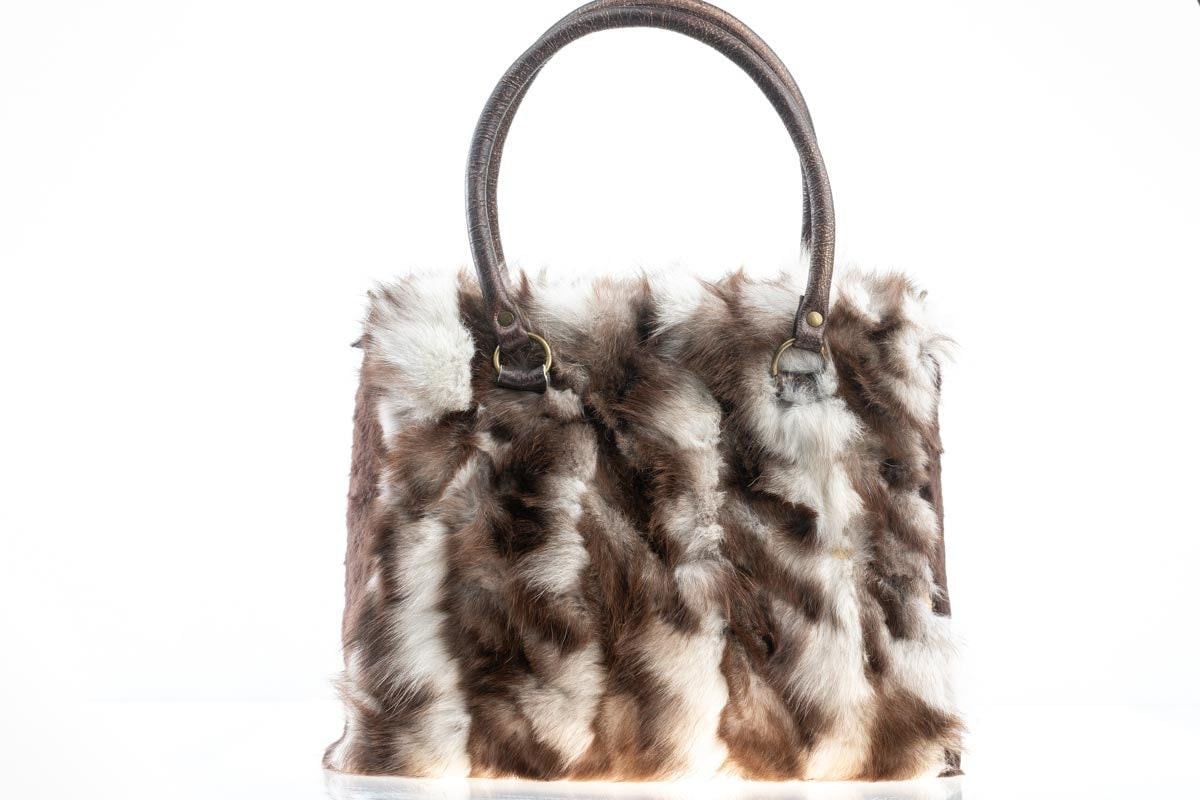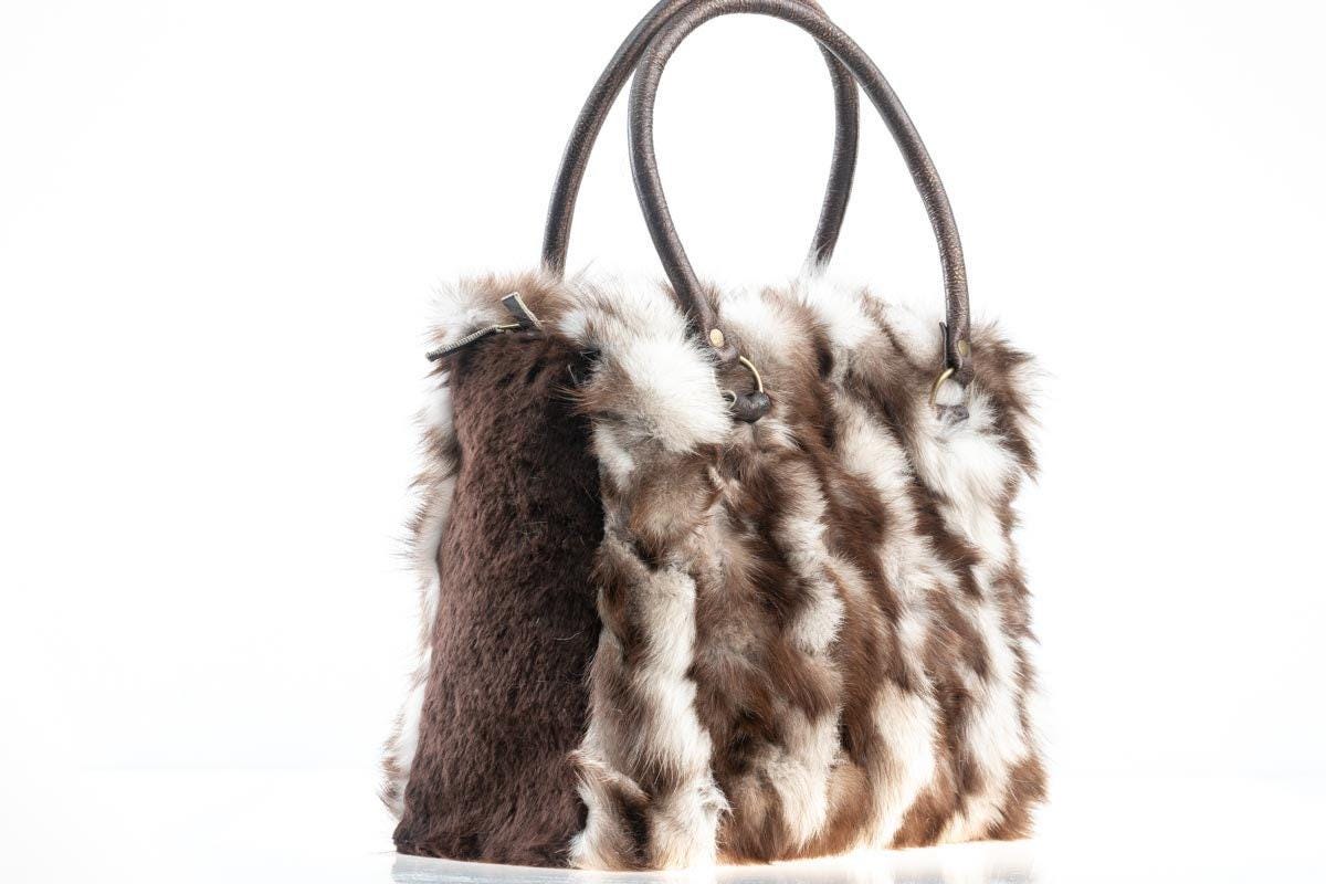 and white. The details like strap handles and sides are made of leather. This fur bag is perfect